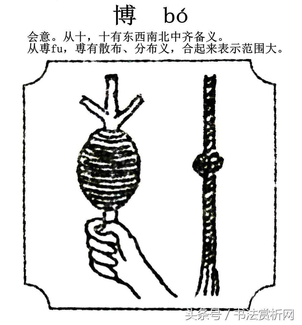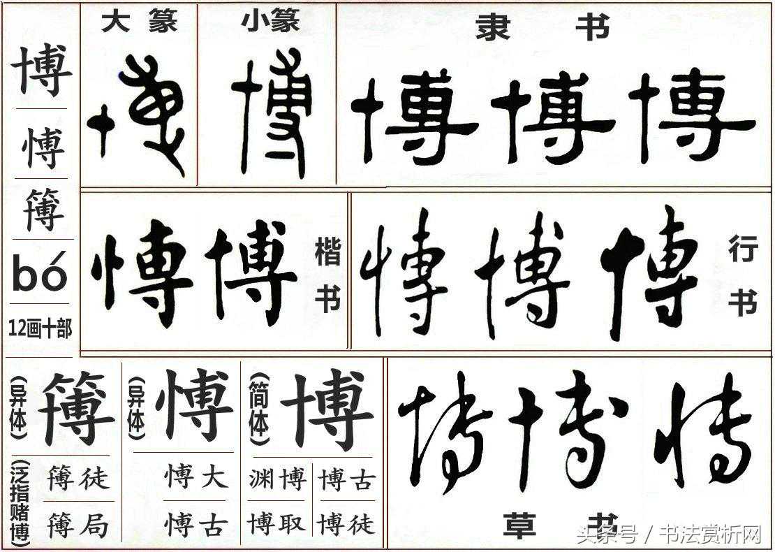 书法赏析网的一日一字一图,旨在收集、整理、梳理、整合并统一编辑汉字的五体字形及词解。由于汉字博大精深,绝对做不到处处正确无误,但绝对会努力去做到规范,并极力向正确方向靠拢,希望这些努力,能给大家带来一个新的清新的感觉或者一点小小的收获,谢谢! 【博bó】字的正确五体字形及词解: 一日一字一图博字五体正确书写 博bó,汉语常用字。 博字图形字 博字田字格 博字米字格 博字笔顺--动画演示图 博字笔顺--静态演示1 博字笔顺--静态演示2 博字基本信息: 中文名称:博 外文名称:broad/rich 拼音:bó 吉凶:吉 五行:水。(以孩子的八字和五行的喜忌来给自己的孩子取名字,每个汉字都是和五行相对应的,因而五行缺什么就会在名字中找到该属性的字来补足) 博字一般出现在男性名字。 异体:愽、簙 部首:十 部外笔画:10 笔画数2+10=12 笔顺:一丨一丨フ一一丨丶一亅丶 笔顺编码:横,竖,横,竖,横折,横,横,竖,点,横,竖钩,点。 词性:形容词,动词,名词 造字法:形声兼会意 仓颉:JIBI 注音:ㄅㄛˊ 五笔:FGEF 统一码:535A 四角号码:43042 字级:一级字,常用字 规范汉字编号:2521 笔顺编号:121251124124 平水韵:入十药 郑码:EDFD 书写提示: ❷"十",短横在田字格横中线上方。 ❸"尃","甫"窄"寸"宽。 ❹"甫"的第二笔竖在田字格竖中线左侧,第三笔横折的竖段略向左拐,收于横中线。 ❺"寸"的长横从"十"侧起笔,在田字格横中线下方,左右两端都宽于上部,末笔点在竖中线右侧。 注:博字有两个异体字,一个是愽,一个是簙。异体"愽"局限义项:丰富、通晓、大及其引申义,异体"簙"局限义项: 1、簙 拼音:bó 部首:竹 笔画:18 词性:动词 结构:上下结构 造字法:形声 笔顺编码:撇,横,点,撇,横,点,横,竖,横,竖,横折,横,横,竖,点,横,竖钩,点 五笔:TFGF 2、愽 拼音:bó 部首:忄 五笔:NGEF 总笔画:13 笔顺编码:点,点,竖,横,竖,横折,横,横,竖,点,横,竖钩,点 博字的异体字 说文解字 博文言版《説文解字》:博,大通也。从十从尃。尃,布也。(补各切)。 博白话版《说文解字》:博,广大而精通。字形采用“十、尃”会义。尃,分布。 簙文言版《説文解字》:簙,局戲。六箸十二棊也。从竹博聲。古者烏胄作簙。 簙白话版《说文解字》:簙,棋戏。六根箭、十二颗棋子。字形用“竹”作边旁,用“博”作声旁。古昔时代叫“乌胄”的人发明了“簙”这种游戏。古代棋戏。 说文解字〖原文〗 大通也。从十从尃。尃,布也。补各切(bó) 〖注释〗 ①大通也:桂馥《说文解字义证》:"当是大也、通也。《玉篇》:大也、通也。'" ②从十从尃:王筠《说文解字句读》:"四方中央无不尃也。" 〖译文〗 广大,精通。由"十"、"尃"会意,尃是分布的意思。 说文解字 说文解字注 大通也凡取于人易为力曰博,《陈风》郑笺:交博好也。 从十博。会意。 尃,布也。亦声。补各切。五部。 说文解字注 康熙字典 《唐韵》:补各切。《集韵》《韵会》《正韵》伯各切,并邦入声。《说文》:大通也。从十尃。尃,布也,亦声。《徐曰》:十者,成数也。《玉篇》:广也,通也。《增韵》:普也。《荀子·修身篇》:多闻曰博。 又《韵会》贸易也。古琴曲有不博金。 又六博,局戏。《家语》:君子不博,为其兼行恶道故也。 又州名。《韵会》:春秋,齐之聊摄随为博州。 又姓。《韵会》:古有博劳,善相马。 康熙字典 广韵 广也。大也。通也。从十、尃。亦州名,春秋时齐之聊摄也,秦为东郡地,隋为博州,因博平县以名焉。又姓,古有博劳,善相马也。补各切。二十。 宋本--广韵 汉字释义 《博》字字形权威解释考释:在甲骨文及金文未出土时大多解释都根据说文解字来参考,比如《玉篇》、《广雅》,而说文则根据小篆讹变及简化释《博》字为大、通也,从十,从尃,尃,布也。《小徐本说文》带也声二字,后世书籍及字典均依说文而释,其实是错误的,当新世纪甲骨文和金文大量的出土,《说文解字》之书逐渐受到了局限,因为当初许慎并为见过甲骨文和大部分金文,他所解释的全是小篆字形,小篆是秦始皇统一天下后实行文同书而改革的字,难免有许多讹变,如今大量甲骨文和金文出土来弥补小篆的不足之处,也揭开了当时说文解字的局限。 《博》字从金文字形分析和考释得出结论,《博》是形声字,并非会意字,从十,尃(fū)声。“十”在金文中是殷商古“盾”字的象形文写法,出土殷商盾痕的形状正做此形,可一证,殷商青铜器铭文族徽标志里的盾牌也做此形,可二证,西周中期后象盾形的“十”逐渐线条画后简写成“十”形,并非数字之“十”,从类似偏旁《古》、《戎》二字所从的“十”同时期也演化成“十”形并可证,“尃”为声旁,《博》的异体字或者从“干”,尃(fū)声,或从“戈”,尃(fū)声,均为“博”字,在金文中偏旁同类或者意义同类均可互换义符比如,牢房的《牢》,在甲骨文中有从羊、有从马、也有从牛的,这样的偏旁是同类都是指畜生,所以可以更换,《博》字所从的偏旁义符“十、干或者戈”也同为兵器,故“博”字在金文中的偏旁也可以互换,从金文铭文用法上分析与《博》字有关的全是征伐、战争有关的意义,本义当为“搏斗”、“抵抗”、“对抗”,之义,并非说文里解说的“大、通也”所以《博》字本义是:搏斗,搏击,后引申为,获取,得到。 注:在金文中未见从手,尃声的《搏》字,先秦以前文献中的“博”字用法均为动词义为“六博”一种军事战争棋类,