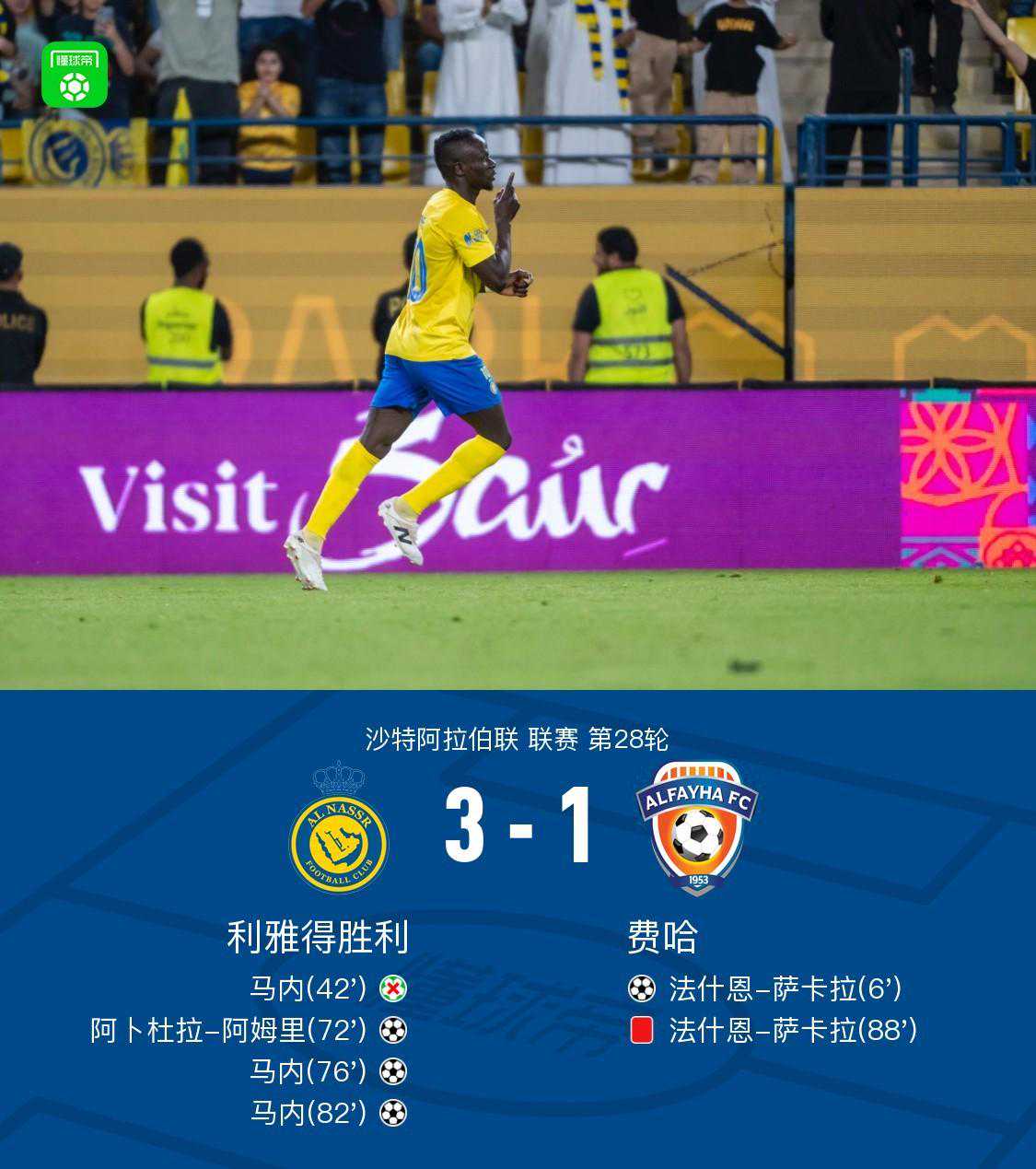 北京时间4月19日23:00,沙特阿拉伯联赛第28轮,利雅得胜利主场迎战费哈。上半场萨卡拉左路内切小角度破门先拔头筹,拉波尔特凌空扫射造险,加奈姆造点,马内主罚将球踢飞;下半场特莱斯角球开出,阿姆里头球破门帮助球队扳平比分。马内停球转身凌空破门一气呵成,利雅得胜利2-1反超比分,随后马内左路一条龙连续精彩摆脱完成破门锁定胜局。最后阶段进球功臣萨卡拉由于故意推人犯规被红牌罚下。最终,利雅得胜利3-1逆转战胜费哈。 第7分钟,萨卡拉左路内切小角度破门,费哈1-0利雅得胜利 第42分钟,加奈姆造点,马内主罚将球踢飞 第73分钟,特莱斯角球开出,阿姆里头球破门,利雅得胜利1-1费哈 第76分钟,一气呵成!马内停球转身凌空破门,利雅得胜利2-1反超比分 第82分钟,独闯龙潭!马内左路连续摆脱完成破门,利雅得胜利3-1费哈 第88分钟,不理智!萨卡拉故意推人犯规被红牌罚下 双方球员就位,比赛马上开始 第7分钟,萨卡拉左路内切小角度破门,费哈1-0利雅得胜利 第11分钟,马内禁区内倒地,主裁判没有吹罚点球 第26分钟,拉波尔特禁区内一脚凌空扫射,斯托伊科维奇将球挡出 第34分钟,马内禁区内再次倒地,与门将相撞后表情十分痛苦 第42分钟,加奈姆造点,马内主罚将球踢飞 第53分钟,越位在先,萨卡拉小角度破门被吹无效 第62分钟,加里卜禁区内鱼跃头球攻门,球稍稍偏出 第67分钟,错失机会!萨卡拉禁区内尝试摆脱射门被封堵 第69分钟,恩瓦凯梅左路起脚射门,球击中立柱弹出 第73分钟,特莱斯角球开出,阿姆里头球破门,利雅得胜利1-1费哈 第75分钟,表现神勇!斯托伊科维奇两连扑门线救险 第76分钟,一气呵成!马内停球转身凌空破门,利雅得胜利2-1反超比分 第82分钟,独闯龙潭!马内左路连续摆脱完成破门,利雅得胜利3-1费哈 第88分钟,不理智!萨卡拉故意推人犯规被红牌罚下 利雅得胜利首发:26-奥斯皮纳,15-特莱斯,77-布罗佐维奇,27-拉波尔特,4-穆罕默德-法蒂勒,10-马内,25-奥塔维奥,2-苏丹-加奈姆,17-阿卜杜拉-海巴里,5-阿卜杜拉-阿姆里,29-阿卜杜勒拉赫曼-加里卜 替换下场:87分钟77-布罗佐维奇,46分钟4-穆罕默德-法蒂勒,90+5分钟10-马内,86分钟29-阿卜杜勒拉赫曼-加里卜 上场替补:87分钟19-阿里-哈桑,86分钟46-阿卜杜勒阿齐兹-阿利瓦,46分钟30-梅沙里-内梅尔,90+5分钟55-阿卜杜勒阿齐兹-法拉杰 替补:24-穆罕默德-纳赫利,36-拉赫德-纳贾尔,12-纳瓦夫-布歇尔,49-阿瓦德-阿曼,37-法里斯-阿凡迪 费哈首发:88-斯托伊科维奇,13-齐米罗特,9-恩瓦凯梅,33-侯赛因-舒韦什,8-阿卜杜勒拉赫曼-萨法里,3-科南,77-萨比里,17-法什恩-萨卡拉,4-萨米-海巴里,2-莫克尔-拉希迪,29-纳瓦夫-哈尔廷 替换下场:84分钟13-齐米罗特,78分钟9-恩瓦凯梅,78分钟8-阿卜杜勒拉赫曼-萨法里,90+1分钟77-萨比里,78分钟29-纳瓦夫-哈尔廷 上场替补:84分钟37-里卡多-里勒,78分钟27-苏丹-马达什,78分钟6-沙特-齐丹,78分钟66-拉坎-卡比,90+1分钟45-萨特姆-莱希亚尼 替补:11-哈立德-哈比,98-穆哈纳德-凯德希,1-阿卜杜勒拉乌夫-杜盖勒,62-胡萨姆-马杰拉希