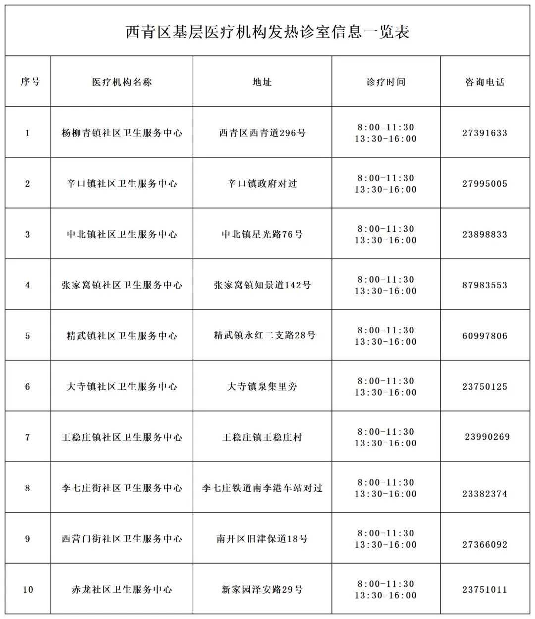 为做好发热患者医疗保障工作 东丽区、西青区、北辰区、 蓟州区、宝坻区、静海区 相继公布了 基层医疗机构发热诊室名单、咨询服务电话 东丽区 广大居民朋友: 随着奥密克戎病毒致病性的减弱,防疫政策不断优化调整,做好自己健康的第一责任人尤为重要。据权威专家介绍,90%以上新冠感染者都表现为无症状和轻型,很少发展成肺炎,绝大部分感染者可在7-10天恢复。有核酸、抗原检测异常的广大居民朋友,请您不要恐慌,保持积极健康心态,适量多饮水,增加休息。 目前,我区各基层医疗机构均已开设发热诊室并开通24小时咨询服务电话,随时为您提供诊治服务和健康咨询。如有轻度症状或身体不适,可与基层医疗机构进行电话咨询;如需到医疗机构就医,建议优先就近前往基层医疗机构,减少到人员密集的发热门诊就医,避免造成交叉感染。 东丽区疫情防控指挥部将始终为您的健康保驾护航! 东丽区疫情防控指挥部 2022年12月11日 西青区 按照国家和天津市疫情防控政策要求,为做好发热患者医疗保障工作,自即日起,全区各级各类医疗机构均已做好接诊发热患者各项医疗准备工作,包括各医院、社区卫生服务中心、村卫生室以及综合门诊部、诊所等。如您出现发热、咳嗽等症状,不要恐慌,保持积极健康心态,适量多饮水,增加休息。如需要到医疗机构就医的,建议优先就近到基层医疗机构就诊。 西青区卫生健康委 2022年12月11日 北辰区 广大居民朋友: 目前新冠病毒毒株致病力大幅减弱,有核酸、抗原检测阳性的患者,请您不要恐慌,保持积极健康心态,适量多饮水,增加休息。为了更好地为您提供健康咨询和诊治服务,我区以社区卫生服务中心发热哨点为基础,按照“应设尽设”的原则设置发热诊室,最大限度满足人民群众看病就医需求,全力保障人民群众身体健康和生命安全。现将北辰区基层医疗机构发热诊室设置情况进行公示,供群众就医参考使用。需要到医疗机构就医的,建议优先到就近基层医疗机构就诊,减少到人员密集的发热门诊就医,避免造成交叉感染。 北辰区疫情防控指挥部 2022年12月10日 蓟州区 广大居民朋友: 目前新冠病毒毒株致病力大幅减弱,有核酸、抗原检测阳性的患者,请您不要恐慌,保持积极健康心态,适量多饮水,增加休息。为了更好地为您提供健康咨询和诊治服务,我区各基层医疗机构均开设了发热诊室。有轻度症状和不适的,如需用药和健康指导,可与基层医疗机构发热诊室或家庭医生电话咨询。需要到医疗机构就医的,建议优先到就近基层医疗机构就诊,减少到人员密集的发热门诊就医,避免造成交叉感染。 蓟州区疫情防控指挥部 2022年12月10日 宝坻区 广大居民朋友: 目前新冠病毒致病力大幅减弱,有核酸、抗原检测阳性的患者,请您不要恐慌,保持积极健康心态,适量多饮水,增加休息。为了更好地为您提供咨询、服务,各街镇、各医疗机构设置了24小时问诊就医咨询服务电话。有轻度症状和不适的,如需用药和健康指导,患者可向属地基层医疗机构或家庭医生电话咨询;需要到医疗机构就医的,建议优先到就近基层医疗机构就诊,减少到人员密集的发热门诊就医,避免造成交叉感染。 附:宝坻区24小时问诊就医咨询服务电话 宝坻区疫情防控指挥部 2022年12月11日 宝坻区24小时问诊就医咨询服务电话 单位名称 服务电话 单位名称 服务电话 宝平街道 29241813 宝平医院 29239615 海滨街道 29241239 海滨医院 钰华街道 82656161 钰华医院 82682626 朝霞街道 22536704 朝霞卫生院 三岔口卫生院 22536515 22548833转803 潮阳街道 59211081 潮阳卫生院 60371086 周良街道 29666912 周良卫生院 22499430转8006 八门城镇 82567111 八门城医院 大白庄镇 29660208 大白医院 29660269 大口屯镇 22486850 大口屯医院 南仁垺卫生院 29685599转8064 大唐庄镇 29657063 大唐卫生院 29657063 大钟庄镇 82428474 大钟医院 82428726 尔王庄镇 22469832 尔王庄卫生院 22469210 方家庄镇 82447547 方家庄医院 杨家口卫生院 82449400 22597996 郝各庄镇 29609010 郝各庄医院 29679036 黄庄镇 82579107 黄庄卫生院 82579125 霍各庄镇 22517599 霍各庄卫生院 22513998 口东镇 22568594 口东卫生院 黑狼口医院 59223196 牛道口镇 22558101 牛道口卫生院 赵各庄卫生院 22558100 牛家牌镇 29635183 牛家牌卫生院 29635051 史各庄镇 史各庄医院 22576191 林亭口镇 82538311转8023 林亭口医院 82538311转8023 王卜庄镇 王卜庄医院 何仉卫生院 82517977 82458664 新安镇 82469107 新安镇医院 北潭卫生院 82469122 新开口镇 29611041 新开口卫生院 29611028 区级保医专线 29235231 区安康医院(心理咨询 静海区 随着新冠病毒变异以及疫苗接种的普及、防控经验的积累,新冠病毒致病率大幅降低,无症状和轻型大约占了90%以上,绝大部分感染者可在7-10天恢复。有核酸检测和抗原检测阳性的患者,请您一定不要恐慌,居家隔离期间,每天清洁消毒,定时开窗通风,多饮水、多休息,保持健康充实的生活方式和良好的心态。为了能够更好地为广大居民提供咨询和服务,我区各乡镇(街道)、园区设有24小时服务热线,各医疗机构也设置了24小时就医咨询服务电话,随时为辖区居民提供远程诊疗、用药指导、心理健康疏导等服务。需要到医疗机构就医的,建议优先到就近基层医疗机构就诊,减少到人员密集的发热门诊就医,避免造成交叉感染。 静海区疫情防控指挥部 2022年12月11日 乡镇(街道)、园区服务热线 各医疗机构