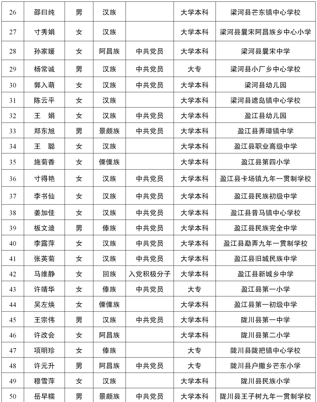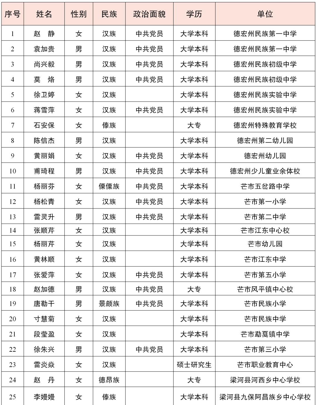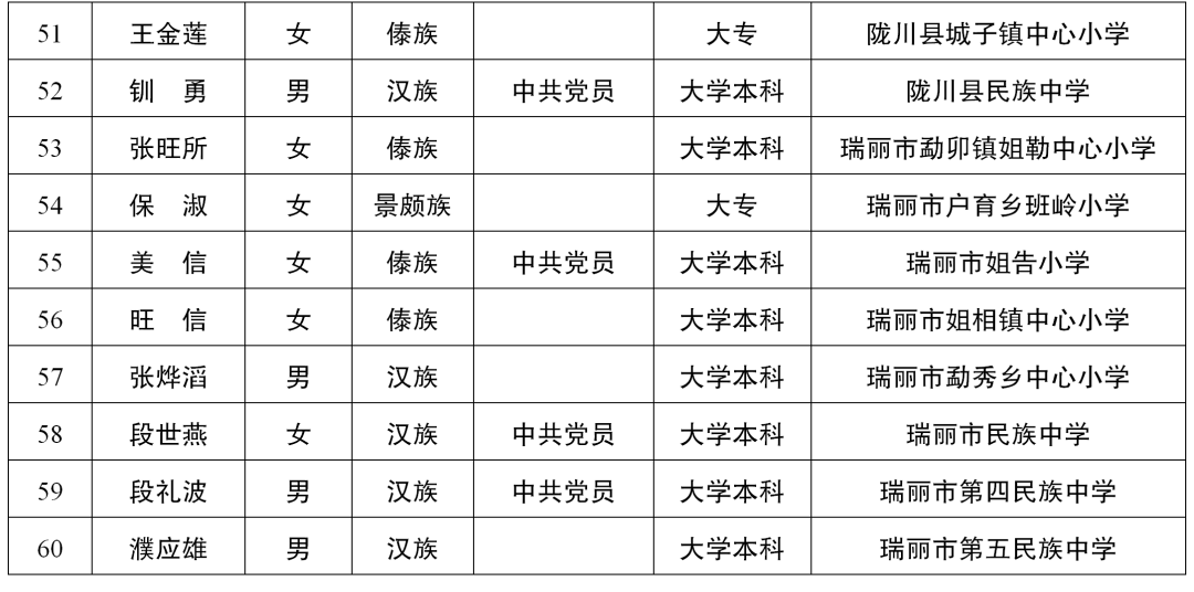 有这样一群人,他们默默坚守,只为点亮学生成长的明灯;他们视学生为自己的孩子,甚至胜于自己的孩子。他们厚积智慧,只为托起学生人生精彩。忙碌而充实,欣慰而自豪,他们觉得一切付出都值得。他们就是老师,学生成长的引路人。 值此第39个教师节来临之际,德宏州教育体育局组织开展了2023年度“最热爱学生的老师”评选活动,通报表扬全州60名“最热爱学生的老师”代表,以此向奋战在全州教育教学一线广大教育工作者致以节日的祝贺和诚挚的问候。 2023年度“最热爱学生的老师”名单 优秀代表: 1 赵静 赵静,女,汉族,1987年9月出生,中共党员,大学本科学历,现为德宏州民族第一中学高级教师。她从教高中英语教学14年来,始终把教育事业当己任,时刻关心关爱学生,教学成绩和班级管理业绩突出,多次被表彰为“优秀教师”“优秀班主任”“十大教学能手”“十佳班主任”“云岭红烛育人先锋先进个人”等荣誉。 2 尚兴毅 尚兴毅,男,汉族,1977年8月出生,中共党员,2003年7月毕业于云南师范大学化学教育专业,1999年8月参加工作,现任教于德宏州民族初级中学,高级教师。他每天总是第一个到教室,把门窗打开,等候同学们的到来,和学生一起学习、活动、打扫卫生。他把“动之以情、导之以行、晓之以理、持之以恒”作为关心学生的座右铭,学生亲切的称呼他--“尚爸爸”。 3 蒋雪萍 蒋雪萍,女,中共党员,大学本科,高级教师。2009年10月参加工作。现就职于德宏州民族实验中学。担任班主任11年,在州级“领雁工程”中被评为“教坛新秀”,曾获德宏州民族实验中学校级教学设计一等奖。她在教学过程中始终将学生放在第一位,坚持用爱,用心守护学生,培养出了大量优秀学子。 4 石安保 石安保,女,傣族,1994年参加工作,高级教师。现就职于德宏州特殊教育学校。18年来她奋战在特殊教育一线,坚持担任班主任,有着丰富的教学经验,探索出了一套非常完善实用的“特殊孩子自主管理方案”。2023届所带毕业班聋十班11人,8人考上昆明盲哑学校高考班(全省招15人),占全省听障应届毕业生的53%,打破了全省纪录。 5 黄丽娟 黄丽娟,女,汉族,1993年11月生,中共党员,德宏州幼儿园骨干教师,优秀党务工作者,优秀班长,课改先进个人。成为有情怀、有担当的幼儿园教师,是她的职业初心,接力“一个灵魂唤醒另一个灵魂,一朵云推动一片云”的教育呼唤,是她的职业理想。十年来,她不负热爱,用最美的青春书写着和孩子共同成长的美好画卷。 6 陈信杰 陈信杰,男,36岁,2010年毕业于云南省师范大学,2011年参加工作,现就职德宏州第二幼儿园。他用心教学,刻苦钻研,业务精良,曾参加省、州各类竞赛并获奖。在校园中,他是孩子们眼中最有趣的“机器人老师”,他对幼教工作兢兢业业的执着和对孩子发自内心的爱,赢得了家长的赞许和孩子的喜爱。 7 甫琦程 甫琦程,男,汉族,1989年9月出生,毕业于云南师范大学体育学院运动训练专业,就职于德宏州少年儿童业余体育学校。2018年他带队参加云南省第十五届运动会,获青少年组排球项目男子组”第二名”和青少年组沙滩排球项目男子组”第一名”,共为德宏代表团收获3.5枚金牌,被云南省体育局评为“云南省群众体育先进个人”;2022年8月,他带队参加云南省第十六届运动会青少年排球和青少年组沙滩排球项目,德宏代表团收获5金1银2铜的好成绩。 8 张爱萍 张爱萍,女,汉族,中共党员,芒市第五小学教师。从教21年来,爱岗敬业,严谨求实,勤奋刻苦,先后70余次荣获国家级省州市级奖励。被评为省级“骨干教师”,州级“教坛新秀”“教学名师”,市级“优秀党员”“育人先锋”等。 9 孙家媛 孙家媛,女,阿昌族,中共党员,梁河县曩宋中学英语教师。从教14年来,她一直坚守在教学第一线,坚持钻研教学知识,认真完成每一项教学任务,教育教学成绩突出。她从事班主任工作多年,班级管理成效显著。她以“严”治班,以“爱”育人,用她的真情和爱心去教育好她的每一个学生。她热爱学生,也深受学生和家长的喜爱。 10 板文迪 11 穆雪萍 穆雪萍,女,汉族,本科学历,陇川县民族小学语文学科带头人。21年来她一直奋斗在教育教学的第一线,敢挑能挑重担,教学成绩屡次获全县第一。她爱生如子,无微不至地呵护每一个孩子健康成长,所带班级荣誉满满,是学校信赖、家长认可、学生热爱的好老师。 12 旺信 旺信,女,傣族,大学本科,现就职于瑞丽市姐相镇中心小学。她热爱教育,自参加工作以来一直担任班主任,所带班级班风纯正、学风优良。她寓教于乐,尊重、信任学生,热爱学生,充分发挥学生的主体作用。她的教学格言:爱心献给学生,诚心送给家长,信心留给自己。