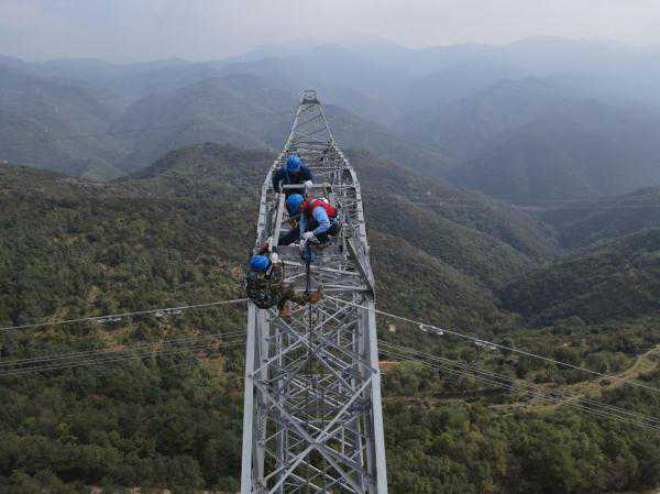 崇山峻岭间,特战班成员在高120米、直径11公分左右的导线上作业。(图片由国网山西超高压输电公司提供) 央视网消息:(记者王莉莉)大山脊背,那是离太阳和光明最近的地方。这是国网山西超高压输电公司全业务核心特战班班长郝晨飞,自己10年的工作经历的最真实的写照。 人迹罕至的太行山脉深处,是很多山西人一辈子都不会涉足的地方。但对于郝晨飞和他的队友来说,为确保电力正常供应,他们经年累月地攀跻到120米高的电力铁塔,相当于40层楼高的超(特)高压输电线上,重复着巡检工作,从不曾有一丝一毫的懈怠。 在郝晨飞负责的沿线上,有着国家“西电东送”重点项目±800千伏陕武直流工程,其中山西段长度为300.5公里。556座铁塔中,有约310座铁塔位于车辆无法抵达的高山顶端,因常年无人通行,通往山顶的路几乎都很原始。郝晨飞说,行进的路上,几乎没有能坐下歇脚的地方,小路被茂盛的灌木丛掩盖,他们只有靠镰刀、手锯等工具开路爬上山顶。 到达电力铁塔脚下后,?郝晨飞和另外两名队员系好安全带,拿着5斤重的双钩攀登绳,背上10多斤重的工具包,戴上线手套,沿着脚钉登塔。队员们说,爬塔时,往下看是海拔1400多米的高山峡谷深不见底,往上看,特高压铁塔同样遥遥看不到头。越往上风越大,呼啸的山风吹得他们的脸生疼,也会刮着塔基晃动。 在攀爬过程中,每隔30米就会有一个休息平台,队员们每次经过休息平台需短暂调整,再继续向上攀爬。15分钟后,他们就来到了铁塔最高处,也就是本次的作业位置——铁塔地线支架。 郝晨飞说,2012年他第一次爬塔时,做了2小时的思想斗争,才硬着头皮开始攀爬,用了60多分钟爬到塔顶。现在,携带自重20斤左右的安全工具,如果爬上一个70米高的铁塔,仅需要10分钟。 “铁塔这么高,第一次当然会怕,但如果我们不做,哪有电网的安全运行和能源动脉?”郝晨飞说,每一个季度,他们都会对线路的铁塔和导线开展一次全方位检查。遇到检修时,在爬塔的过程中,他们还需要对塔身进行检查,螺栓、销子、小材……塔上的每一处检查他们都要极度认真、仔细地一一看过。 70米高的铁塔,郝晨飞与队员们在塔顶进行作业。(图片由国网山西超高压输电公司提供) 在大山间,每300米到500米就建有一座铁塔以连接线路。作为国网山西超高压输电公司的巡检队伍之一,郝晨飞和队员们每月要巡遍负责片区的所有铁塔等电力设施,全年约1800公里的巡线里程。在这条“西电东送”的重要输电线路上,每1度电的消耗都有着大电网运检人的辛勤付出。 绵延的太行山脉,铁塔只是众多串起电网大动脉的一个节点。站在山顶环视,每座铁塔都演绎着同样的平凡坚守故事,都有着像郝晨飞一样的电力巡线员默默呵护着电网的安全。