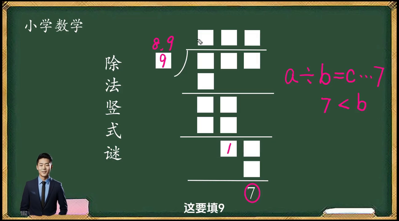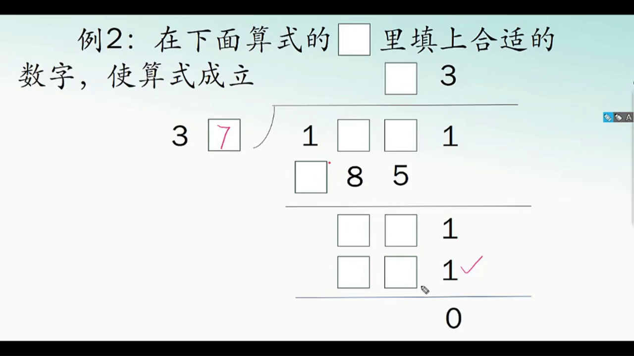 巧填竖式谜(2)。 同学们,这是一道除法竖式谜,你能找到它的通关密码在哪里吗?在这。三是不和这个数相乘要得什么?得这个数。你就会想了,这个地方是一,三和几相乘得一?还用问吗?不管三七二十一,三乘七,现在就知道了这个地方乘七。 大家想一想,如果这要是七,就相当于除数已经知道是三十七了。三七二十一进二,三三得九,这个地方就是一百eleven,它要是一百eleven,它俩相减得零。上面这个数也是一百eleven,这个地方减五得一,这是不是应该是六?这个地方减八等于一,这是不是应该是九?它俩相减正好这没了,那它不就是一吗? 一百八十五是三十七的几倍?这个地方填几和七,七相乘才能除五,这必然要填五,五七三十五进三,三五一十五一十八。
