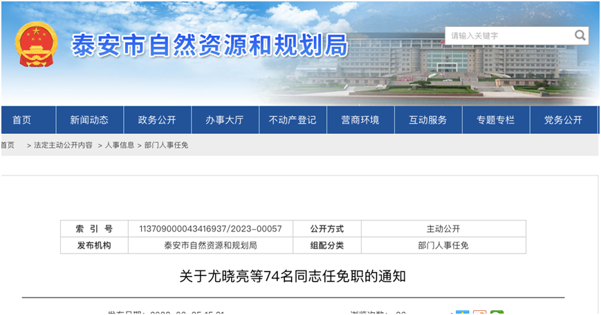6月25日,泰安市自然资源和规划局发布落款时间为2023年6月11日的关于尤晓亮等74名同志任免职的通知。 经局党组研究决定: 尤晓亮同志任泰安市自然资源和规划局办公室(综合科)主任(科长)一级主任科员,不再担任泰安市自然资源和规划局自然资源开发利用科(自然资源所有者权益科)科长职务,不再担任泰安市自然资源和规划局自然资源开发利用科(自然资源所有者权益科)一级主任科员职级; 王文近同志任泰安市自然资源和规划局办公室(综合科)四级主任科员; 王秀云同志任泰安市自然资源和规划局财务审计科一级主任科员; 张家起同志任泰安市自然资源和规划局政策法规科(自然资源规划督查科)四级调研员; 张玲同志任泰安市自然资源和规划局自然资源开发利用科(自然资源所有者权益科)科长(试用期一年),不再担任泰安市国土空间生态修复中心土地处置科科长职务; 张哲同志任泰安市自然资源和规划局自然资源开发利用科(自然资源所有者权益科)副科长、三级主任科员,不再担任泰安市自然资源和规划局政策法规科(自然资源规划督查科)副科长职务,不再担任泰安市自然资源和规划局政策法规科(自然资源规划督查科)三级主任科员职级; 张文峰同志任泰安市自然资源和规划局自然资源开发利用科(自然资源所有者权益科)副科长(试用期一年),不再担任泰安市自然资源和规划局自然资源开发利用科(自然资源所有者权益科)四级主任科员职级; 潘龙同志任泰安市自然资源和规划局建筑工程科副科长(试用期一年),不再担任泰安市自然资源和规划局建筑工程科四级主任科员职级; 刘萍同志任泰安市自然资源和规划局市政规划科科长(试用期一年),不再担任泰安市自然资源和规划局建筑工程科副科长职务,不再担任泰安市自然资源和规划局建筑工程科三级主任科员职级; 张凯同志任泰安市自然资源和规划局国土空间生态修复科(防灾减灾科)一级主任科员; 邹剑同志任泰安市自然资源和规划局人事科科长、一级主任科员,不再担任泰安市自然资源和规划局办公室(综合科)主任(科长)职务,不再担任泰安市自然和规划局办公室(综合科)一级主任科员职级; 马平同志任泰安市土地收购储备中心综合科科长,不再担任泰安市土地收购储备中心土地储备科科长职务; 郭俊鹏同志任泰安市土地收购储备中心财务科科长,不再担任泰安市土地收购储备中心土地经营科科长职务; 唐海滨同志任泰安市土地收购储备中心土地储备科科长(聘期三年); 孙海英同志任泰安市土地收购储备中心土地储备科副科长,不再担任泰安市土地收购储备中心市场研究科副科长职务; 张圣武同志任泰安市土地收购储备中心土地经营科科长,不再担任泰安市土地收购储备中心监测评价科科长职务; 贝浩同志任泰安市土地收购储备中心土地经营科副科长(试用期一年); 史加安同志任泰安市土地收购储备中心市场研究科科长,不再担任泰安市土地收购储备中心财务科科长职务; 黄蓉同志泰安市土地收购储备中心市场研究科副科长(聘期三年); 张志同志任泰安市土地收购储备中心监测评价科科长(试用期一年),不再担任泰安市土地收购储备中心土地经营科副科长职务; 修峰同志任泰安市国土空间生态修复中心总工程师,不再担任泰安市国土空间生态修复中心正科级干部; 宁云同志任泰安市国土空间生态修复中心生态修复科副科长(试用期一年); 董宁宁同志任泰安市国土空间生态修复中心开发整理科副科长(试用期一年); 张静同志任泰安市国土空间生态修复中心国土综合整治科副科长(试用期一年); 王超同志任泰安市国土空间生态修复中心耕地保护科副科长(试用期一年); 井晓彤同志任泰安市国土空间生态修复中心耕地保护科副科长(试用期一年); 吕祥同志任泰安市国土空间生态修复中心地质灾害防治科副科长; 苏宝成同志任泰安市国土空间生态修复中心地质灾害防治科副科长(试用期一年); 梁雪梅同志任泰安市国土空间生态修复中心批后监管科副科长(试用期一年); 张艳玲同志任泰安市国土空间生态修复中心土地处置科副科长(试用期一年); 王延同志不再担任泰安市国土空间生态修复中心国土综合整治科副科长职务; 毕雪莲同志不再担任泰安市国土空间生态修复中心耕地保护科副科长职务; 张圣梅同志不再担任泰安市国土空间生态修复中心土地处置科副科长职务; 郑波同志任泰安市自然资源规划执法支队办公室副主任(试用期一年),不再担任泰安市自然资源规划执法支队四级主任科员职级; 吴秀华同志任泰安市自然资源规划执法支队办公室三级主任科员,不再担任泰安市自然资源规划执法支队办公室副科级干部; 刘旭同志任泰安市自然资源规划执法支队办公室三级主任科员,不再担任泰安市自然资源规划执法支队执法数据处理中心副主任职务; 金剑同志任泰安市自然资源规划执法支队办公室三级主任科员,不再担任泰安市自然资源规划执法支队四级主任科员职级; 杨国兴同志任泰安市自然资源规划执法支队督察科科长(试用期一年); 王雪峰同志任泰安市自然资源规划执法支队督察科副科长(聘期三年),不再担任泰安市自然资源规划执法支队四级主任科员职级; 张贵珍同志任泰安市自然资源规划执法支队信访科科长(聘至退休); 刘庆军同志任泰安市自然资源规划执法支队信访科副科长(试用期一年); 