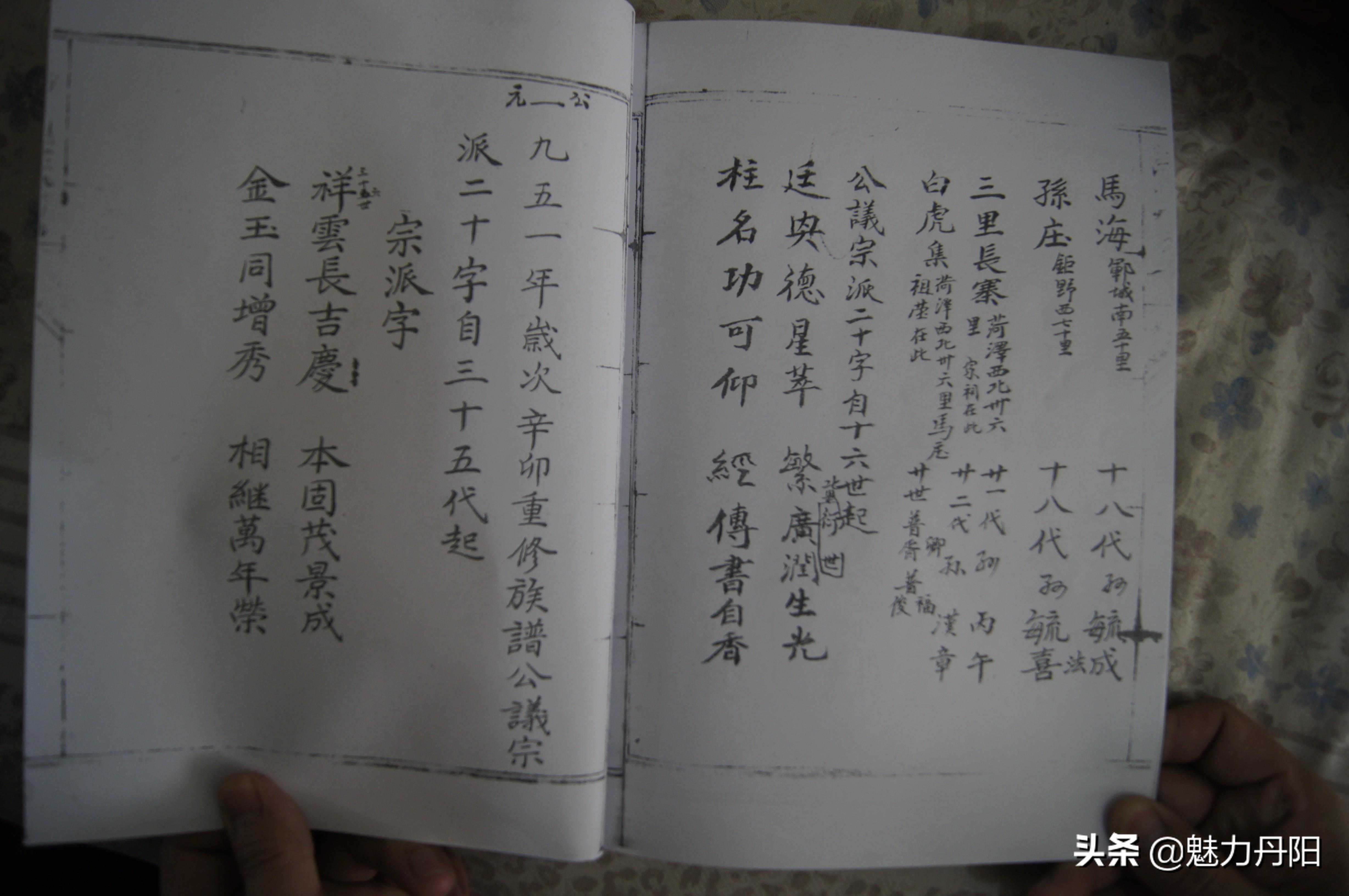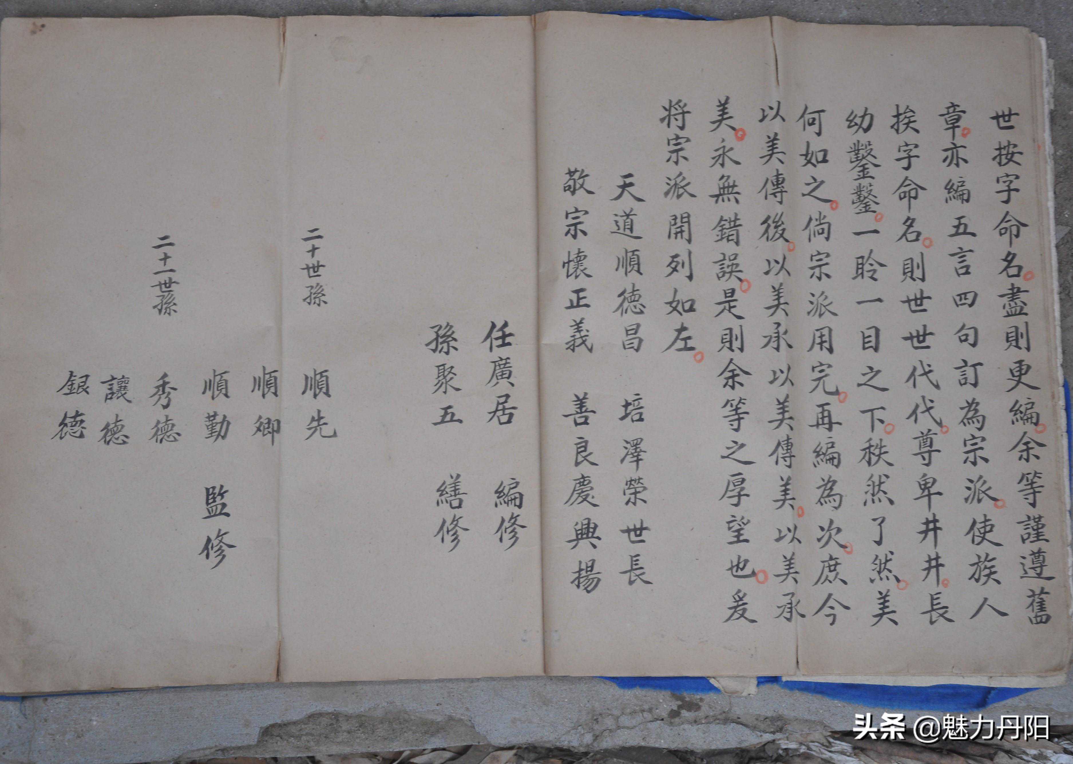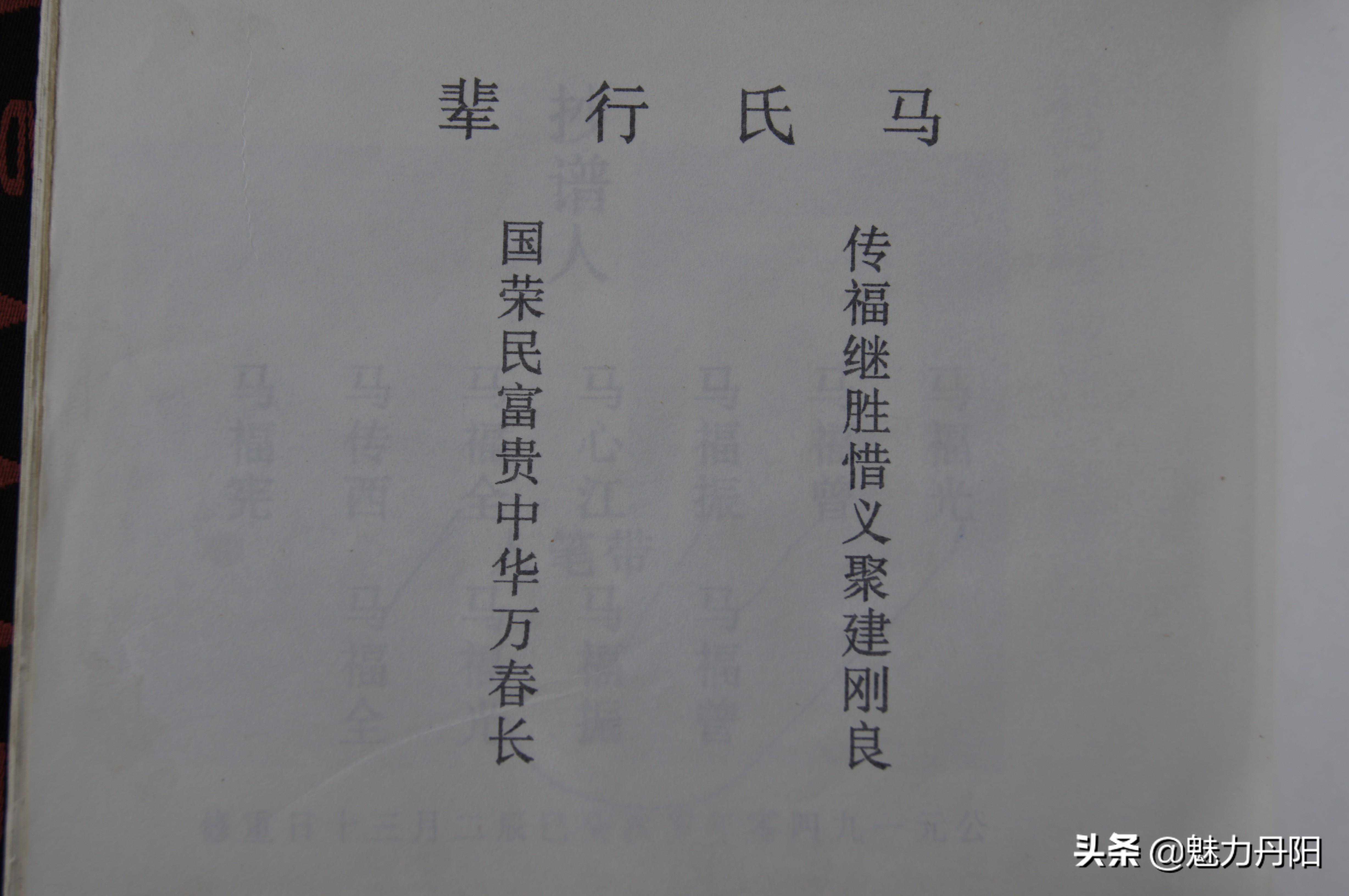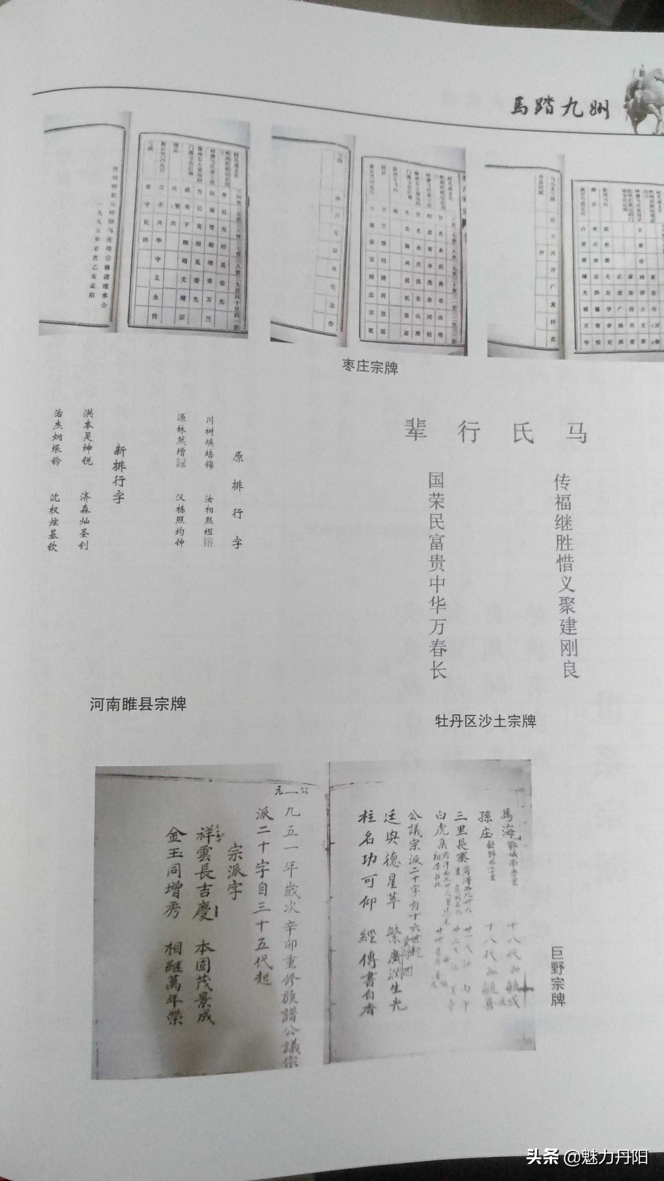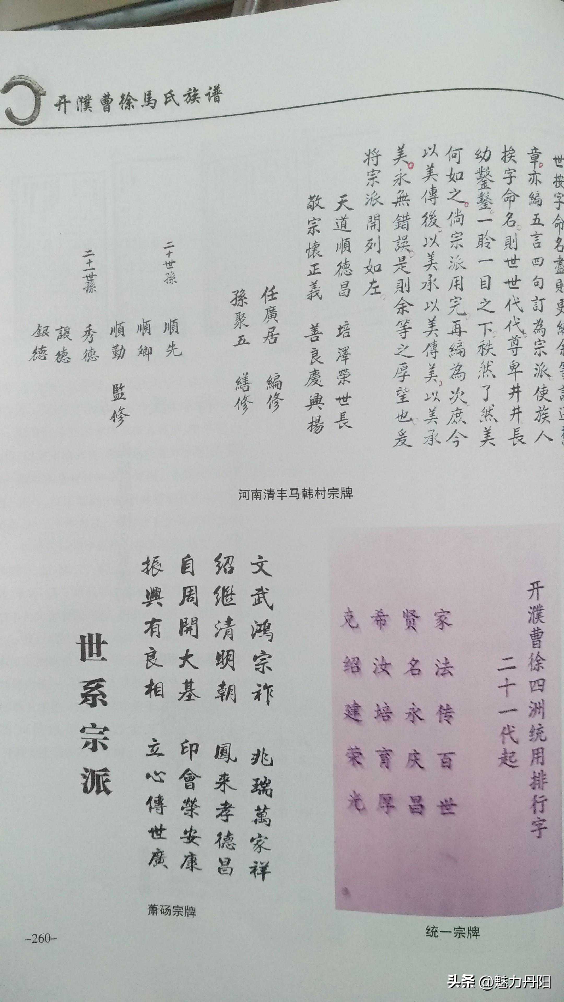 宗牌篇说明 辈份,指在家族、亲友的长幼先后中所居的地位,也指家族、亲友之间的世系次第。主要有高祖辈、曾祖辈、祖辈、父母辈、平辈、矮辈之分。 辈份的字谱又称昭穆、字派、宗牌、行派,用以表明同宗亲属、家族世系、血系秩序的命名字辈排列。辈分序昭穆古已有之,昭穆为我国宗法制度,即宗庙或宗庙中神主的排列次序。昭穆制源于母系氏族社会二辈制族外婚,每个氏族内男女各有两个辈分,两个氏族的同辈异性才可以通婚,子女的世系按母亲的世系决定,父子属于不同氏族。后来昭穆制逐渐得以演化,上古时代宗庙或墓地排列,始祖居中,以下父子(祖、父)递为昭穆,左为昭,右为穆。以周代天子七庙为例,自始祖之后,父为昭,子为穆。排列时,大祖居中,三昭位于大祖的左方,三穆位于大祖的右方,以此来分别宗族内部的长幼次序和亲疏远近。 辈分的排列常常体现在人名中,使用辈分用字不仅便于在同族中排行辈,认辈分,也便于修宗谱。一般而言,以字定辈分者,都将这些辈分字置于姓之后。上至皇族,下至百姓都有辈分。我们的父辈名中,辈分用字一般取寓意较好的字来使用。在这种宗族观念下,一般排辈分主要体现在男丁中,女子不入宗谱,故不采纳。现今,许多家庭中的姐妹看似有使用辈分字的,但一般只是任选一个相同的字用在姊妹中,以表示姐妹关系,并无序辈之意。行辈字是宗族内部按一定次序排列的,并不是父母或本人可以随便选用的。 宗谱的行辈字派用以加强宗法制度,所以其用字也充分反映了这一目的,主要有三类,一类是美德或吉祥的字,如:德、仁、明、孝、福、禄、吉、祥、贤等;第二类是希望宗族延续和昌盛的字,如:永、传、昌、盛、兴、延、继、承等;第三类是怀念先祖和歌颂皇天恩德的字,如:泽、祖、显、荣、恩、锡、启、先等。家谱的行辈字派是家谱中尤其重要的内容,一般由家庭中的某一位名人制订,编成几句吉祥话,有的文人甚至将其写成诗。 我开濮曹徐马氏640多年来,前10多代原来宗牌不统一,各门各支多单独起续行辈,用字排列不同,略有学问的先祖为了区别宗族亲疏,多自行用字,把本支堂兄弟与其他区分。民国后,随着家谱的编修,行辈宗牌趋向统一,但很多人未必完全按此起名,特别是从上个世纪70、80年代后,很多年轻人起名多不采用。同宗牌大多是一家,不同宗牌未必不是一家。上个世纪初濮阳马李集祖庙启用的20字行辈:家21法22传23百24世25,贤26明27永28庆29昌30,希31汝32培33育34后35克36绍37见38荣39光40。为我开濮曹徐马氏统一字牌。 二门至宝爷后人民国元年续谱宗牌:(从21世始) 家法相承受世昌,照开盛运延庆长。 二门至宝爷后人1953年续谱宗牌:(从21世始) 家法仰令绪,培积崇嗣昌,式汝绍繁衍,斯乃丕兆杨。 三门俊义爷后人巨郓单支光绪四年(1878年)续谱宗牌 来止衍宜德,啟佑开丰苞。 三门俊义爷后人巨郓单支1931年续谱宗牌(从9世始) 孟化世中永,维克全登之,玉树方广庆, 传益光兴其,圣文养景瑞,书省香照思。 三门俊岭爷巨野支1951年续谱宗牌(从16世始) 廷兴德星翠,凡广润生光,柱名功可仰,经传书自香。 三门俊义爷后人巨郓单支1982年续谱宗牌(从世始) 玉树方广庆,腾进龙飞喜,圣贤成祥瑞,韵华香照思。 三门世隆爷沙土支1951年续谱宗牌(从20世始) 传福继胜惜,义聚建刚良,国荣民富贵,中华万春长。 三门贵宝爷后人峄藤马庄续谱宗牌(从18世始) 文秉世鸿,祥占立新,相彦有余, 茂全同始,保源登殿,增秀万三。 三门徐州马山续谱宗牌(从18世始) 廷在朝先自学孝克福 三门徐州马山支雪湖续谱宗牌(从18世始) 廷玉兴开广,龙传克继昌,光宗从先志,作希守长祥。 三门太康睢县支续谱宗牌(从18世始) 原宗牌:川树焕培锦,汝相熙坦镕,源林然增禄,汉栋照均钟。 新宗牌:洪本灵坤锐,济森灿圣剑,治杰炯垠衿,沈双炫其钦。 四门通宝后人沛县马楼支宗牌(从13世始) 宏远偕世风,文玉志景瑞,学立吉(布)庆祥。 四门通宝后人沛县郑堂支宗牌(从13世始) 文龙全在俊,德廷世永昌,培基庆其祥。 四门通宝后人铜山车村支宗牌(从13世始) 尚绍中(道)晶公,大廷公士履。 四门通宝后人黄山支宗牌(从21世始) 正道广杨洪圣英,振兴远长思志成,秀子卿靖文增宗。 四门通宝后人萧砀支宗牌(从15世始) 振兴友良相,立心传世广,自周开大基,印会荣安康, 绍继清明朝,奉来孝德昌,文武洪宗祚,兆瑞万家祥。 开濮曹徐马氏五门统一宗牌:(自21世起) 家法传百世贤明永庆昌希汝培育厚克绍建荣光。 新沂马港瓦窝宗牌(从18世始) 启贤敬继,光裕万年,立德荣宝, 昭忠宗乾,贵孝兴华,守义永传。 藤县马氏宗牌(从18世始) 延召世运洪,锡粲恒贞崇,慎绍懿德训,思远庆繁兴。