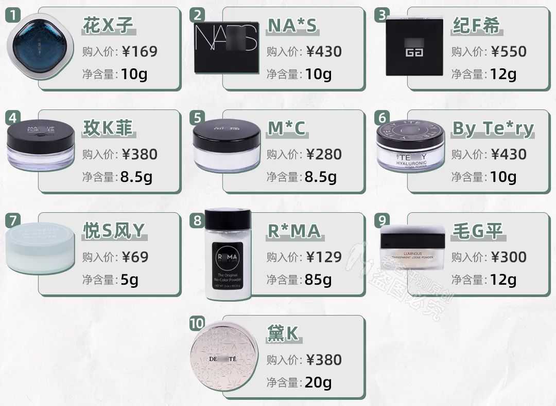 为了能够拥有堪比“妈生好皮”、“超长待机”的完美底妆,各位仙女仙男们可谓是煞费苦心—— 在测过「妆前乳」、「粉底液」之后,老爸评测终于对「散粉」下手啦! 我们在小red书平台发布了样品征集,根据点赞数选择了排名靠前的10款产品—— 为了给大家提供更具参考的评测结果,我们这次不仅委托实验室招募了30名志愿者,进行8小时功效测试;还带着10名小仙女同事去了汗蒸房进行了1小时极端实测,带薪汗蒸的感觉可真不错~ 根据持妆、控油、防水抗汗、成分安全4大维度,本次散粉评测我们最终推荐: 咱就是说,化妆这件事儿可真是玄学。同样的底妆产品,在美妆博主的脸上就能做到超长待机,越夜越美丽;在我的脸上就化妆两小时,脱妆5分钟……到底哪里出了问题? 为了选出能让底妆「超长待机」的散粉,我们委托实验室招募了30名油性皮肤志愿者,在使用同款护肤和粉底产品后,右脸上散粉并于恒温恒湿(温度21±1℃,湿度50±10%RH)的房间等待8小时。 使用3D皮肤成像仪通过测试左右两侧额头的基础值、0h、8h的色素沉着改善情况,来判定该产品的持妆效果。 其中,4号玫K菲、3号纪F希、5号M*C、9号毛G平、8号R*MA、2号NA*S样品持妆效果较好。想要把底妆焊在脸上的朋友们,可以试试这6款。 注:柱子越高,持妆效果越好 对于油皮的朋友来说,每个又潮又热的夏天都是一生之敌。 在空调房里化好的妆,从出门的那一刻起就开始不再美丽。别人是光彩照人,到我这里就成了油光满面。更别提每每到了晚上,脸上出的油刮下来都能炒盘菜了。 为了解决油皮姐妹们的心腹大患,实验室使用皮肤测试仪分别测试了志愿者左右额头的油脂分泌情况。 通过分析两侧额头基础值、0h、8h的油脂分泌值,最终得出10款样品的控油提高率,结果如下: 注:柱子越高,控油效果越好 1号花X子、5号M*C、9号毛G平、2号NA*S、7号悦S风Y、8号R*MA样品的8小时控油效果较好,一到夏天就滋滋冒油、疯狂脱妆的大油田姐妹们,冲鸭。 我们随机选了一款产品,也来测试了一下—— 惊不惊喜?意不意外?这其实是因为一项表面处理技术,将粉的表面进行了疏水处理。 当然,不同品牌的处理效果也有好坏之分,考虑到夏季出汗量大、带妆去游泳……等场景,我们分别测试了10款样品的防水抗汗效果。 实验室研究员小姐姐在志愿者左右两侧手臂各画两个格子,使用3D皮肤成像分析仪采集色素沉着基础值后,一个只涂半泵粉底液,另一个涂半泵粉底液+散粉,右臂测试防水,左臂测试抗汗效果。 01防水测试 志愿者将右臂放入水池浸泡、冲水各10分钟,出水休息20分钟后,重复一次,等待30分钟。使用3D皮肤成像分析仪分别测试冲水前和冲水后的色素沉着值。 02抗汗测试 志愿者每隔30分钟对着左臂喷洒一次人工汗液,每隔2小时采集一次色素沉着值,持续4小时。 综合两项测试结果,防水抗汗效果好的样品分别是:3号纪F希、5号M*C、8号R*MA、9号毛G平。 选对定妆产品不仅能够提升底妆质感,还能起到提亮肤色、柔焦毛孔的作用。 01光泽度测试 实验室利用皮肤测试仪分别测试志愿者左右额头光泽度的基础值、0h、8h的数据。 根据以上数据,长效提亮效果较好的样品有:10号黛K、1号花X子、8号R*MA、5号M*C、3号纪F希。 注:柱子越高,长效提亮效果越好 通过测试我们也发现,长效提亮效果好的产品,通常添加了云母、一氮化硼等成分,前者自带珍珠光泽,后者则偏向金属光泽。 02肤感测试 薄如青烟,细如吹雪,对于一款散粉产品来说,粉质越细真的越好吗? 我们将10款样品送到实验室,参照GB/T19077-2016测试了样品的粒径大小,结果如下: 注:柱子越低,粉质越细 根据结果显示,6号ByTe*ry散粉最细腻,粒径基本分布在10μm以内;4号玫K菲和7号悦S风Y的粒径分布也相对较窄,95%的粒子粒径分布在20μm以内。1号花X子、3号纪F希、5号M*C、9号毛G平均分布在30μm以内。 粉质越细,填充毛孔的效果相对越好。对柔焦毛孔有需求、喜欢毛茸茸妆感的朋友,可以考虑以上样品。 不过妆效肤感与个人喜好有关:有人喜欢奶油肌的光泽感,有人喜欢丝绒哑光的妆效,各花入各眼。 01滑石粉 不知从何时起,大家开始谈滑石粉色变。提到滑石粉就离不开有毒、致癌、对身体有害…… 我们早在20年就科普过,真正有害的并不是滑石粉,而是在原料、生成加工中可能带入的石棉杂质。 石棉是1类致癌物,我国2015年版《化妆品安全技术规范》中明确规定石棉在化妆品中禁止检出。 因此我们参照该规范,用X射线衍射仪(XRD)和偏光显微镜(PLM)定性测定3号、8号、10号三款含有滑石粉成分的产品中,是否含有石棉,结果均未检出。 其实,药监局在2009年也出了公告,要求含有滑石粉的化妆品中,出具石棉检测报告才能备案; 根据上文,石棉又明确禁止在化妆品中检出,因此只要是正规备案的化妆品,大家基本可以放心使用。 02重金属 散粉中一般会添加云母、硅石、钛白粉、色粉等成分,可能会带入重金属。 我们将10款散粉送到实验室,参照《化妆品安全技术规范》2015版第四章的方法测试了10款散粉中的铅、汞、砷、镉、铬、镍,结果均合格。 对于铬和镍,国家没有限量要求,但所有的产品铬都有检出总铬。而铬中的六价铬是公认的有害物质,化妆品中禁用,安全起见,我们对产品加测了六价铬,结果均未检出。 03防腐剂 9号毛G平使用了安全性存在争议的长链尼泊金酯防腐剂:羟苯丁酯,因此不做推荐。 话