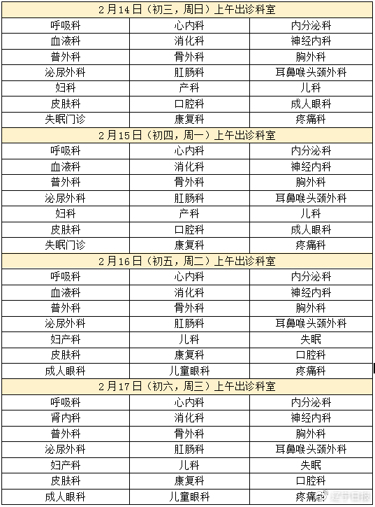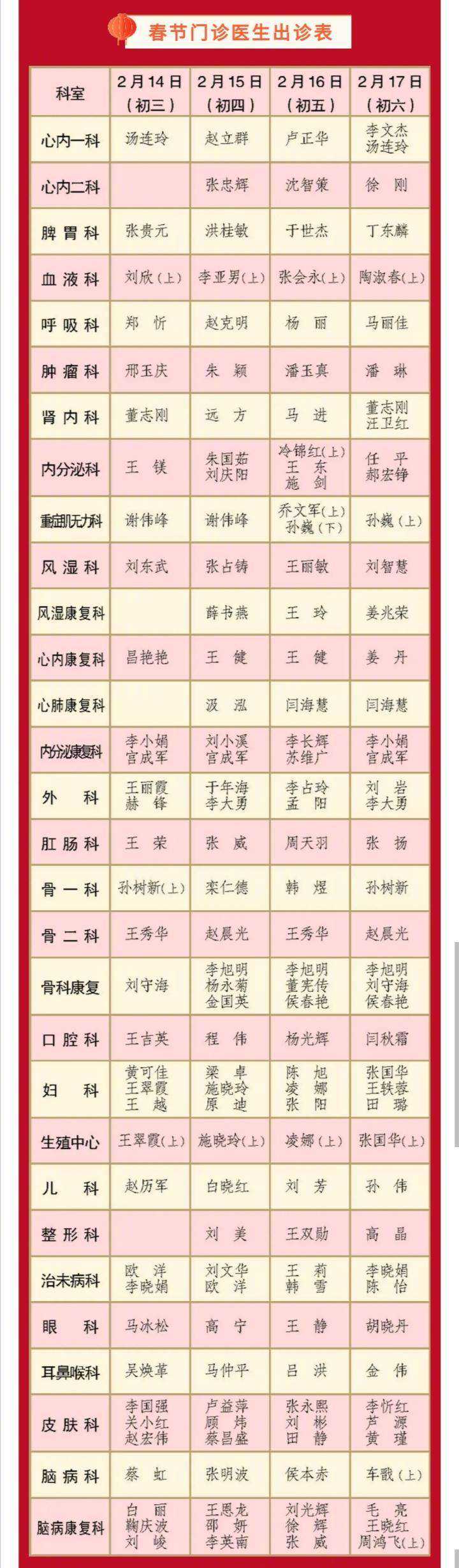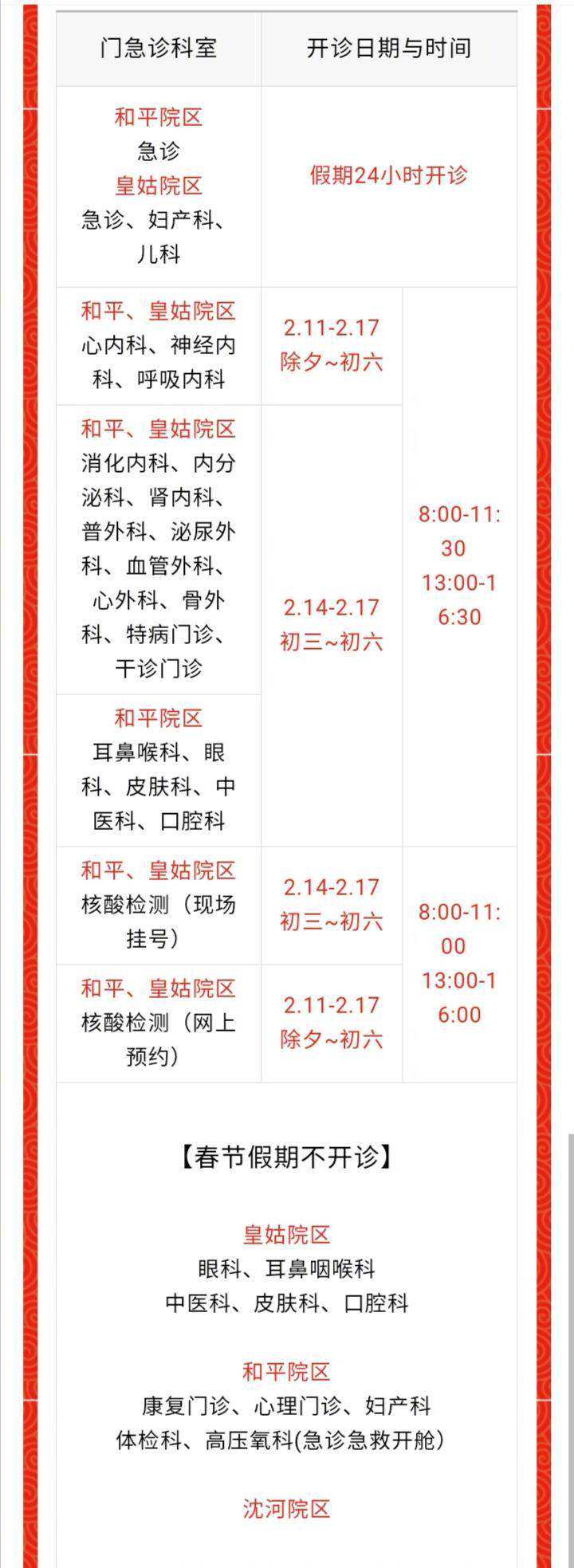 春节假期将至,万一假日期间有个头疼脑热,或者有啥突发状况,该去哪家医院就诊呢?为方便患者春节期间就医,记者梳理了辽宁部分医院假日门急诊安排,大家收藏好,以备不时之需。 中国医科大学附属第一医院 根据《国务院办公厅关于2021年部分节假日安排的通知》,中国医大一院2021年春节放假安排如下: 2月11日(除夕)至2月17日(初六)放假调休,共7天;2月18日(初七)正式上班。在此期间: 1.急诊:24小时开诊; 2.发热门诊:24小时开诊; 3.门诊:2月11日(除夕)至17日(初六)休息; 4.病房:实行值班制。 中国医科大学附属第四医院 根据《国务院办公厅关于2021年部分节假日安排的通知》,中国医大四院门诊工作安排如下: 1.门诊自2月11日-17日按节假日值班出诊,节假日期间每日开诊时间为上午8:00至11:30,下午13:00至16:30 2.急诊、崇山院区发热门诊24小时正常开诊 3.崇山院区核酸检测门诊节假日期间正常开诊,开诊时间为上午8:00至16:00。建议前来就诊的患者提前进行网上预约挂号缴费,直接前往核酸采集中心采样 4.特病门诊、著名专家门诊、特需专家门诊、方便门诊、体检中心节假日期间停诊 5.挂号以实际当日出诊专家为准 中国人民解放军北部战区总医院 一、门诊 春节期间,2月11日(除夕)至14日(初三)放假4天;15日(初四)至17日(初六),门诊正常开诊。 二、急诊:24小时开诊。 中国医科大学附属口腔医院 根据国务院办公厅《关于2021年全国年节及纪念日放假办法的决定》,中国医大口腔医院将2021年春节假期放假调休日期的具体安排通知如下: 2月11日(除夕)、12日(初一)、13日(初二)为国家法定假日,仅综合急诊科开诊;2月14日(初三)~2月17日(初六)各门诊科室安排值班。 2月7日(星期日)、2月20日(星期六)分别按工作日星期一、星期三正常开诊。 假日期间,出诊医生以当日挂号信息为准,望广大患者周知,提前做好就诊安排。 辽宁省肿瘤医院 根据《国务院办公厅关于2021年部分节假日安排的通知》精神,结合医院实际,辽宁省肿瘤医院2021年春节假期及门诊安排如下: 一、放假时间 2021年2月11日至2月17日假期调休,共7天。 2月7日(星期日)上班,与2月11日(星期四)调休。 2月20日(星期六)上班,与2月17日(星期三)调休。 二、假期门诊安排 2月15日(星期一)、2月16日(星期二)、2月17日(星期三)节假日期间门诊部分开诊。部分开诊期间可以开药(除第一、二类精神药品、特病开药外)、办理住院手续、检验(血、尿、便常规)、平扫CT、MR、DR、彩超等检查。 温馨提示:2月16日、2月17日核酸门诊恢复检测。 辽宁中医药大学附属医院 按照国务院办公厅印发《关于2021年部分节假日安排的通知》安排,结合辽宁中医药大学附属医院实际情况,现将2021年春节放假安排通知如下: 1.2月11日(除夕)至13日(初二)急诊、发热门诊24小时开诊,2月14日(初三)至17日(初六)门诊、急诊、发热门诊均开放,春节假期特病门诊、便民门诊停诊; 3.节假日期间值班电话:(白班)。 春节门诊医生出诊表(仅供参考,请以当日实际出诊为准) 春节核酸检测安排 时间2月11日(除夕)至13日(初二)上午8:00-11:00; 2月14日(初三)至17日(初六)上午8:00-11:00;下午13:30-16:00 地点主院区楼外,门诊与住院部连接处(有明显标识) 注意事项只接受微信服务号上预约,请按照预约时间直接到核酸检测点采样 辽宁中医药大学附属第二医院 门急诊安排 一、急诊、发热门诊春节期间24小时正常开诊,便民门诊停诊。 二、2月11日(农历三十)至2月14日(初三)门诊停诊;2月15日(初四)至2月17日(初六)门诊具体安排如下: 三、核酸检测门诊安排 核酸检测门诊春节期间正常开诊,每日采样时间为8:00-11:30,13:00-16:00。每日10:00前检测,当日16:00出报告;10:00-16:00检测,当日22:00出报告。 大连医科大学附属第一医院 根据《国务院办公厅关于2021年部分节假日安排的通知》,结合大医一院的实际情况,现将2021年“春节”门急诊出诊安排通知如下: 一、急诊: 长春路院区(含发热门诊)、心血管病院(联合路院区)、金普院区24小时开诊。 二、门诊: (一)长春路院区、心血管病院: 1.2月11日(除夕)~2月14日(初三)门诊休息。 2.2月15日(初四)~2月17日(初六)按正常工作日出平诊,无专家诊。 3.2月18日(初七)起开始正常开诊。 4.长春路院区外科门诊2月11日(除夕)~2月14日(初三)休息,2月15日(初四)~2月17日(初六)正常换药。 (二)联合路院区(不含心血管病院): 2月11日~2月17日(除夕~初六)休息,2月18日(初七)正常开诊。 (三)金普院区: 1.2月11日~2月14日(除夕~初三)门诊休息。 2.2月15日(初四)按周一、2月16日(初五)按周二、2月17日(初六)按周三安排出诊,无专家诊。 3.2月18日(初七)起开始正常开诊。 核酸检测:与门诊出诊时间一致。新冠核酸检测门诊提前一天下午2点放号,每日放号200个。 大连医科大学附属第二医院 一、医院出诊安排: 门诊: 2月11日(除夕)--2月13日(初二):门诊休息; 2月14日(初三)--2月17日(初六):固定专诊停,按资质挂号诊正常开放; 2月20日(周六):固定专诊按周六安排出诊,按资质挂号诊按平时工作日正常开放; 急诊:24小时开放; 预约诊疗中心:除2月11日(除夕)--2月13日(初二)休息外,均正常开放; 夜间专家诊:春节放假期间均停(含周末); 核酸检测门诊:除2月11日(除夕)--2月13日(初二)休息外,均正常开放。 锦州医科大学附属第一医院 为了满足广大患者的就医需求,锦州医科大学附属第一医院春节期间正常运转,全力做好各项医疗