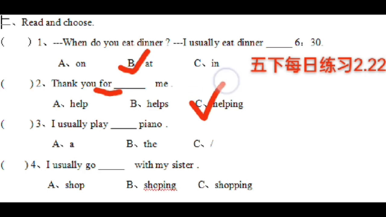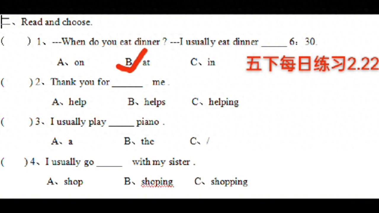 大家好,今天是二月二十二号,来看一下今天的习题练习。 ·先看第一小题:你什么时候吃晚饭?我通常在晚上六点半吃午饭。来看一下,选择的是一个介词,时间点前面用的什么?at选的是b选项,a是具体到某一天,具体的日期、星期或怎么样的一天都可以。c一般是进节和月份,年份用的比较多,获了一些和它固定搭配。 ·第二小题:谢谢你帮助我。在这个地方大家注意有一个用法叫做介词的后面,动词要添加ang,选的是c选项。thankyouforhelpingme。 ·第三小题:我通常弹钢琴,乐器类要加则playthe琵琶。 ·第四小题:去购物。购物的时候有同学会容易出现尾字母的错误,写的是c选项,中读b音节,一元加一幅要双写尾字母goshopping。