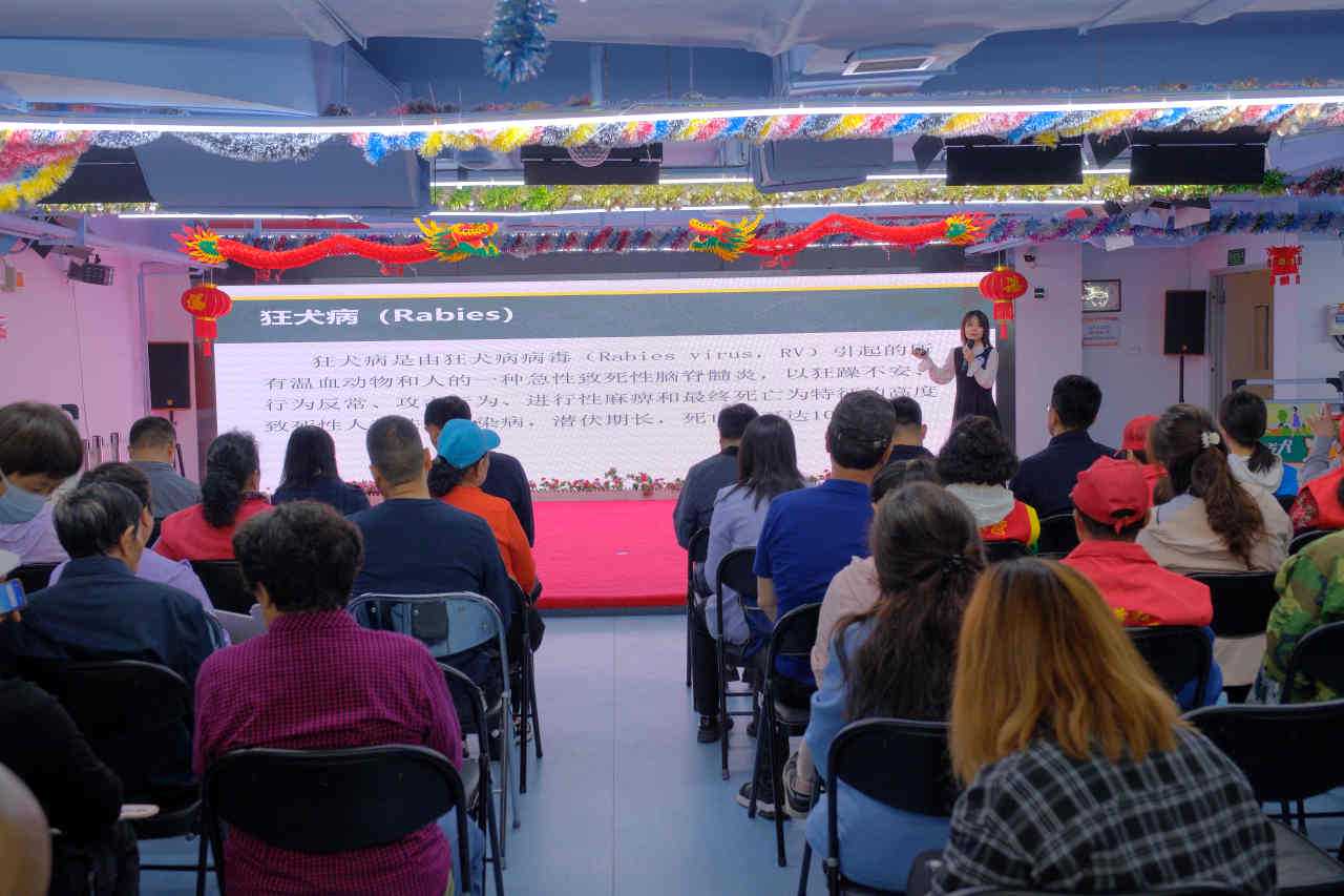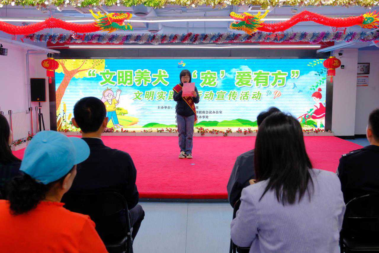 为进一步规范社区文明养犬行为,加强社区养犬管理,和谐邻里关系,引导居民依法、文明、科学养犬,共建安静舒适的生活环境,4月26日上午,昌平区委宣传部联合昌平区养犬管理联席会议办公室、昌平区霍营街道办事处、霍营派出所等单位,采取“科普”+“百姓”+“文艺”的形式,在霍家营社区新时代文明实践站开展“文明养犬‘宠’爱有方”宣传活动。昌平区委宣传部四级调研员马俊高、昌平区新时代文明实践中心负责人张俊杰、昌平治安支队公共秩序管理中队中队长吴凯、霍营街道党群工作办公室科长朱培、霍营派出所副所长杨宁、回龙观仁心动物医院院长李丹、霍家营社区党委书记李宝忠以及80余名霍家营社区居民、文明养犬志愿者参加。