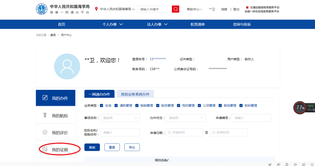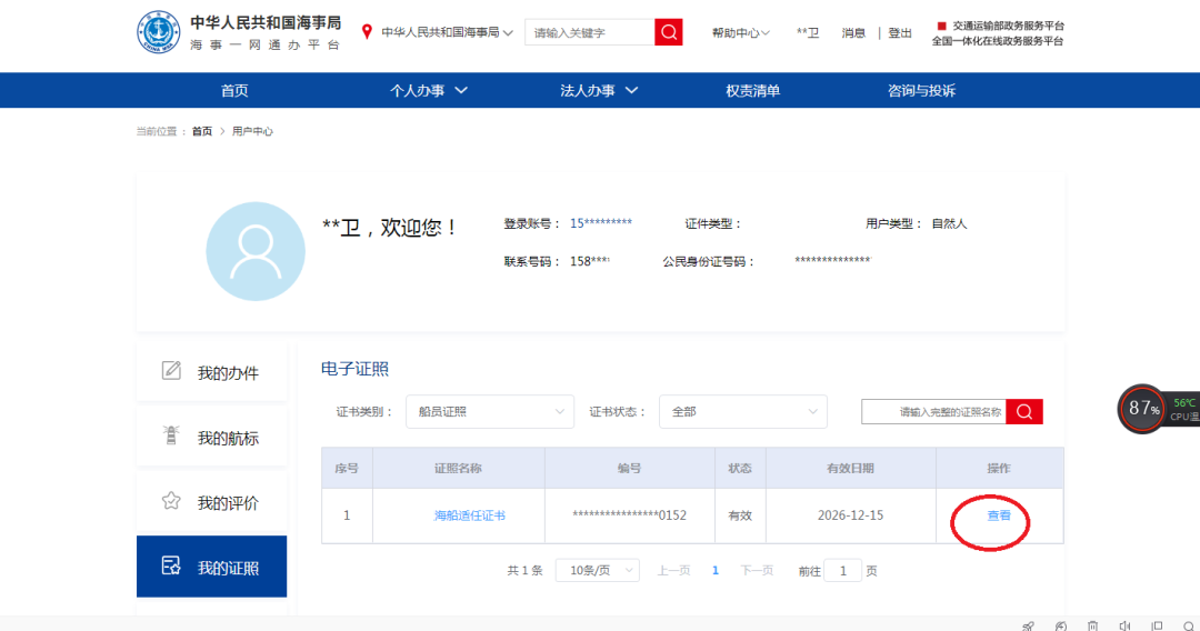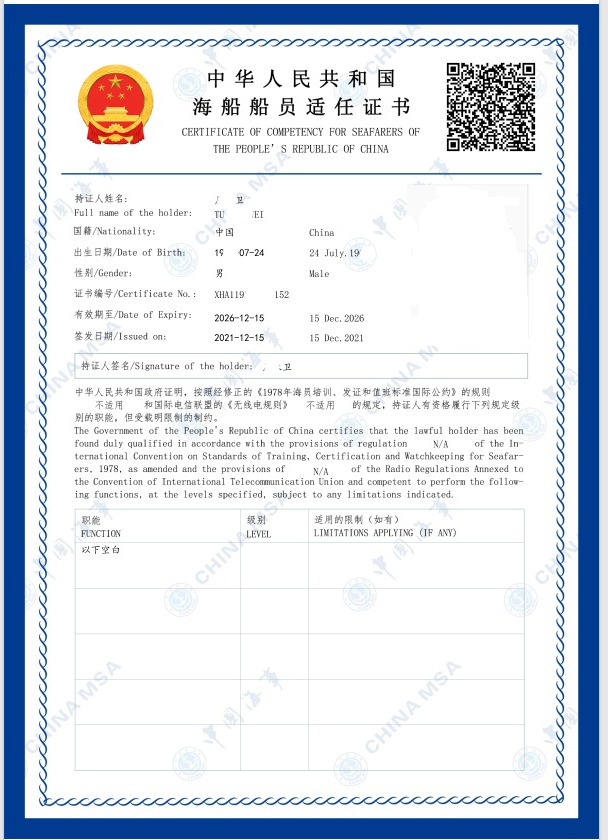 “船员电子证书” 全国推广! 船员求助 蓝丝带小姐姐,我的船员证书到期了,可是由于疫情影响,我无法下船换证,怎么办呀? 莫慌莫慌,您可以直接在中国海事“一网通办平台”办理到期换证,并且根据中国海事局2021年12月3日发布的“第二批可在线办理的电子证照清单”,船员证书已实现电子证照。无需领取纸质证书,也可以正常任职哦! 蓝丝带 小姐姐 船员求助 电子证照与纸质证照效力相同吗? 当然!电子证照与纸质证照具有同等效力。 蓝丝带 小姐姐 船员求助 有哪些船员证书适用电子证照呢? 目前已经发布的船员电子证照共有2批次共10个种类,具体如下: 蓝丝带 小姐姐 第 一 批 1.海船船员适任证书 2.海船船员培训合格证 3.船员培训合格证 第 二 批 1.内河船舶船员适任证书 2.内河船舶船员培训合格证 3.海船船员内河航线行驶资格证明 4.游艇操作人员适任证书 5.特定航线江海直达船舶船员行驶资格证明培训合格证 6.海船船员健康证明 7.厨师培训合格证与膳食服务辅助人员培训证明 还有问题 那怎么查看我的船员电子证照呀? 来!蓝丝带小姐姐手把手教你如何查询船员证书电子证照。 随时解答 电脑版 01 进入中国海事“一网通办平台”()。 02 03 选择“个人用户登录”,输入用户名、密码,完成验证后登录平台。 04 05 在左列选择“我的证照”,证书类别选择“船员证照”,就能看到用户船员证书列表。 06 手机版 01 02 03 4 找到我的证照,即可查看电子证书。 蓝丝带 小姐姐 目前系统只上线了近期新签发的船员证书,下一步将会分批次陆续将有效的船员证书信息推送至海事一网通办平台,并生成电子证照,请耐心等待哦! 附船员电子证书模板: