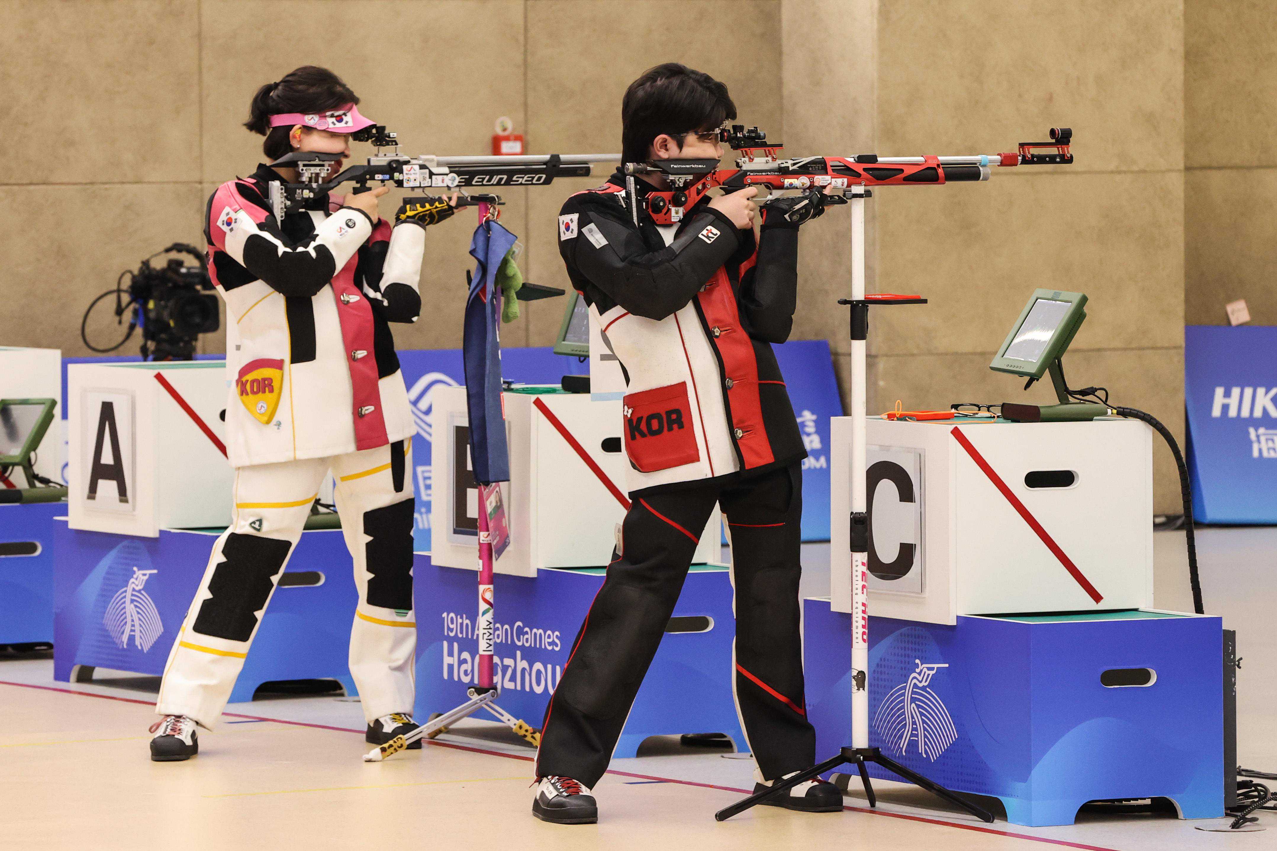 在率先进行的10米气步枪混合团体资格赛中,黄雨婷/盛李豪以634.4环的成绩排名榜首。根据规则,排名前两位的队伍直接晋级金牌赛,排名第三至六位的队伍两两分组,争夺两枚铜牌。金牌赛和铜牌赛采用“抢16”规则,两组选手单发对决,成绩高者得2分,低者不得分,打平各得1分。 9月26日,中国选手盛李豪(右)、黄雨婷在比赛中。新华社记者单宇琦摄 在金牌赛中,黄雨婷/盛李豪比赛轻松赢下前两回合对决,观众在比分出来后爆发出热烈的掌声和欢呼声。第三回合,两队打平各得1分。此时观众席突然安静了几秒,随后开始为中国队加油。 从第四回合起,中国队连得10分,比分来到15:1,此时只需再得1分即可夺冠。第九回合,乌兹别克斯坦的两名选手率先击发,得到10.2环和10.6环。中国队黄雨婷先得到10.2环,现场瞬时安静下来。“啪!”盛李豪打出10.6环,两队的总环数相同,各得1分,16:2,中国队获胜。 盛李豪在赛后接受采访时表现得明显比前一天要放松很多,但面对提问依旧“惜字如金”。获胜的秘诀是“做好自己”,今后的打算是“积极备战”,与搭档的配合主要还是“按照自己的节奏来”。赛场上打得轻松愉快的盛李豪在赛后接受采访时再次挠头,“打比赛不怎么紧张,但(接受)采访要紧张很多”。 9月26日,中国选手盛李豪(右)、黄雨婷在比赛后。新华社记者单宇琦摄 在家乡举办的亚运会上拿到三块金牌,黄雨婷笑着将功劳归于家乡:“浙江杭州就是一块福地”。 相比中国队夺冠过程的轻松顺利,韩国队李恩敍/朴是晙与印度队拉米塔/潘瓦尔的铜牌争夺战,就显得格外刺激。经过19个回合对决,铜牌归属才尘埃落定。 印度队先赢下了前四个回合对决,8:0领先对手。但第九个回合结束后,双方9:9打平。此后两队你来我往,在15个回合后战至15平。正当观众以为接下来的一个回合就能一分胜负时,16平、17平、18平,每一次平局都让现场爆发出更加热烈的欢呼声,也令现场的紧张气氛愈加浓重。 9月26日,韩国选手朴是晙(右)、李恩敍在比赛中,他们最终获得铜牌。新华社记者单宇琦摄 第19个回合,韩国两名选手几乎同时击发,10.8环和10.7环,几乎没有什么令印度队赢下的空间。果然,印度队打出两个10.6环,韩国队赢下了对决,也以20:18获得铜牌。 在另一场铜牌争夺战中,哈萨克斯坦队17:11击败伊朗队,获得第三名。 在当日进行的其他比赛中,韩国队获得男子10米移动靶混合速团体冠军,哈萨克斯坦队和印度尼西亚队分获二、三名。男子10米移动靶混合速个人赛中,印尼选手普特拉、朝鲜的权光日、韩国队的郑有真名列前三。