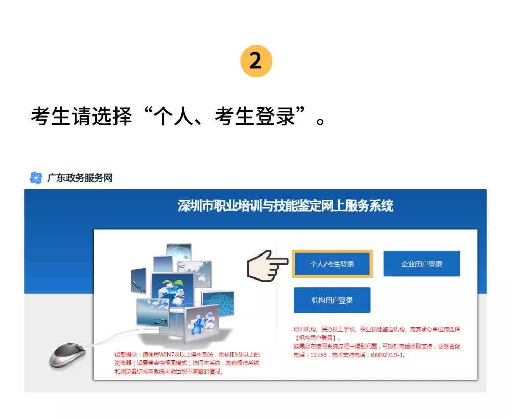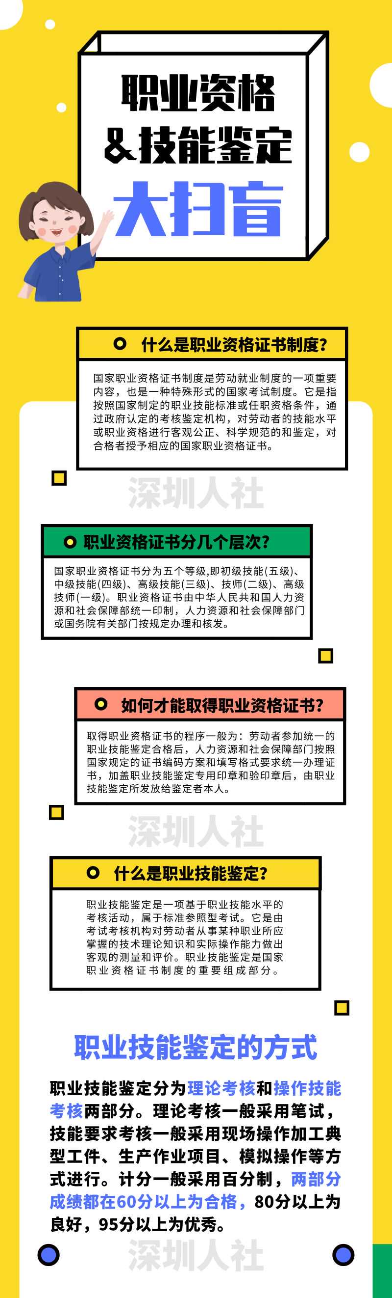 有不少小伙伴留言说 想考职业资格证书要先去哪培训? 怎么参加职业资格鉴定? 可以跨级考或者免考吗? 今天人社君就带大家了解 职业资格证书和职业技能鉴定 (文中附《职业资格评价目录》 和报名及考核日期安排表) 首先! 先来了解一些基础知识 好了! 科普完毕! 接下来看看要怎么 报名参加职业技能鉴定吧! 个人报考 个人报考首先要在网上进行报名 按照系统提示录入报考信息后 记得打印报考回执~ 具体攻略如下 网址: 相关时间点都会在这里显示哦! 网上报名后 大家要在报考周期内 由本人携带规定资料 到报考地点进行资格审核 领取准考证哦~ 报考地点: 福田区福强路1007号深圳第二高级技工学校宿舍楼外一楼 咨询电话: 职业院校集体报考 集体报考的小伙伴就比较省心了 由授权的职业院校 统一录入考生报考信息 统一送审报考资料 统一领取准考证就行啦 还有这些问题 你可能也想知道! Q: 职业技能鉴定单科合格成绩的有效期是多长时间? A: 根据国家有关规定,职业技能鉴定单科合格成绩有效期为两年。应知或应会任一单科考核合格,在二年内(按考试日期算)另一单科考核合格后,可依照相关程序核发《职业资格证书》。 Q: 如果考生取得职业资格证书后,发现个人信息在报考时产生笔误的,能对笔误部分进行修改吗? A: 职业资格证书信息修改及遗失补发的操作页面: Q: 核发职业资格证书需要本人提出什么申请吗? A: 成绩合格且达到核发初级(五级)、中级(四级)、高级(三级)、技师(二级)、高级技师(一级)职业资格证书或专项能力证书条件的考生,考生鉴定成绩合格后,后台自动生成相关数据并打印证书,无需考生申请。 职业资格评价目录 社会化鉴定职业资格和 专项职业能力考核报名及 考核日期安排表 重点来了!!! 有小伙伴问 我知道自己想考啥了 到哪里可以接受正规的培训呢? 进入以下网址就可以下载 深圳市民办职业培训机构名单哦! 有些眼尖的小伙伴可能发现了 免考、越级报考和 技能培训补贴的申请入口 那我们就顺便来说说看 申请这些需要满足哪些条件 免考申请受理条件 向下滑动查看全部条件 申请深圳市职业技能鉴定免考应符合以下条件第一条及第二至五条之一: 第一条:申请的职业(工种)应包含在当年度深圳市职业社会化职业技能鉴定工种目录中。 第二条:具有本专业及相近专业大学本科及以上学历的,参加本职业(工种)或相关职业(工种)培训合格,申报相应职业(工种)技师及以下等级职业技能鉴定,符合相应等级报考条件的,可申请免试理论科目。 第三条:具有本专业及相近初级专业技术资格的,申报相应职业(工种)高级工及以下等级职业技能鉴定,符合相应等级报考条件的,可申请免试理论科目,具有本专业及相近中级及以上专业技术资格的,申报相应职业(工种)技师及以下等级职业技能鉴定,符合相应等级报考条件的,可申请免试理论科目。 第四条:参加国家、广东省以及本市人力资源部门、行业主管部门、总工会主办的职业技能竞赛,获得下列奖项之一,且未核发相应工种技师及以上职业资格证书的,申报相应职业(工种)技师等级职业技能鉴定,可申请免试竞赛文件中设定的竞赛相关科目(理论、实操科目):A.获得国家级技能竞赛表彰的;B.获得省级技能竞赛前十名的;C.获得市级技能竞赛前六名的。 第五条:获得省级、深圳市级技术革新三等奖及以上的,申报相应职业(工种)技师等级职业技能鉴定,可申请免试相关科目(理论、实操科目)。 具体申报流程及材料等 可前往以下网址查看 越级报考申请受理条件 向下滑动查看全部条件 符合以下条件第一条及第二至六条之一的可申请职业技能鉴定越级报考: 第一条:申请报考的职业(工种)、等级应包含在当年度深圳市职业社会化职业技能鉴定工种目录中、已取得申请报考的职业(工种)、等级低一等级的职业资格证书。 第二条:参加国家、广东省以及本市人力资源部门、行业主管部门、总工会主办的职业技能竞赛,获得省级一类竞赛前20名。 第三条:参加国家、广东省以及本市人力资源部门、行业主管部门、总工会主办的职业技能竞赛,获得省级二类竞赛前10名。 第四条:参加国家、广东省以及本市人力资源部门、行业主管部门、总工会主办的职业技能竞赛,获得市级一类竞赛前10名。 第五条:解决本职业(工种)技术操作难题或工艺难题,在技术攻关、工艺革新方面有较大突破或显著成果的主要参与者,并有专利证书、技术评审机构鉴定书等有效证明。 第六条:获得省、市技术革新三等奖以上。 具体申报流程及材料等 可前往以下网址查看 个人申请职业技能培训补贴受理条件 向下滑动查看全部条件 符合以下全部条件的可以申请职业技能培训补贴: 1、属于法定劳动年龄范围(男性16-60岁,女性16-55岁)内的本市户籍人员(全日制在校生、机关事业单位在编人员除外)或在本市连续正常缴交社会保险费6个月以上的异地务工人员。 2、取得培训补贴目录内本市行政主管部门核发的职业资格证书、专项职业能力证书、特种作业操作证(不含复审换证)、特种设备作业人员证(不含复审换证)。通过参加企业技能人才培养评价、政府公益性培训和企业新型学徒制培训取得职业资格证书或专项职业能力证书的个人不予补贴。 3、取得《深圳市职业技能培训补贴补充目录》(以下简称《补充目录》)范围内
