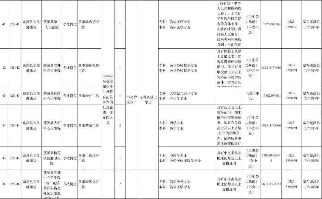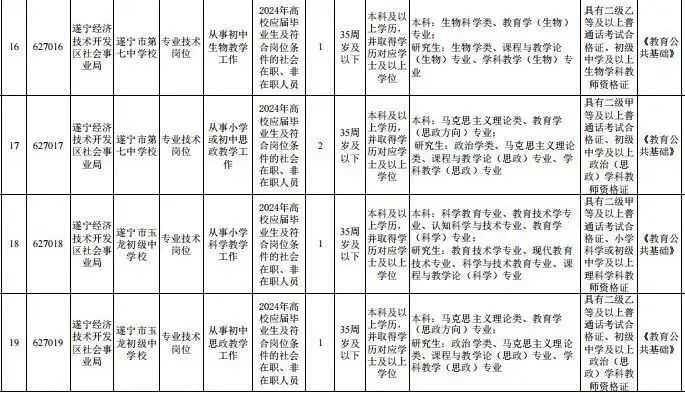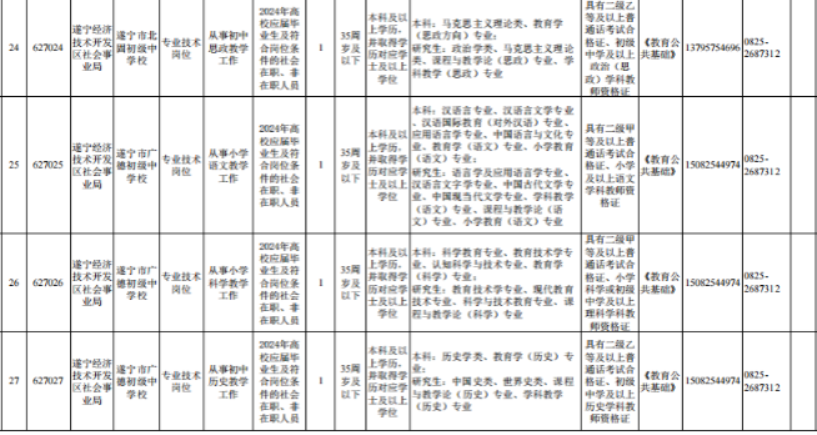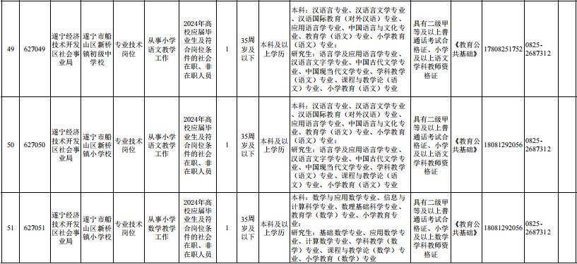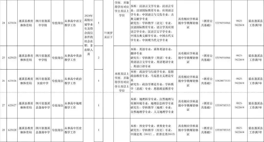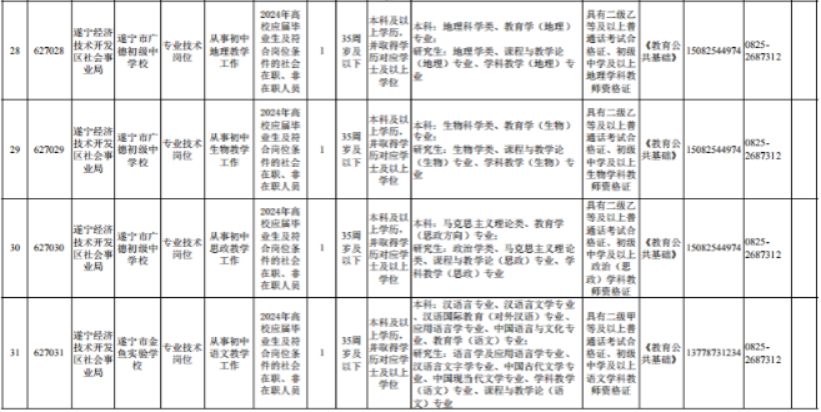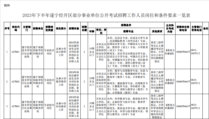 @找工作的小伙伴们 速来围观! 遂宁市、南充市、达州市 阿坝州、凉山州 发布下半年事业单位招聘公告啦! 抓住机会 赶紧报考哦~ 遂宁市 01 招聘人数 本次公招共198个岗位招311人。 02 招聘单位岗位及条件要求 市属事业单位 大英县 高新区 河东新区 经开区 蓬溪县 03 报名时间 2023年10月7日至2023年10月11日18:00截止。 04 报名网站 原文公告及相关附件 扫描下方二维码 ↓↓↓ 上下滑动阅览更多 南充市 根据《事业单位人事管理条例》和省、市关于事业单位公开招聘工作人员相关政策规定,按照“公开、平等、竞争、择优”的原则,南充市决定面向社会公开招聘事业单位工作人员。 01 招聘概况 本次全市事业单位公开招聘名额共956名(含教师和医护人员),其中市本级共148名、县(市、区)共808名,具体招聘岗位详见各公告附件。 02 招聘公告查询网址 南充市人力资源和社会保障局网站“人事考试”专栏-事业人员考试(网址:)。 03 报名方式及时间 本次公开招聘报名采用网络报名方式进行,不组织现场报名。 报名时间:2023年10月7日9:00至2023年10月10日18:00。 04 报名网站 05 笔试科目及时间 具体考试科目、时间和地点详见《准考证》。 原文公告及相关附件 扫描下方二维码 ↓↓↓ 上下滑动阅览更多 达州市 根据《事业单位人事管理条例》《四川省事业单位工作人员招聘工作试行办法》规定及用人单位需求,按照“公开、平等、竞争、择优”原则,达州市决定面向社会公开考试招聘部分事业单位工作人员。现将有关事宜公告如下。 01 招聘职位及人数 本次招聘均在事业单位编制和岗位空缺内进行。全市计划招聘597人,其中:市本级51人、达川区124人、万源市117人、宣汉县66人、大竹县66人、渠县91人、开江县53人、达州高新区25人、达州东部经开区4人。具体招聘职位和人数详见达州市2023年下半年公开考试招聘事业单位工作人员职位表(附件1,以下简称《职位表》)。 ▲扫描二维码查看附件 02 招聘对象及基本条件 (一)招聘对象 面向全国招聘符合本公告及招聘职位资格条件的2024年高校(四川省内技工院校)应届毕业生和社会在职、非在职人员。根据四川省人力资源和社会保障厅等3部门《关于转发〈人力资源社会保障部关于职业院校毕业生参加事业单位公开招聘有关问题的通知〉的通知》(川人社办发〔2021〕75号)精神,四川省技工院校毕业生在符合专业等其他条件的前提下,预备技师(技师)班毕业生可报名应聘学历要求为大学本科的岗位,高级工班毕业生可报名应聘学历要求为大学专科的岗位。 2024年高校(四川省内技工院校)应届毕业生须在2024年7月31日前取得职位要求的毕业证、学位证,并凭证书办理相关聘用手续,在面试资格复审前取得职位要求的执(职)业资格证书、证明等;其他人员须在面试资格复审前取得职位要求的国家承认的毕业证、学位证及执(职)业资格证书,未在规定时间内提供职位要求的证书、证明材料的,视为自动放弃,责任自负。 招聘对象为“具有基层(岗位)工作经历的人员”,是指截至2023年10月7日,报考人员累计在基层(岗位)工作的时间已达到招聘职位规定年限。 基层工作经历是指:(1)在县(市、区)级及以下党政机关、各级国有企事业单位、村(社区)组织及其他经济组织、社会组织等工作的经历;(2)离校未就业高校毕业生到高校毕业生实习见习基地(该基地为基层单位)参加见习或者到企事业单位参与项目研究的经历,可视为基层工作经历;(3)在军队团和相当于团以下单位工作的经历,可视为基层工作经历,其中退役士兵服役时间均为基层工作经历。高校毕业生在校期间的社会实践经历,不能视为基层工作经历。 岗位工作经历是指:在招聘职位要求的岗位上工作达到规定年限,如“2年及以上会计工作经历”。 面向2024年高校应届毕业生招考的职位,除2024年高校应届毕业生外,以下两类人员也可报考:一是国家统一招生的2022、2023年普通高校毕业生离校时和择业期内(国家规定择业期为2年)未落实工作单位,其户口、档案、组织关系仍保留在原毕业学校,或者保留在各级毕业生就业主管部门(毕业生就业指导中心)、各级人才交流服务机构和各级公共就业服务机构的毕业生;二是2024年1月1日至7月31日取得国(境)外学历学位、完成教育部门学历认证且未落实工作单位的留学回国人员。 (二)基本条件 1.报考人员应同时具备下列条件: (1)具有中华人民共和国国籍,热爱祖国,拥护宪法,拥护中国共产党,遵纪守法,品行端正,有良好的职业道德,爱岗敬业,事业心和责任感强。 (2)年龄35周岁以下(1987年10月7日以后出生)。退役军人年龄可相应放宽至37周岁以下(1985年10月7日以后出生)。其他涉及放宽年龄的详见《职位表》。 (3)身体健康,能正常履行招聘职位职责。 (4)具备《职位表》中具体招聘职位要求的资格和条件。其中,报考人员有效毕业证、学位证上的学历学位应与报考职位的“学历学位”资格要求相符。报考职位的“学历”和“专业”应与所需的同一有效毕业证、学位证所载学历学位及其专业名称相符。不符者请勿报考,否则取消报考或聘用资格,责任由报考人员自负。 (5)符合《事业单位公开招聘人员暂行规定》《事业单位人事管理回避规定》明确的相关回避规定。 2.有下列情形之一者不得报考: (1)曾受过各类刑事处罚的。 (2)曾被开除中国共产党党籍的。 (3