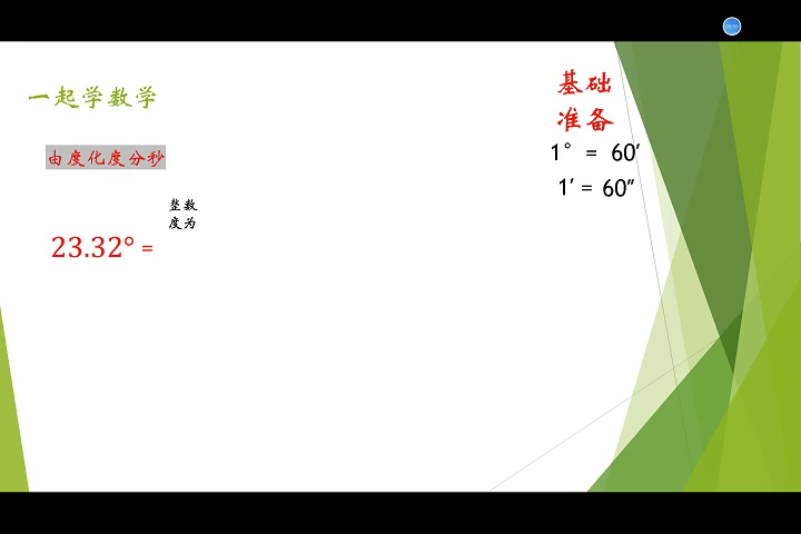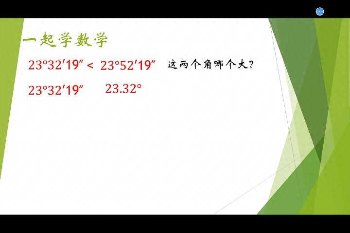 一起学习度分秒与度的相互转化。二十三度三十二分十九秒和二十三度五十二分十九秒谁大?你做对了吗?二十三度三十二分十九秒和二十三点三二度谁大?为什么不好比较?第一个用的是度分秒来表示,第二个是用度来表示,表示方式不一样。 怎么样转化为同一种表示方式?首先学习由度转化为度分秒。二十三点三二度等于多少度?多少分?多少秒?先来完成准备工作。一度等于六十分,一分等于六十秒。二十三点三二度的整数度为二十三度,它的小数点为零点三二度,等于零点三二乘以六十分,等于十九点二分。所以整数分为十九分,小数分就是零点二分。 零点二分等于零点二乘以六十秒,等于十二秒。所以二十三点三二度就等于二十三度十九分十二秒。接下来学习由度分秒转化维度。二十三度十九分十二秒等于多少度?首先由秒划分,十二秒就等于十二秒除以六十得出分,等于零点二分。接下来分化程度,目前有十九点二分了,十九点二分除以六十得出度。把整数度和小数度加起来就是总共的度数,等于二十三点三二度。 你学会了吗?