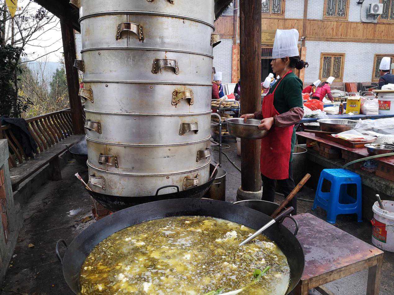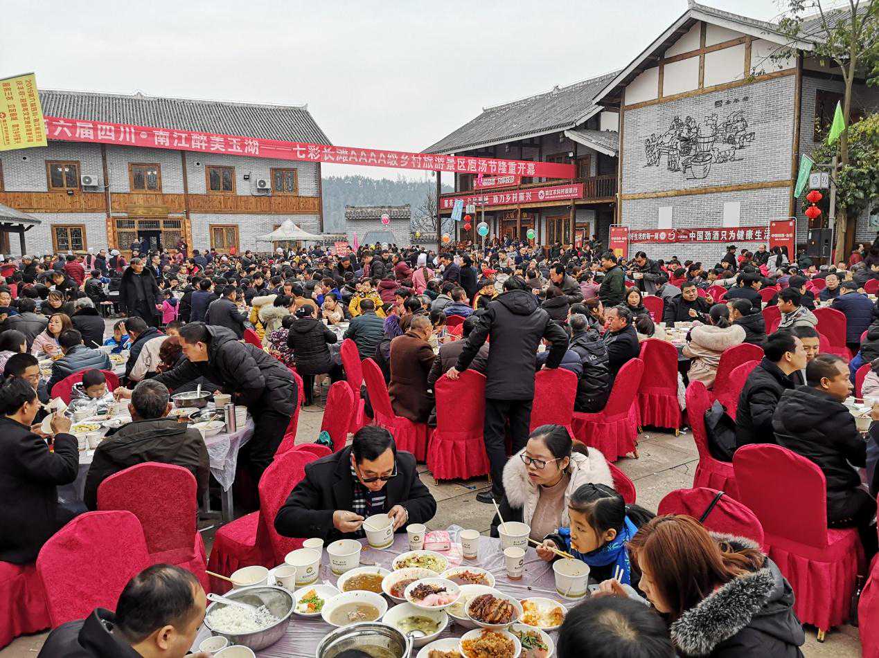 南江县第六届庖汤节开幕式现场 12月29日,长赤中山寨山顶的坝子里洋溢着烟火味、庖汤味和浓浓年味儿。红色的火苗,紧紧的围绕着铁锅,从锅底向四周升腾、蔓延。锅里的庖汤,冒着腾腾的热气,香气四溢。第六届四川·南江醉美玉湖七彩长滩AAAA级乡村旅游景区庖汤节暨庆丰收·迎新年文艺晚会在醉美玉湖景区中山寨举行。 开幕式现场 南江县委书记李本勇宣布开幕。南江县委副书记、县长李善君致开幕辞。开幕式由南江县委常委、宣传部长苟丹主持。 本次节会还有精彩的乡村传统文艺表演和特色商品展销活动。本次活动将持续至2020年1月28日。 南江县委书记李本勇(前排左3),县委副书记、县长李善君(前排左4)出席开幕式 据了解,本次活动旨在深入推动乡村旅游发展,挖掘展示地方民俗特色,助推脱贫攻坚。 文旅强县激活力融合发展谱华章 近年来,南江县委、县政府始终坚持生态立县、文旅强县,深挖红色文化、巴人文化、古道文化、三国文化、民俗文化的独特魅力,融合杜鹃花海、红叶飘丹、溶洞奇景、山水相依、茗兰飘香的秀美景观,成功建成10个“国”字文旅品牌,建成光雾山世界地质公园,入围天府旅游名县创建序列。特别是常年举办22余个文旅节庆活动,旅游人数、旅游收入爆发式增长、屡创新高,文旅融合发展强势崛起。 “既要绿水青山,也要金山银山,南江县坚定‘文旅强县’发展战略,确定了“1234”总体目标,绘制一张蓝图,立足南江文化资源、自然禀赋和旅游优势,围绕打造川东北经济区旅游第一梯队,制定具有科学性、前瞻性、可行性的中长期文化旅游产业发展规划。”李善君表示。 据介绍,到2021年,南江县将实现接待游客突破1000万,旅游总收入突破100亿两个目标。南江县着力建成光雾山国家5A级景区,提升世界地质公园名气,推动光雾山红叶走向世界,提升三大品牌。加快推动四个发展,正确处理文化与旅游的关系,推动融合发展;正确处理事业与产业的关系,推动协调发展;正确处理局部与整体的关系,推动全域发展;正确处理保护与开发的关系,推动持续发展,走出一条独具南江特色“文旅强县”的新路子。 乡愁乡音忆故土除旧迎新品庖汤 长赤,历史文化悠久,自南北朝设县建制,历史1500余年;红色文化厚重,是红四方面军入川最早解放的地区之一;民俗文化浓郁,全国第一家乡愁文化学院、第一家乡愁文化图书馆坐落于此。 当地特产琳琅满目 在镇党委政府的带领下,勤劳勇毅的长赤人民创新作为、开拓进取,坚持以文促旅、以旅彰文、融合发展,激活了文化基因,繁荣了乡村旅游,繁荣了一方经济。 长赤聚焦历史、红色、民俗“三大文化”,做好传承、弘扬、转化“三篇文章”,将长赤建设成为承载乡愁乡音的记忆故土。庖汤,源远流长、历史悠久,油而不腻、回味无穷,寓意吉祥、广受欢迎。 “一年忙到头,喝庖汤就要的是这种热闹劲。”青杠村的张大爷一边娴熟的卷着叶子烟一边和村民唠嗑。 据张大爷介绍,在当地,杀年猪是很有讲究的,先择黄道吉日,避开六日(六代表六畜)还要择杀猪的师傅,并不是每个人都会杀猪的,还得有手艺才行,不然一次杀猪未死,激怒的猪容易伤人。同时,要用刚宰杀的年猪举行传统的祭奠仪式,燃香烧纸,敬圈神。“猪主人”要用草纸蘸猪血粘贴在猪圈板上,并且祷告被杀猪:早死早投胎下辈子投胎做人。鸣放鞭炮,甚为隆重。 杀猪熬汤庆丰年谢邻祝合祈未来 据南江县长赤镇党委书记张晓东介绍,进入农历腊月以后,农民家里都要杀年猪用来过年。过去,村民杀年猪的当天要做一桌以猪肉为主的饭菜,请家族、亲戚和近邻每户的男当家来家里吃庖汤饭,又叫血汤饭。现在逐步发展成为一种文化进行传承。 长赤这种互相请吃庖汤饭的风俗是祖辈流传下来的,一年到头,既是感谢乡里乡亲平时的关照,也是一种化解矛盾的举动,是联络整个家族、亲戚和近邻之间感情的一种方式。同时还是对家人和自己的犒劳,庆祝丰收。“吃庖汤”也就成为人们交流和沟通情感的重要方式,有庆丰年、谢邻里、祝合和、祈未来之意。家家户户就像这一锅庖汤一样,大家沉浸在一番血溶于水的沸腾之中了。 长赤庖汤的做法也极有讲究,首先,先择颈圈内和半肥不瘦的五花肉切成片,还有猪肝,猪血,酸菜,豆腐还有一寸来长的粉肠拌上姜、盐、葱花、蒜粒,胡椒等佐料,等到水烧得滚开以后,放进去熬煮。将年猪的下水煮成了上上品熬制出浓郁的喜悦。