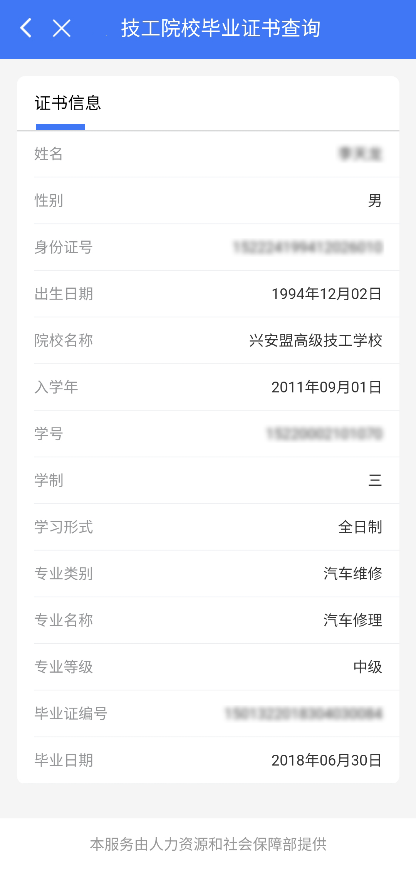 好想再回到那些年的时光…… 小张,哼得这么起劲,是不是想回学校了呀? 是啊,又到毕业季了,都在晒毕业照,忆往昔峥嵘岁月稠啊! 告诉你一个好消息,电子社保卡上线技工院校毕业证书查询了,来查询一下,感受往昔时光吧! 这个好啊,快告诉我怎么用。 好,我们来详细了解一下。 听说技工院校也分好几种,毕业证书一样吗?您先给我介绍一下吧。 技工院校毕业证书是证明学习经历的书面凭证,由各省级人力资源社会保障厅(局)印制,按学校办学层次分为三种,分别是:技师学院毕业证书、高级技工学校毕业证书、技工学校毕业证书。 在这个注重学历的时代,我这个毕业证书含金量高吗? 您这可是手握金砖呢!国家这几年在大力发展技工教育,培养技能人才,满足国家发展需要。技工院校毕业证书是用人单位招聘录用劳动者、确定其工资标准的主要条件,是从业人员职称评定、职位晋升等方面重要依据。你看这作用多大!给你举2个例子: (1)找工作增加就业砝码,增强竞争力。 (2)升职加薪,技能不可或缺。 太好了,现在就来查查看。我都毕业三年了,能查到吗? 目前系统可以查询验证毕业时间为2015年6月30日及以后的全部技工院校毕业证书信息。具体可查询到的内容,包括院校名称、专业类别、专业登记等,不仅可供本人查询,还可满足各类毕业证书真伪核验的场景需要。 通过电子社保卡怎么查询,操作简单吗? 个人从已开通电子社保卡的363个服务渠道可以进入电子社保卡服务页面进行查询,如国家政务服务平台、国务院客户端微信小程序、掌上12333,工、农、中、建、交、邮储、招商、平安等各大银行,支付宝、微信、云闪付等APP或小程序等,以及各地人社部门、合作银行、政务平台的APP或小程序。 查询页面 查询结果 我知道现在电子社保卡开发了访客模式,是不是也能查毕业证书呢? 尚未申领电子社保卡的人,可以通过电子社保卡获得网点查询、渠道查询等通用服务,此谓访客模式。而技工院校毕业证书查询涉及较多个人信息,必须申领电子社保卡再来使用,以有效保护您的个人隐私及信息安全!所以,赶紧申领电子社保卡,解锁更多服务功能吧! 除了手机,在电脑上可以查询技工院校毕业证书吗? 个人可访问全国技工院校毕业证书查询系统()进行查询,也可以登录人力资源社会保障政务服务平台()后进行查询。 往期回顾 方便用|教你活学活用电子社保卡的扫一扫与二维码 方便用便利查|用电子社保卡亮证服务查看社保卡电子证照 方便用便利查|电子社保卡移动支付助你线上缴费支付和就医购药结算 方便用便利查|电子社保卡亲情服务让家人也能享受贴心线上服务 方便用便利查|如何用电子社保卡办理失业登记? 方便用便利查|就业创业证可通过电子社保卡查询啦! 方便用便利查|社保缴费知多少?打开电子社保卡查查社保权益记录单 方便用便利查|教你用电子社保卡办理社保关系转移 方便用便利查|快来用电子社保卡测算一下您未来的养老金 方便用便利查|用电子社保卡办理养老保险待遇资格认证真方便 方便用便利查|知否?用电子社保卡可申领失业保险待遇啦 方便用便利查|打开电子社保卡可查询职业资格证书啦! 方便用便利查|专业技术人员考试成绩可用电子社保卡查询啦 转发请注明