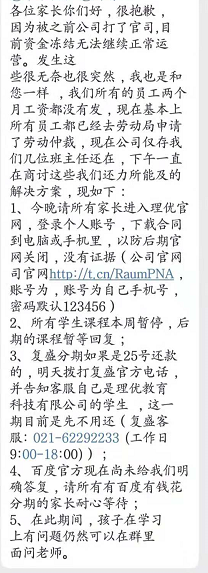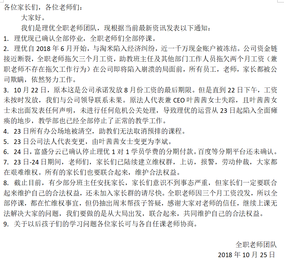 理优教育的logo 注:本文内容主要来自铅笔道记者采访和网络公开信息,论据难免偏颇,不存在刻意误导。 10月24日,上海理优教育科技有限公司(下称“理优教育”)在公司的玻璃门上贴出一张关于公司“停课停运”的通知。公告大意为,理优教育因上海淘米网络科技有限公司的民事起诉,公司账户被司法冻结近1000万元,导致公司现金流断裂,现在决定公司从10月24日期暂停营业,所有学员暂停上课。公告还显示,公司正寻求新的资金注入,并且向有关政府部门申报备案。 理优教育大门口张贴的通知 公司的大门上同时还张贴着工资延迟发放还有拖欠物业房租、水电费、物业费等相关费用的通知,物业在告知书中称,即日起终止与该公司的租赁关系,收回租赁房屋。 物业张贴的通知,房屋已经收回 据多方信源显示,理优教育拖欠部分员工薪资最长时间达3个月,公司办公电脑为租赁物品,现已悉数收回。除了部分兼职老师,机构已全线停课。10月25日,部分家长和教职工已经设法维权,走仲裁。 铅笔道通过多方信源了解到此事情况,尽可能还原事件本身。 理优教育武汉分部全职教师张乐(化名)对铅笔道讲述了事件,这位老师在理优入职1年有余,被欠薪2.4万左右。“目前,我们统计的教师内部数额,武汉员工大约70多个,欠薪170多万,上海那边的老师被欠了200多万。被欠薪的老师有一个维权群,群内成员人数已经达到176人。可以确定的是,两边都已经发起仲裁。欠薪三个月,大部分全职老师被迫停课,甚至辞职,学生也无法上课。”另外,他表示,“任何高管和我们直接联系”。 铅笔道获得一张理优班主任群内公告截图,公告告知群内的老师,理优教育高层通过中层领导告知机构教职员工,本周日或者本月份底会给出最终结果,公司可能被收购兼并或者宣布破产。 对此,一名理优教育老师表示,公司有可能会被卓越教育收购,太具体的情况就不清楚了。公开资料显示,卓越教育集团起步于2000年6月,是一家中小学校外辅导培训机构,主要面向3-19岁的中小学生提供学科的素质教育,机构开设了100多个校区,课程范围涵盖辅导班、全日制高四、全日制初四等,也包括1对1在线课程。 卓越教育的课程内容涵盖1对1 卓越教育在2010年12月获得红杉资本的1000万美元融资,2018年6月29日,该公司已经向港股递交上市申请。卓越教育在招股说明书中业务战略写道:计划继续维持并巩固我们在中国K12课外教育市场的领先地位。 卓越教育的招股说明书 从群公告中看到,理优教育的兼职老师人数为400-500人、全职老师70-80人、全职员工人数为300-400人,高层领导5-8人、销售部门100-200人……对于理优教育的招聘要求,一名老师说道:“全职老师需要笔试、面试,还需要出示一系列证书包括教师资格证,兼职老师相对比较容易,部分兼职老师是没有教师资格证的”。理优教育学员人数为4000到6000人,因为是线上教育模式,学员地域几乎涵盖全部各个省市。 铅笔道联系到理优教育一名负责初中数学的全职老师小敏(化名),她讲到自己是1月中旬入职的,在理优教育工作十个月。“这边工资蛮高的,一个月上150节课收入差不多七八千的样子,上到180节课时,收入差不多到1万”,“一个小时按照1.5个课时计算,周一到周五每天晚上上两个小时的课,周六、日上课十个小时左右。因为我们属于校外培训机构,所以节假日的课时最多”。谈及机构的公司发放情况,他说“公司之前的业绩一直蛮好的,全职老师的课时费是隔月发放的,按照往常,10月份是要发8月份的课时费,但拖延到了现在,公司高层一个都联系不上。” 机构宣布停止运营前夕,家长有要求退款吗?小敏说:“公司出事后,官方没有任何声明。所有的情况都是机构的老师、班主任、助教去通知家长的。有些班主任担心家长闹事,自己拿不到钱,会刻意隐瞒家长说‘我们现在还没有垮掉,可以继续上课’,然后道德绑架老师去上课。因为内讧,所以一开始的维权是很艰难的”。对于维权这块,小敏表示,“上海和武汉的员工都已经去劳动局、仲裁局,还有信访,家长们自发建立了很多维权群,也已经报警、提起诉讼,该做的都做了……但是维权很难。” 10月25日,理优教育全体老师面向家长发出一则通知,向家长正式公布了理优教育正式停业,还有机构从2018年6月开始和淘米陷入经济纠纷等情况。其中讲到公司原法人兼CEO叶茜茜失踪且从未出面发表任何声明,机构这边也没有危机公关处理,10月23号,理优运营已经陷入瘫痪状态。通知内容还包括家长学费分期贷款的处理问题。10月24日,富盛分云已经确认停止对理优学员的分期付款。百度有钱花也是理优教育的分期业务合作方,当时的百度有钱花还未确认。 理优教育全体教职工通知家长停运、停课的消息 张乐还提到,“明明已经停运、停课,机构并没有关掉系统,技术部门已经解散,家长的课还在照常被扣掉。”课还在照常扣除,百度分期要照常还款,这位家长与老师的聊天记录中透露着无奈…… 家长的聊天记录 另一名家长表示,2017年7月,第一次买理优教育的课程,当时买了270课时,花费20364元,首付3500元,剩余用了百度12期分期。随后在2018年8月底,续费240课时,一次性支付18400元。已经上了108课时,还欠432课时。 家长的聊天记录 家长的还款账单 那么学员的收费标准如何呢?张乐说:“助教老师负责招生,公司学费的收费标准是由上海总部的助教老师按照