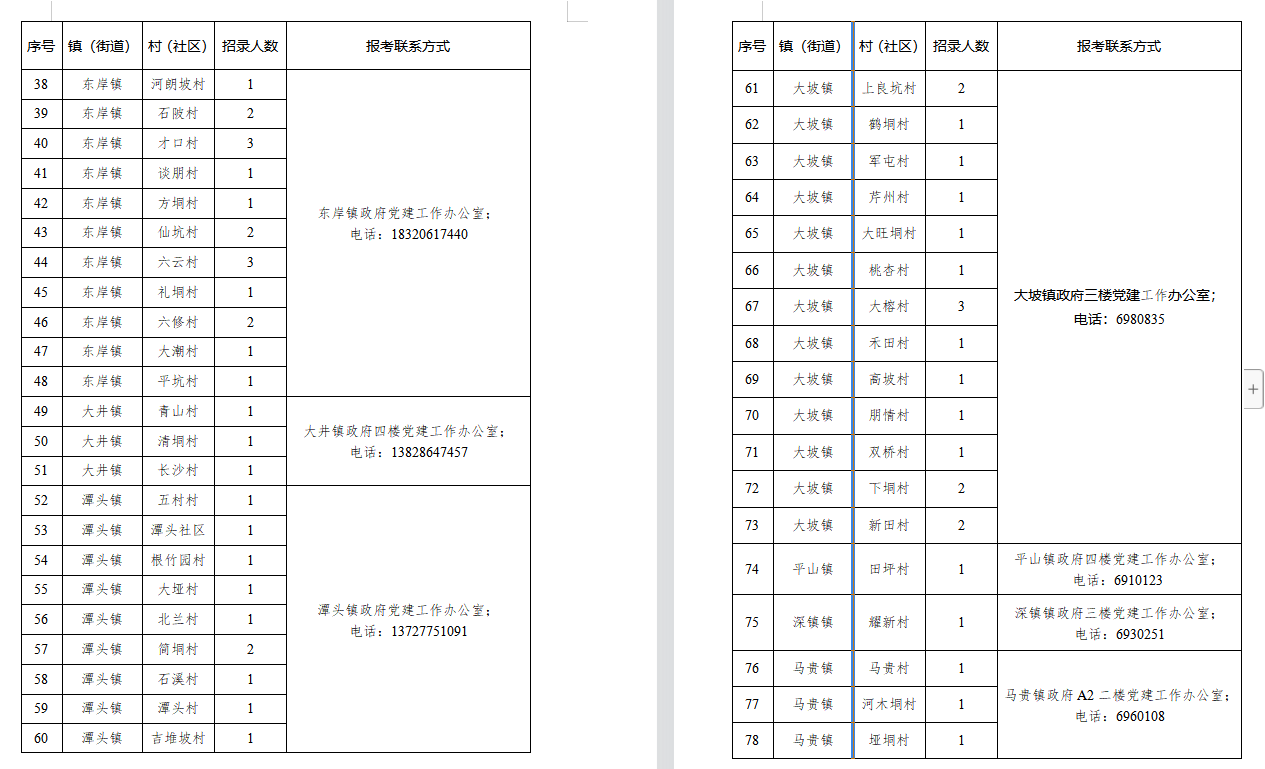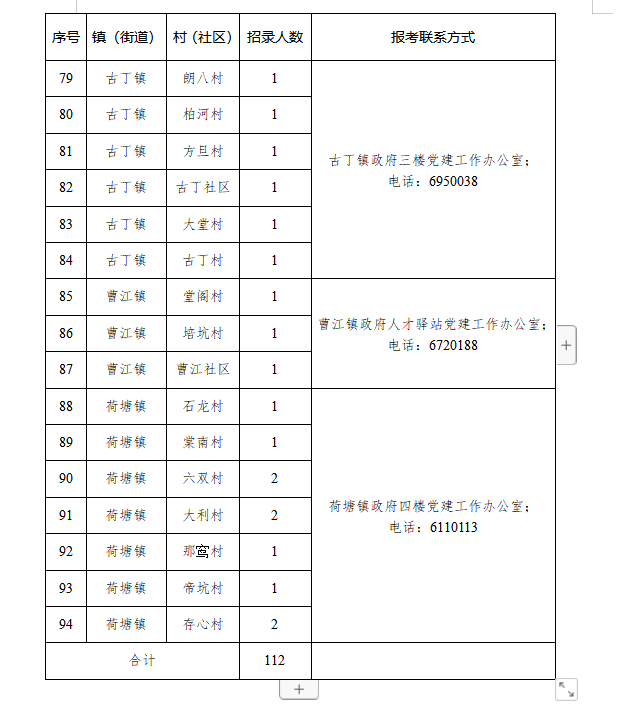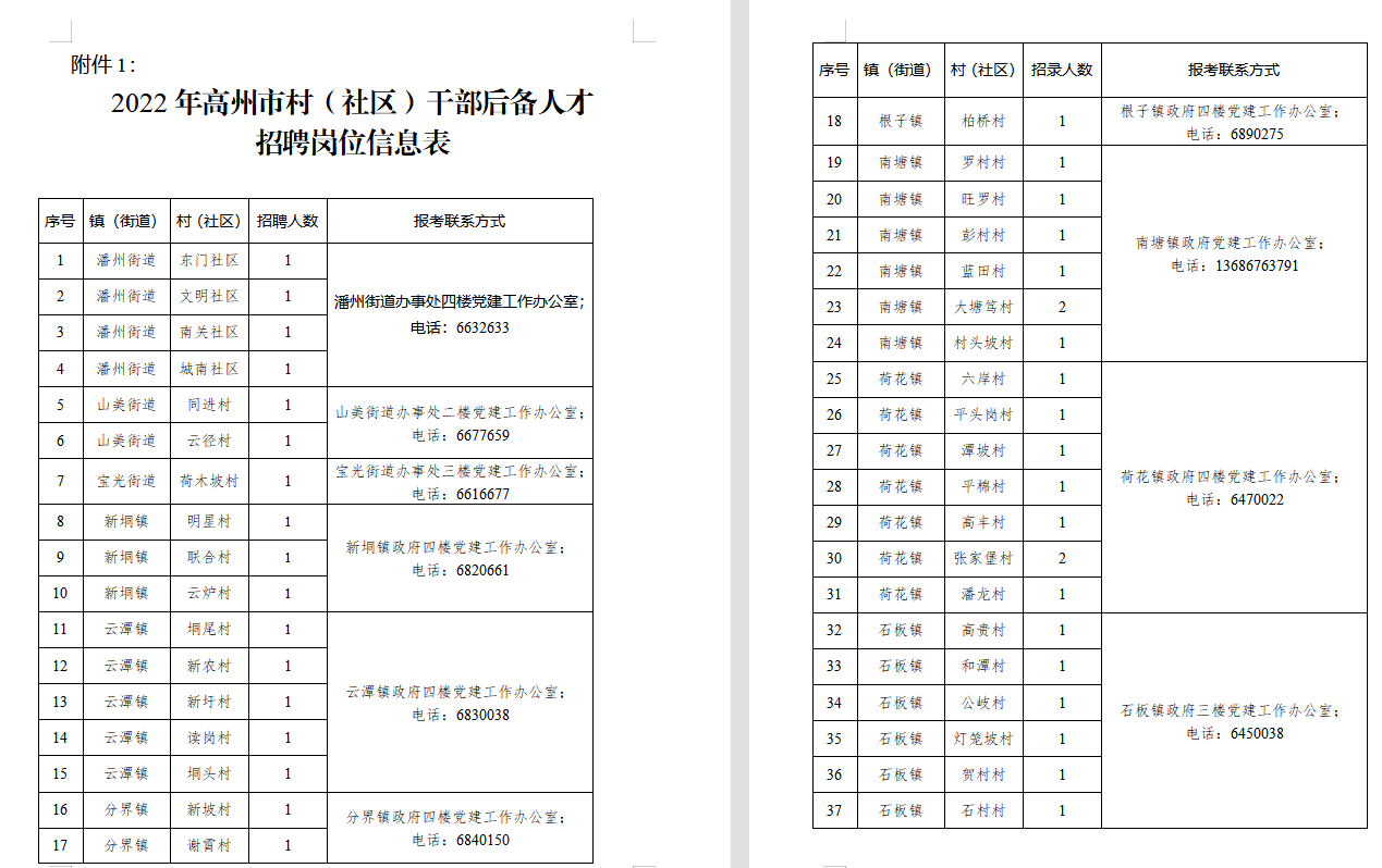 4月26日,高州市发布《2022年村(社区)干部后备人才招聘公告》,为优化村级干部队伍结构,加强村级后备力量储备和培养,决定在有关镇(街道)开展2022年村(社区)干部后备人才招聘工作。 《公告》指出,本次共计划招聘112人,涉及20个乡镇,通过笔试、计算机基础能力测试、面试等方式择优录取,对拟招聘人员,将由镇(街道)党(工)委在所报考的村(社区)公示不少于5个工作日。 招聘岗位 报考条件 (一)拥护中华人民共和国宪法,拥护中国共产党领导和社会主义制度。 (二)具有良好的品行。 (三)愿意为村(社区)群众服务。 (四)身体健康,年龄在18周岁以上、45周岁以下(1977年5月至2004年4月期间出生)。 (五)具有高中(含中专、中职)及以上学历(报考社区干部后备人才的须具有大专及以上学历)。 (六)报考人员户籍须在所报考的村(社区);非户籍人员须在该村(社区)居住一年以上,并经过该村(居)民会议或村(居)民代表会议同意方可参与报考。 (七)报考人员与所报考的村(社区)“两委”班子成员、村(居)监督委成员有三代以内旁系血亲关系以及近姻亲关系的,由镇(街道)党(工)委集体研究决定报考资格。 报名时间 4月26日至5月13日,上午8:30-12:00,下午2:30-5:30。 报名地点 招聘岗位所在的镇(街道)党建办。 报名方式 报名人员到所报考的镇(街道)党建办填写《2022年高州市招聘村(社区)干部后备人才报名表》(或自行上网双面打印填写并提交到报考岗位所在的镇党建办),同时按要求提供身份证复印件1张、毕业证原件与复印件1张(审核后当场返还原件)、2张大一寸免冠彩色照片等材料。 【撰文】邓美芸