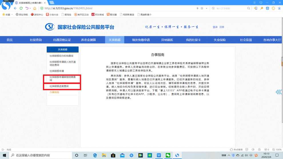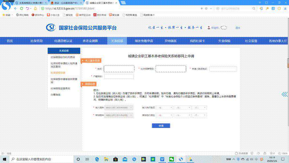 您从外省市来到天津市工作,参加城镇企业职工养老保险后,如需要办理养老保险关系转移,推荐使用国家社会保险公共服务平台和“掌上12333”、支付宝、微信等具有电子社保卡功能的手机APP办理。也可以到天津市社会保险中心各分中心柜台办理,我们的工作人员将协助您办理养老保险关系转移业务。下面小编将为您介绍通过“国家社会保险公共服务平台”和“掌上12333”手机APP办理养老保险关系转移的操作流程。 国家社会保险公共服务平台 1首先登录国家社会保险公共服务平台(网址),进行用户注册。 2注册完成,再次进入主页,选择“关系转移”。 3阅读办事指南,选择“社保转移申请”。 4填写个人信息,提交申请。 5提交申请完成后,可通过“社保转移申请审核”查看审核结果。审核通过的,社保分中心将向外省市社保经办机构发送《联系函》,办理后续业务。后续业务的办理情况可以通过“社保转移进度查询”查看。审核不通过的,您可以查看不通过原因,重新提交转移申请。 “掌上12333”手机APP 1首先下载“掌上12333”手机APP进行注册。 2通过“掌上12333”手机APP办理,选择“社保转移申请”,填写个人信息,提交申请。 温馨提示 1.城镇企业职工养老保险关系转移业务网上申请,无需提供要件,工作人员审核情况后,如需核实相关信息,会主动与您进行电话联系。 2.如您未在我市参加城镇企业职工养老保险,请先进行参保缴费后再办理转移。如果您已经到达待遇领取条件的年龄,尚未领取养老保险待遇且我市为您的待遇领取地,请您进行参保登记后再办理转移业务。