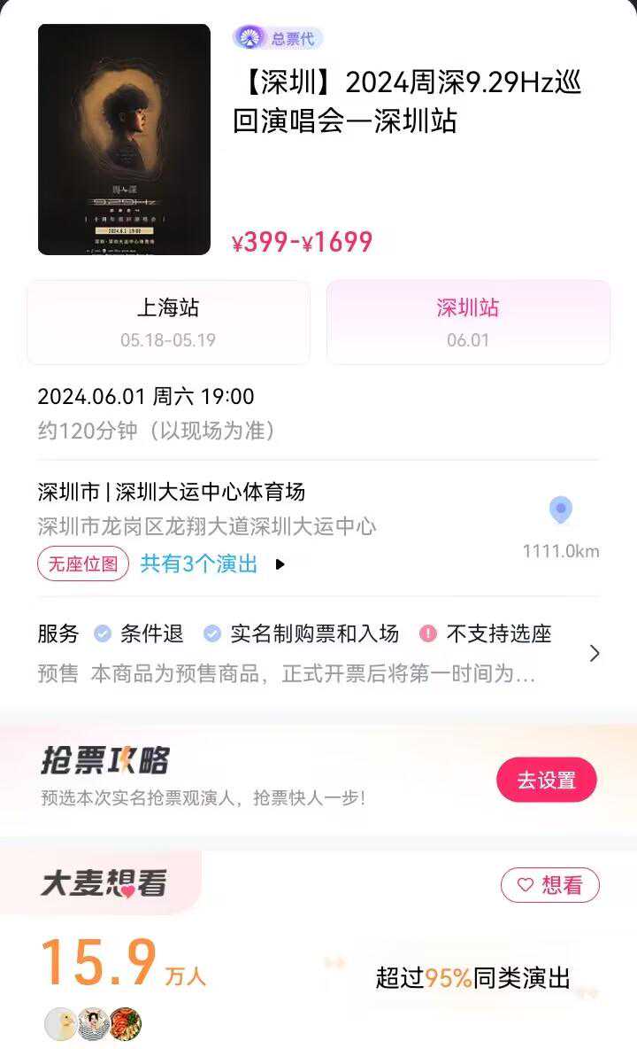 今年的演唱会市场非常有意思啊,头部这边我们就不多聊了,周杰伦、林俊杰等歌手的影响力已经非常稳定了。 今年年轻一代体育场的格局,倒是目前有了一个大概雏形。 说起来,和笔者预测的差不多,今年的年轻一代体育场,主要还是看这三位歌手。 01 这三位歌手,分别是邓紫棋、华晨宇和周深。 目前还不存在谁领先谁落后的说法,毕竟演唱会公布时间不同。 邓紫棋这边是已经刷了很多场体育场了,并且普遍在二级平台都是溢价的状态; 而华晨宇的烟台演唱会同样之前也和大家分析过,在二级平台处于高倍溢价状态; 最后则是周深,周深最近公布了自己的巡演具体场次:目前公布的,都是体育场! 一来就开体育场,说实话,周深以及他的团队是足够自信的,并且目前的各方面人气来看,周深是撑得起来的。 02 首先在首发平台方面,周深的演唱会在热搜榜上面是处于“爆”的状态的。 这其实就彰显了平台方对周深的重视,同时也能看出大众普遍对周深演唱会还是比较感兴趣的。 上海站目前的想看人数为32.9万人,这个数据后续还会继续增长,并且由于是排序第一的场次,上海站是有希望能够在正式开票的时候突破50W的。 相较于其场地需要的几万人,这个数据显然是足够支撑一场演出了。 只是最终的转化率到底如何,我们还需要观察二级平台的情况。 深圳站的想看人数为15.9万人,相对于上海就低了一些,但是却也是属于能接受的数据。 至于成都和贵阳两站,则是处于筹备中,具体时间还不清楚。 总之,两场体育场的想看人数,已经是暴露了他的真实影响力。 我个人认为,如果基于这个数据去看,周深撑起一轮体育场巡演是完全没有任何问题的。 最关键的是,周深的团队应该重视选曲,同时由于是体育场队伍的新人,一定要把音响以及看台视野这些细节问题做好,不要给人“嘲”的机会。 03 其实各位看笔者之前的文章就会发现,我一开始都没想过周深会全面体育场,毕竟这其中的难度有多大我是非常清楚的。 一开始猜测会是体育馆加体育场,而如今海报显示多场体育场,或许也说明,周深是真的想要让所有粉丝和歌迷都能够看到演唱会。 并且,团队必然是做了数据分析的,体育场动员人数高达几十万 喜欢文章的朋友可以点赞并分享噢!