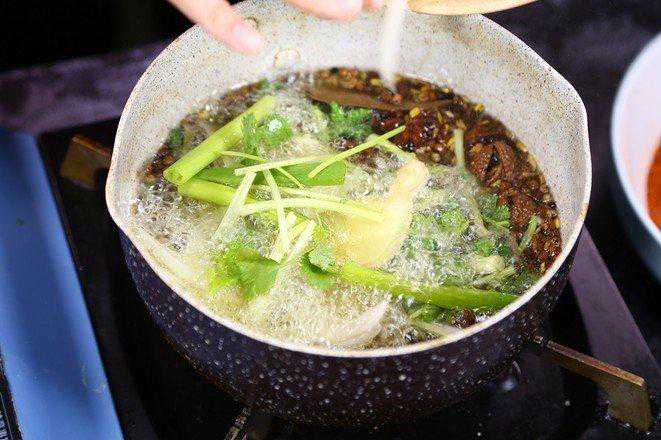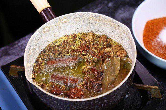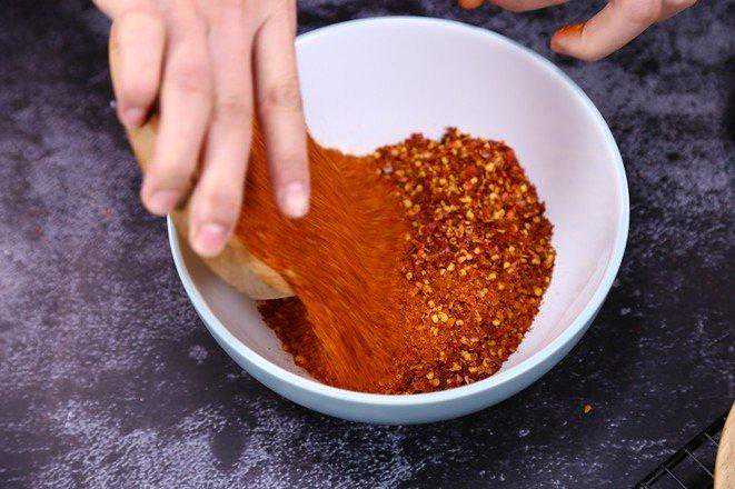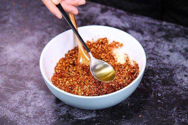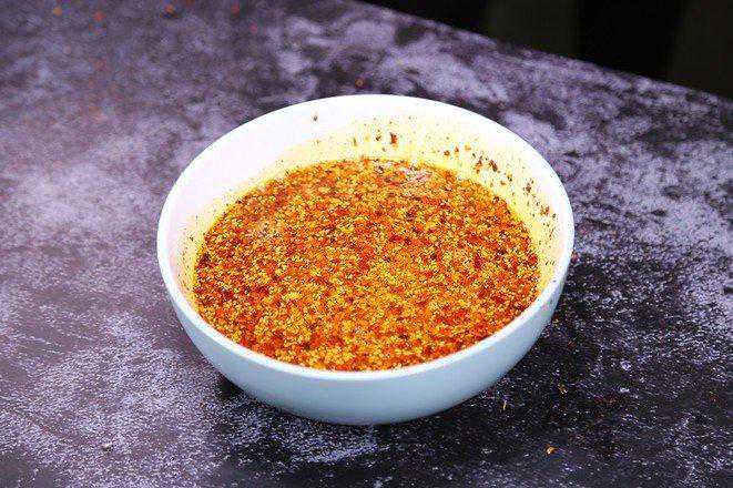 滋啦滋啦的声音让人沉醉,烫好的辣子飘香四溢,奥妙无穷。 食材:细辣椒粉带籽辣椒末菜籽油花生碎白芝麻花椒大料香叶桂皮陈皮大葱蒜头姜片盐醋适量 1.碗中准备一半细辣椒粉、一半带籽辣椒末 2.接着放入一大勺白芝麻,一大勺花生碎,一小勺盐搅合均匀 3.锅中烧菜籽油,温热的时候加入花椒大料等香料炸香 4.加入姜片、大葱、蒜头 5.小火炸黄捞出,再大火烧热,静置1分钟 (油温很重要,就是油面有些许青烟,放上根儿筷子能有小泡泡出现但不明显就可以关火了) 6.勺子舀油逐步加入到步骤2中的辣椒末里搅匀 7.把剩余油一起倒入到碗里搅匀 8.最后撒一勺醋提香