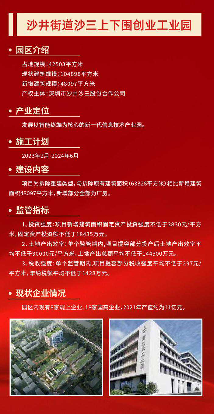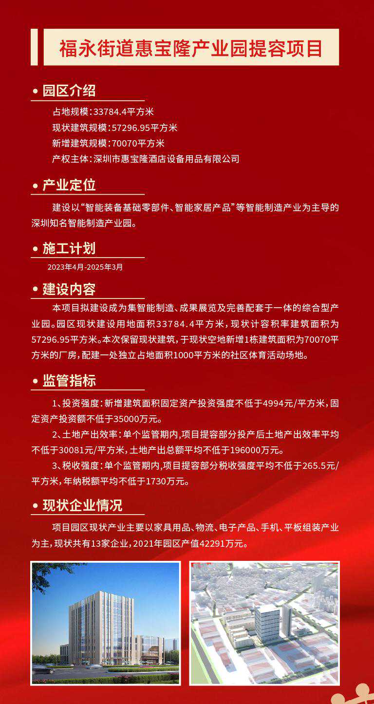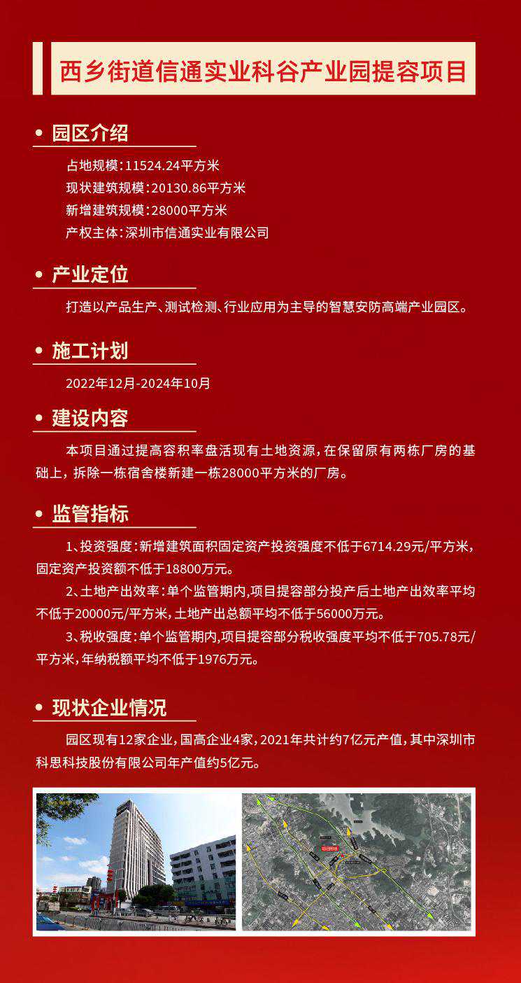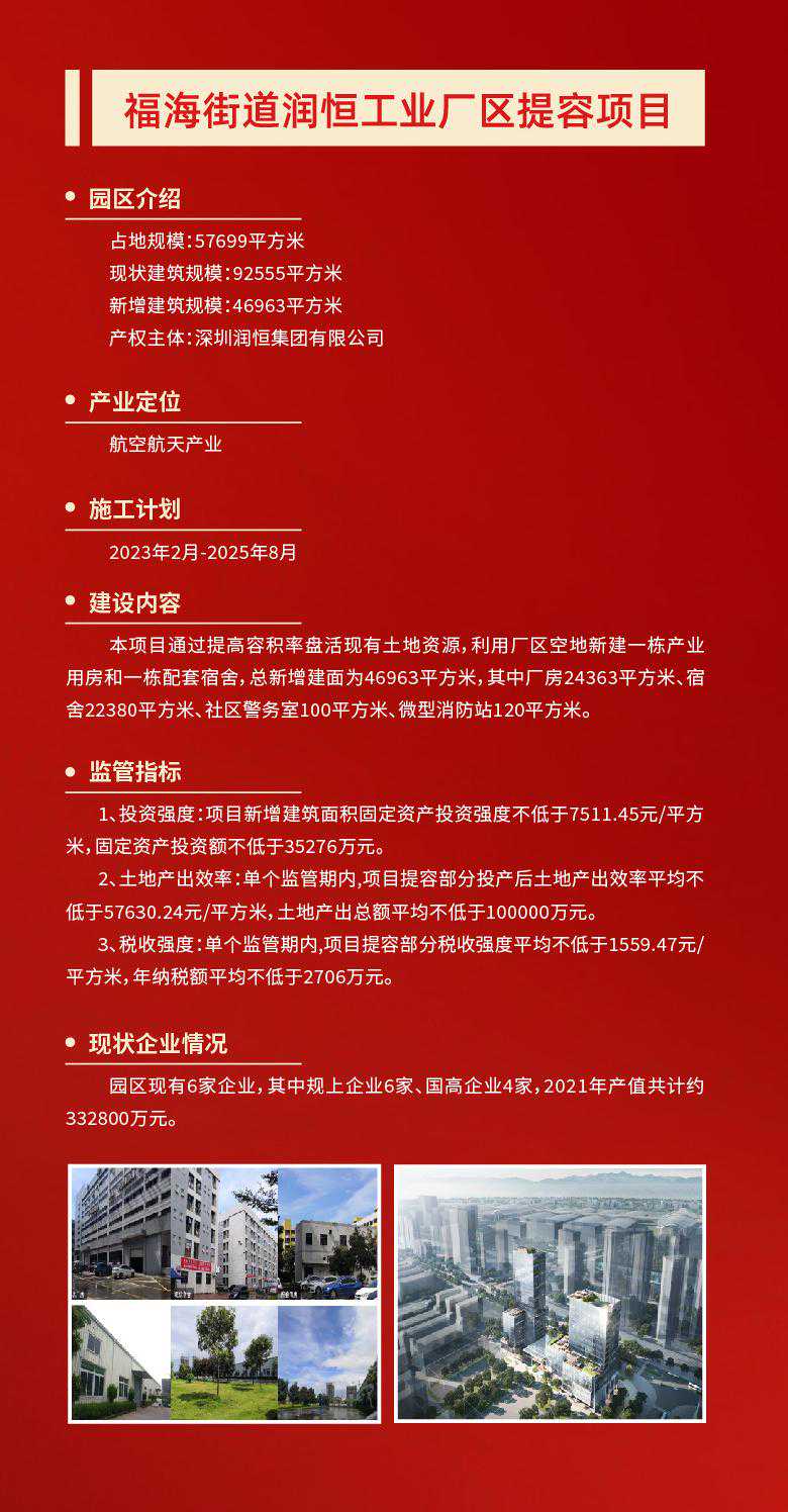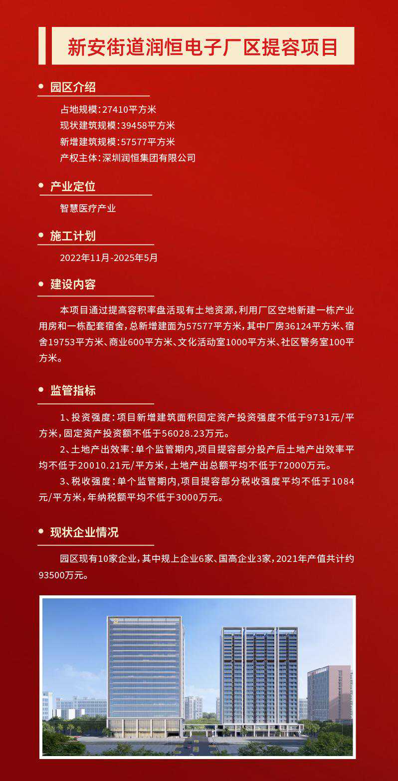 产业空间是城市经济活动的核心载体。作为深圳的产业大区,打造高质量产业空间,是宝安迈向世界级先进制造业高地的重要保障。 12月2日,润恒智慧医疗产业园开工奠基仪式在宝安区新安街道举行。项目完工后,园区将新增3.6万平米产业空间、2万平米配套宿舍,将在原产值基础上新增年产值7.2亿元、新增年纳税3000万元。 不止是润恒智慧医疗产业园,今年宝安在全区筛选了50个产业园区作为提质增效试点项目。项目完成后,可新增产业空间347万平方米,优化产业空间207万平方米,预计总投资309亿元。 宝安,正通过盘活产业空间,实现“空间等企业”,让好项目有地可落,以优质产业空间提升先进制造业发展能级。 润恒智慧医疗产业园占地约2.7万平方米,总建筑面积约3.9万平方米。园区现有10家企业,其中规上企业6家、国高企业3家,去年总产值约9.4亿元。 园区容积率只有1.4,土地使用效率不高,相关配套设施欠缺,影响了园区与企业的进一步发展。产业园区提质增效,向存量要空间,成了润恒智慧医疗产业园的必走之路。 当天的开工奠基仪式上,深圳润恒集团有限公司董事长赖汉宣透露,园区将通过提高容积率,盘活现有土地资源,利用厂区空地新建一栋产业用房和一栋配套宿舍,总投资额约5.6亿元,预计2025年5月建成投产。 “项目完工后,将新增3.6万平米产业空间、2万平米配套宿舍,将新增年产值7.2亿元、新增年纳税3000万元。”赖汉宣说道。 润恒智慧医疗产业园提容类项目的开工,正是宝安为贯彻落实深圳关于“盘活空间、提质增效、集约发展”战略部署的缩影。 当前,宝安共有产业园区2022个,数量全市第一。园区占地面积为5646.71万㎡,产业用房总建筑面积为9736.49万平方米(纳入园区内产业用房面积8464.6万㎡),位居全市第一,全区产业园区平均容积率1.50。 由此可见,宝安区产业空间体量庞大,潜力巨大。因此,为了向向存量要空间,向低效要效益,今年宝安在全区筛选了50个产业园区作为提质增效试点项目。 项目完成后,可新增产业空间347万平方米,优化产业空间207万平方米,预计总投资309亿元。其中,提容类提质增效试点项目10个,预计可新增产业空间65万平方米,预计总投资约53.05亿元。 抓产业园区提质增效的同时,宝安也抓土地整备,为产业发展腾挪空间。 据了解,宝安全年预计完成427.36公顷(市对区任务完成率187%),其中产业用地预计完成132.71公顷(市对区任务完成102%)。目前已完成297.45公顷,其中产业用地94.18公顷,产业用地整备量位居全市第一。 此外,宝安通过产业遴选挂牌出让12宗产业用地,占地约45.91公顷,建筑面积约149.28万平方米,供地数量全市第一,预计总投资359.07亿元、年产值1185.28亿元。 记者了解到,今年2月宝安印发了《宝安区产业园区提质增效工作方案》。《方案》提出未来三年,宝安将建设成“一十百千万”园区布局体系。其中,一包括一地图、一规划、一政策,十即十个示范性园区,百是百万平方米产业保障房,千指千万平方米空间增量,万为万亿级产业生态。 附:宝安十个提容项目情况