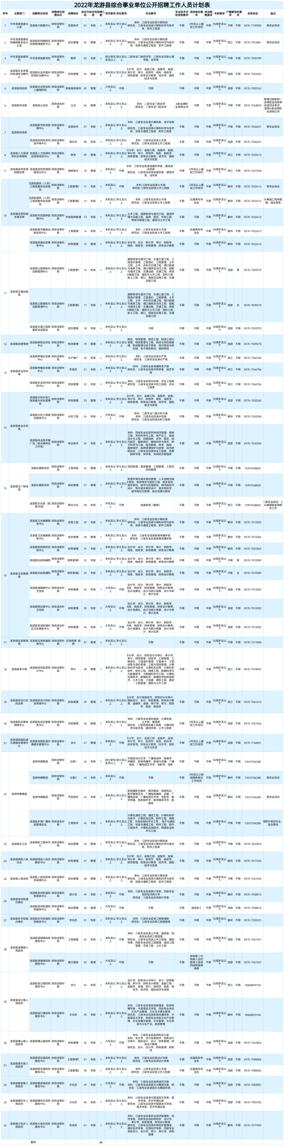 2022年龙游县综合事业单位公开 招聘公告新鲜出炉 63个事业编岗位虚位以待 速看 01 招聘范围 1.本次招聘面向大专及以上学历的毕业生,部分岗位对学历学位有特殊要求的,按其要求执行。其中:户籍要求为“浙江”的,面向浙江省户籍或生源人员;户籍要求为“衢州”的,面向衢州市户籍或生源人员;户籍要求为“龙游”的,面向龙游县户籍或生源人员;户籍要求为“不限”的,面向全国范围招聘。 以上户籍以2022年5月6日的户口所在地为准。生源地是指经高考、被高校录取时户口所在地。 2.硕士研究生及以上毕业生、或“一流大学建设”高校全日制本科及以上毕业生、或“一流学科建设”高校相关专业全日制本科及以上毕业生报考的,不受户籍限制。 3.岗位代码12、14、57、58的4个岗位面向应届高校毕业生专项招聘,仅应届高校毕业生可报考,其它岗位应届和非应届毕业生均可报考。应届高校毕业生是指2022年全日制普通高校应届毕业生,2020年、2021年全日制普通高校毕业生、2020年1月至资格复审前取得国(境)外学历学位并完成教育部门学历学位认证的留学回国人员以及2022年毕业由学校统一进行就业推荐和毕业派遣的非全日制研究生视同对待。 4.部分招聘岗位所要求的“2年及以上基层工作经历”是指:在各类企事业单位和其他经济组织、社会组织和生产一线、农村、县级以下机关(含参公事业单位)工作,或曾在军队服役、自谋职业、个体经营累计2年以上的经历。大学生“村官”等服务基层项目人员服务基层时间计入基层工作经历。在全日制学校就读期间参加社会实践、实习、兼职等不能作为基层工作经历。 本次招聘所涉及的工作经历时间、离开岗位时间等均计算到2022年5月6日。 2022年全日制普通高校应届毕业生须在2022年9月30日前提供相应的学历、学位证书。 通过高等教育自学考试、成人高等教育等非全日制高校学历考试的人员,须在2022年5月6日前取得并提供毕业证书。 02 报考条件 1.具有中华人民共和国国籍,遵守国家宪法、法律、法规; 2.愿意履行事业单位工作人员的义务,遵守纪律,品行端正; 3.身体健康; 4.性别、年龄、学历、学位、专业等符合招聘岗位所需的资格条件(详见附件1,其中35周岁及以下指1986年5月6日及以后出生,30周岁及以下指1991年5月6日及以后出生)。 5.公务员、参公人员、现役军人不能报考;在全日制普通高校就读的非2022年应届毕业生不能报考,在全日制普通高校脱产就读的非2022年应届毕业的专升本人员、研究生也不能以原已取得的学历、学位证书报考。 6.因犯罪受过刑事处罚的人员、被开除中国共产党党籍的人员、被开除公职的人员、被依法列为失信联合惩戒对象的人员,在各级公务员招考(事业单位招聘)中被认定有舞弊等严重违反录用纪律行为的人员,以及法律法规规定不得聘用为事业单位工作人员的其他情形的人员,不得报考。 7.报考人员不得报考与招聘单位有《浙江省事业单位公开招聘暂行办法》(浙人才[2007]184号)第三十条所列回避情形的岗位。 8.本县事业单位在编工作人员需经现人事关系所在单位及其主管部门同意后方可报考,并在报名时提供同意报考的函件(详见“阅读原文”中附件3)。 03 报名及相关 本次招聘采用网上报名方式,不设现场报名。 1.注册及报名 时间:2022年5月2日9:00—5月6日17:00。 报名网站:浙江平台()。 报考人员上网注册个人信息后,选择单位和岗位报名并按要求上传相关资料,逾期不再受理注册及报名。仅注册未选择报考岗位、更改个人信息后未重新选择报考岗位均视为报名无效。报考者填报的资料须真实可靠,如有弄虚作假、信息不实,经查实一律取消考试或聘用资格。每人只能报考一个岗位。 2.资格初审 时间:5月3日9:00—5月7日12:00。 网上资格初审由各招聘单位(主管部门)负责,根据所需资格条件对报考人员选定的岗位进行资格初审,对初审未通过的人员说明理由。 报考人员可登录考试报名系统查询资格初审结果。通过初审的不能再报考其他岗位;未通过者可在报名时间内再次报名并接受资格初审。受报考人数等因素影响,资格初审工作不能确保在网上报名时间内完成,请报考人员认真选择报考岗位。 3.缴费确认 时间:5月4日9:00—5月8日9:00。 根据浙价费〔2018〕21号文件规定,缴纳考试费用100元。通过资格初审的人员登录考试报名系统进行网上缴费确认并查询是否完成。未按时缴费确认的,视为放弃报名。 缴费确认人数不足招聘计划数3倍的岗位,将酌情核减或取消招聘计划,此类计划将在龙游县人力资源和社会保障局网站公布。招聘计划取消的,报考该计划人员可自接到取消计划通知起24小时内进行改报名。逾期未改报的,视作放弃改报名,退还考试费。 4.下载并打印准考证 时间:2022年5月26日9:00—5月29日09:30。 已完成缴费确认人员登录考试报名系统,下载打印准考证。 5.笔试时间 2022年5月29日上午,两个科目考试连续进行。具体为:9:00—10:00《职业能力倾向测验》;10:00—12:00《综合应用能力》。 笔试地点详见准考证。 04 其他相关事项 1.截止到2022年5月6日户口尚在迁移中的人员,不得报考(不限户籍人员除外)。请报考人员报名时确认本人落户情况并如实填写。 2.报考人员须持第二代身份证报名。参加笔试时,必须同时携带准考证和第二代身份证(或公安机关出具的含本人照片的有效