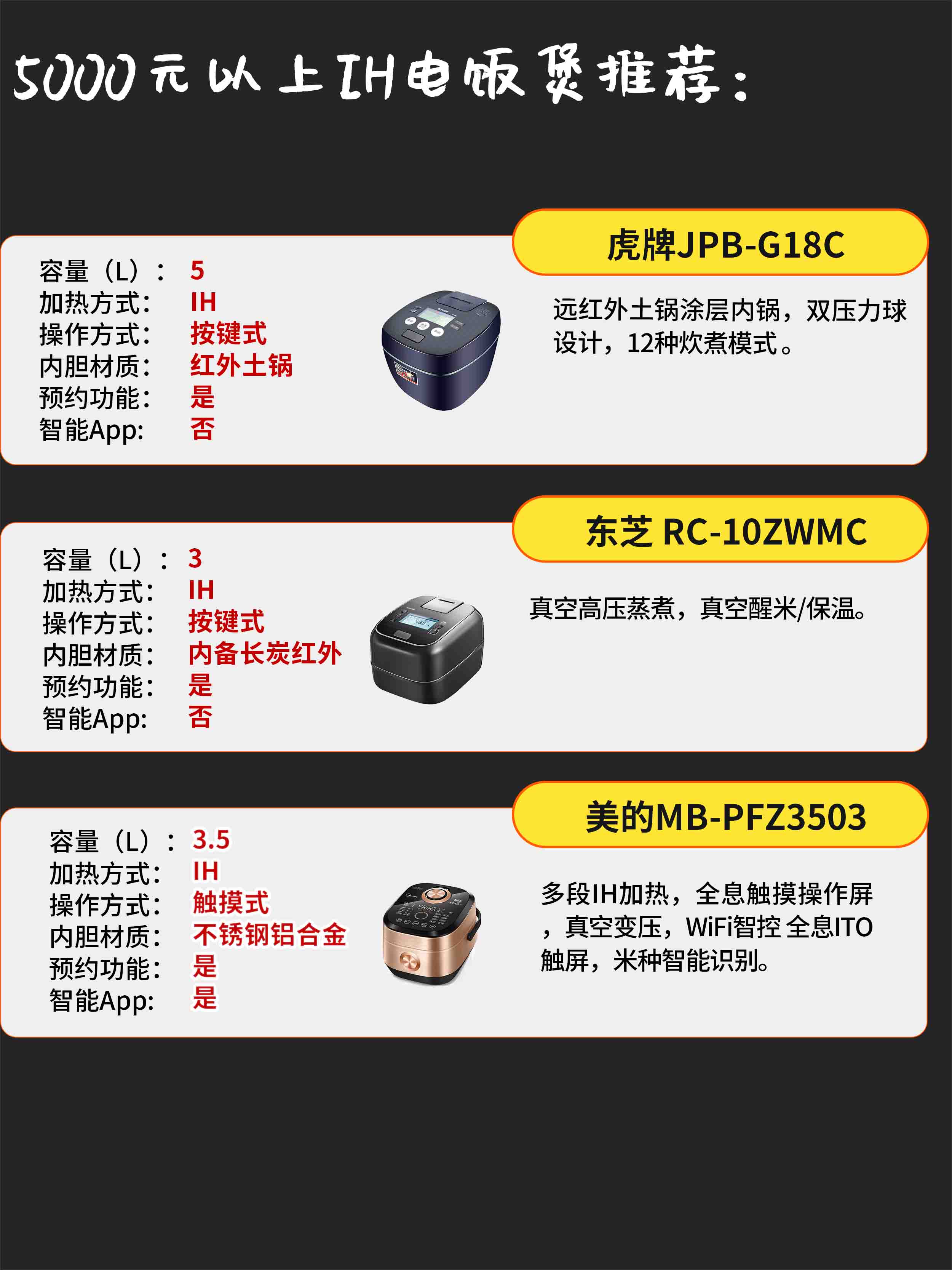 【普通电饭煲推荐】: 1、【美的MB-WFS4037】: 【性能】:3.5mm加厚内锅,智能闷香6部曲,控温精准,一键炊煮功能。 参数: 容量(L):4 加热方式:热盘 操作方式:按键式 内胆材质:钢铝合金 预约功能:是 智能App:否 2、【飞利浦HD3060】: 【性能】:外观时尚、触控屏、操作简单,易拆易洗。 参数: 容量(L):4 加热方式:热盘 操作方式:触摸式 内胆材质:铝合金 预约功能:是 智能App:否 3、【米家MDFBD02ACM】: 【性能】:新型内凹弧面热盘结构,双感温探头自动调温不溢锅,WiFi控制。 参数: 容量(L):4 加热方式:热盘 操作方式:按键式 内胆材质:铝合金 预约功能:是 智能App:是 4、【松下SR-DC186-N】: 【性能】:备长炭涂层内锅,智能米量判定。 参数: 容量(L):4.8 加热方式:热盘 操作方式:按键 内胆材质:备长炭内胆 预约功能:是 智能App:否 【500元以下IH电饭煲推荐】: 5、【美的MB-FB30Power503】: 【性能】:IH立体加热,纯平一体外观,升级后具有wifi功能,缺点是内锅厚度为2mm。 参数: 容量(L):3 加热方式:IH 操作方式:触摸式 内胆材质:钢铝合金 预约功能:是 智能App:否 6、【米家IHFB02CM】: 【性能】:内置6段智能烹饪曲线,WiFi远程控制。 参数: 容量(L):4 加热方式:IH 操作方式:按键式 内胆材质:钢铝合金 预约功能:是 智能App:是 7、【飞利浦HD4528/00】: 【性能】:独特智芯IH加热,甄选麦饭石内锅。 参数: 容量(L):4 加热方式:IH 操作方式:触摸式 内胆材质:精铁合金 预约功能:是 智能App:否 8、【大松GDCF-40X60Ca】: 【性能】:双层复合内胆。 参数: 容量(L):4 加热方式:IH 操作方式:按键式 内胆材质:铝合金 预约功能:是 智能App:否 【500-1000元IH电饭煲推荐】: 9、【苏泊尔SF40HC650】: 【性能】:1200W大火力,谷物浸泡技术,操作更简单。 参数: 容量(L):4 加热方式:IH 操作方式:触摸式 内胆材质:精铁合金 预约功能:是 智能App:否 10、【松下SR-AC071-K】: 【性能】:备长炭涂层内锅,智能米量判定。 参数: 容量(L):2.1 加热方式:IH 操作方式:触摸式 内胆材质:备长炭内胆 预约功能:是 智能App:否 11、【大松GDCF-30X88C】: 【性能】:智能语音WiFi控制,京鱼座智能生态产品。 参数: 容量(L):2 加热方式:IH 操作方式:触摸式 内胆材质:铝合金 预约功能:是 智能App:是 12、【美的MB-HS4075】: 【性能】:0.3kpa微压沸腾技术,智能触控屏幕。 参数: 容量(L):4 加热方式:IH 操作方式:触摸式 内胆材质:钢铁合金 预约功能:是 智能App:否、 【1000-2000元IH电饭煲推荐】 13、【苏泊尔CFXB40HC27-166】: 【性能】:1660W超大火力,3mm一体钢化玻璃面板。 参数: 容量(L):4 加热方式:IH 操作方式:触摸式 内胆材质:铜硅合金 预约功能:是 智能App:否 14、【美的HS4006Pro】: 【性能】:具有WiFi模块,实现一锅两煮功能,18分钟热水快速饭。 参数: 容量(L):4 加热方式:IH 操作方式:触摸式 内胆材质:钛铝合金 预约功能:是 智能App:是 15、【飞利浦HD4561/00】: 【性能】:谷物亲水技术,LED触控屏幕。 参数: 容量(L):4 加热方式:IH 操作方式:触摸式 内胆材质:精铁合金 预约功能:是 智能App:否 16、【松下SR-PE501-S】: 【性能】:IH变频加热、3.8mm备长炭涂层内锅、15m。 参数: 容量(L):5 加热方式:IH 操作方式:触摸式 内胆材质:备长炭内胆 预约功能:是 智能App:否 【2000-3000元IH电饭煲推荐】 17、【虎牌JKW-A10C】: 【性能】:远红外内锅具,液晶面板,易洁易清洗。 参数: 容量(L):3 加热方式:IH 操作方式:触摸式 内胆材质:铜铝合金 预约功能:是 智能App:否 18、【松下SR-HBC104】: 【性能】:IH立体加热、钻石涂层内胆。 参数: 容量(L):3 加热方式:IH 操作方式:触摸式 内胆材质:金粉土层 预约功能:是 智能App:否 19、【东芝RC-10RMC】: 【性能】:5mm加厚内锅,一键再加热功能。 参数: 容量(L):3 加热方式:IH 操作方式:按键式 内胆材质:备长炭内胆 预约功能:是 智能App:否 【性能】:3mm复合聚能材料超大弧度内锅,真空烹饪,3mm钢化玻璃面板。 参数: 容量(L):4 加热方式:IH 操作方式:触摸式 内胆材质:钢铝合金 预约功能:是 智能App:否 【3000-5000元IH电饭煲推荐】: 21、【松下SR-PXC184】: 【性能】:可变压力,高速交互对流。 参数: 容量(L):5 加热方式:IH 操作方式:按键式 内胆材质:备长炭内胆 预约功能:是 智能App:否 22:【美的MB-DHZ4001XM】 【性能】:多段立体IH加热技术,晶钻涂层内锅,WiFi控制,一锅两煮。 参数: 容量(L):4 加热方式:IH 操作方式:触摸式 内胆材质:钛铁合金 预约功能:是 智能App:是 23、【大松GDCF-4009C】: 【性能】:多段IH立体加热,WIFI操控,煲仔饭专用内锅,隐藏数显,适合三高人群。 参数: 容量(L):4 加热方式:IH 操作方式:触摸式 内胆材质:铜铝合金 预约功能:是 智能App:是 24、【飞利浦HD4588/00】: 【性能】:谷物亲水技术,智能芯回旋IH技术,7英寸TFT彩屏。 参数: 容量(L):4 加热方式:IH 操作方式:触摸式 内胆材质:铁合金 预约功能:是 智能App:否 【5000元以上IH电饭煲推荐】: 25、【虎牌JPB-G18C】: 【性能】:远红外土锅涂层内锅,双压力球设计,12种炊煮模式。 参数: 容量(L):5 加热方式:IH 操作方式:按键式 内胆材质:红外土锅 预约功能:是 智能App:否 26、【东芝RC-10ZWMC】: 【性能】:真空高压蒸煮,真空醒米/保温。 参数: 容量(L):3 加热方式:IH 操作方式:按键式 内胆材质:备长炭红外 预约功能:是 智能App:否 27、【美的MB-PFZ3503】: 【性能】:多段IH加热,全息触摸操作屏,真空变压,WiFi智控全息ITO触屏,米种智能识别。 参数: 容量(L):3.5 加热方式:IH 操作方式:触摸式 