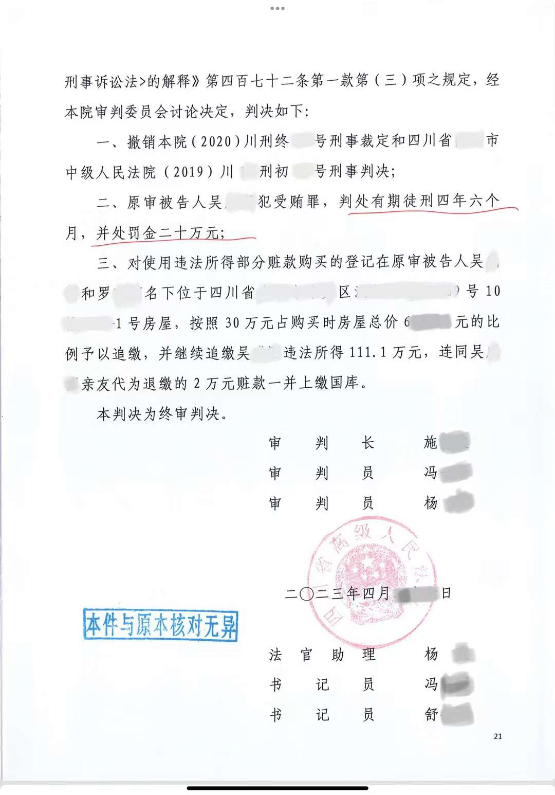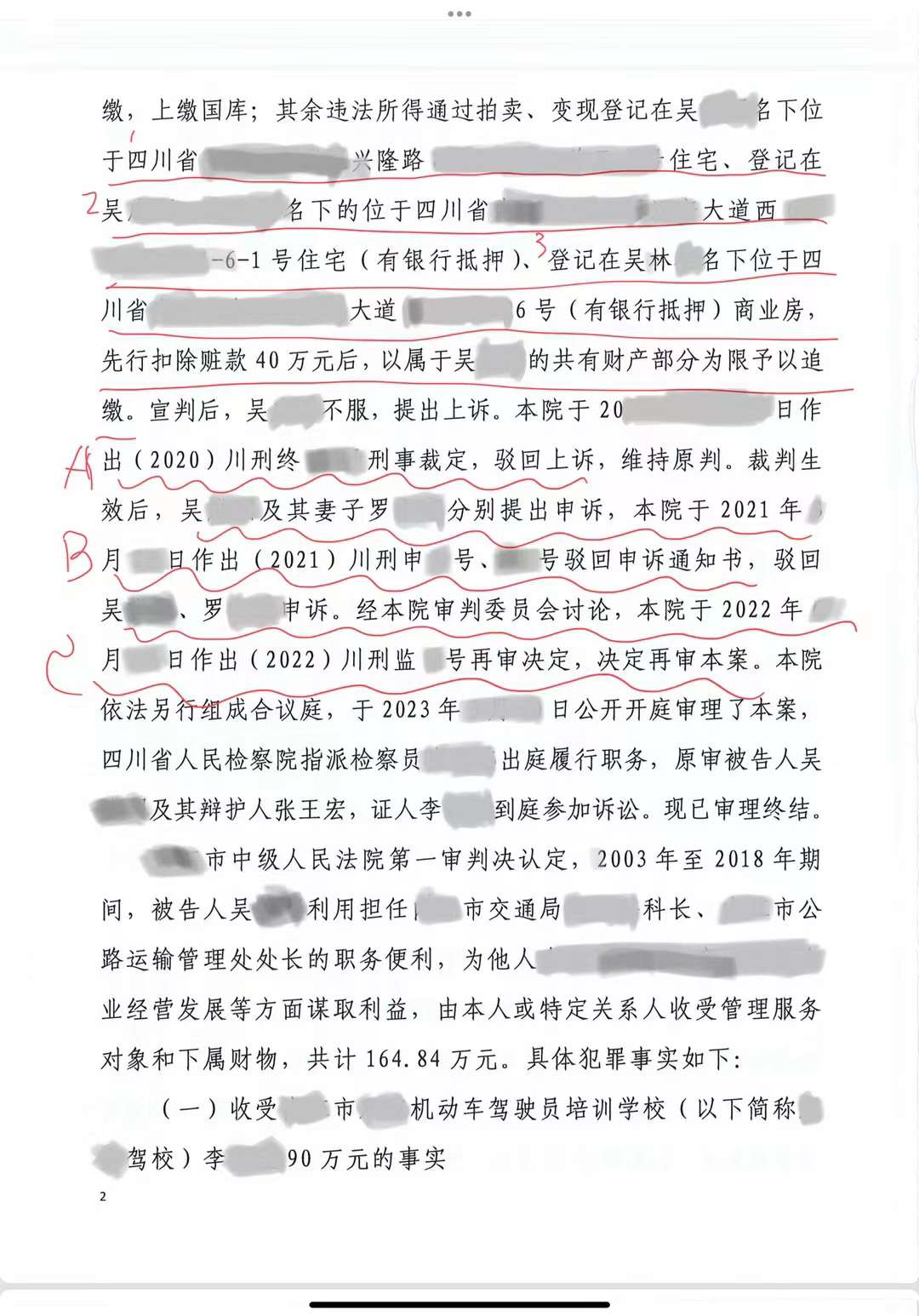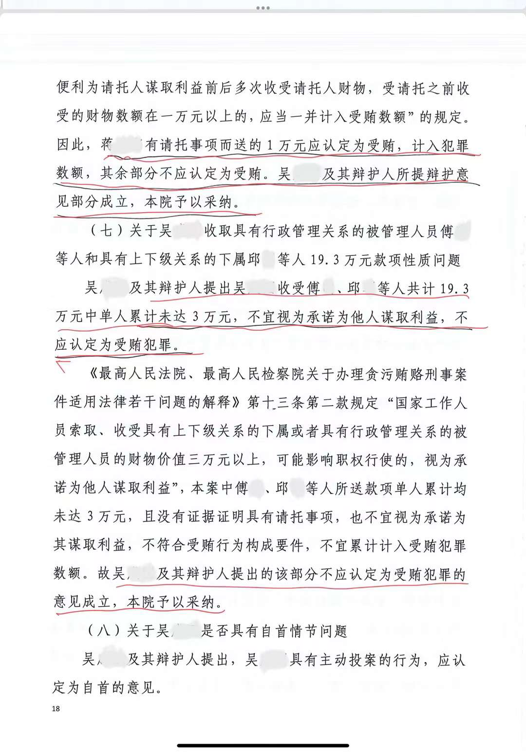 实战文书吴某某被判受贿罪一案再审开庭无罪辩护词 【说明】本案由某某省高院再审,既存在较严重非法取证,又存在证据矛盾、定性错误、证据证明标准不足等问题,因此,该法律意见,采取分层说理、“目录”式推进的方法。以非法取证开篇,在后部分说理中,突出证据矛盾,并印证非法取证,互为响应。为增强说服力,始终立足证据发表意见,对证据出处,采取脚注方式详细引用,避免阅读障碍。对案件的核心问题,采取分组归类说理,并综合运用证据、事实、逻辑说理。案子经申请开庭审理,后,原五年刑期改为四年半,罚金由30万改为20万,原冻结准备拍卖的三套房产,改为仅就其中一套按比例追究(解封92%财产)判决书附后。 尊敬的审判长、审判员: 张王宏律师受吴某某委托和律师事务所的委派,依法担任吴某某被判受贿罪再审一案吴某某的辩护人。 辩护人依法阅卷,并会见吴某某,听取了吴某某对一审判决、二审裁定的意见。现结合全案证据与事实、法律,提出以下无罪辩护意见,请法庭采纳: 原一审认定并为二审维持的裁判认为:吴某某在担任某某省某某市交通局运管处处长等职务期间,从2003年开始,向31人收取共计160余万元款项,构成受贿罪。 辩护人认为:原一、二审裁判认定的依据,主要系言辞证据,而相关证据,存在明显非法取证的情况;15年的时间跨度里,收授双方对130多笔款项均能一一逐步还原,明显有违人的记忆规律;将正常人际往来的红包仅仅单向计算吴某某收受的部分、将吴某某上缴的退还住院期间收取的红包认定为犯罪,认定有误;本案只有受贿人而没有行贿人受到追究、吴某某不存在滥用职权等受贿外的违法犯罪指控、冻结吴某某全家三口人全部财产(包括20多年前的房改房)才能追回涉案160余万元“赃款”等,反向可表明,吴某某清廉正直,不存在受贿的犯罪事实。依据在案证据、事实、法律,请改判吴某某无罪。 主要依据: 一、原一审依据的言词证据,存在明显而严重的非法取证,导致指控的犯罪事实无法认定 二、第一项对指控受贿部分,存在定性错误、证据矛盾、证据非法的问题 三、第二至七项“受贿”情节中,有请托事项部分,证据不能达到确实充分的证明标准;无请托事项部分,依法不构成受贿 四、第八至二十四项,属正常年节往来礼金,只计算吴某某单向收受他人部分,认定事实错误 五、吴某某已上缴的款项,不应认定为受贿款 分别详述如下: 第一部分:非法取得的证据不应认定 吴某某多份在案申诉材料中,均明确陈述,自己曾遭遇变相刑讯逼供等非法对待。 辩护人会见时,吴某某也详细陈述了被非法取证的时间、人员、过程,辩护人据此向贵院在内的办案部门申请调取讯问录音录像、申请调查人员出庭而不得。 结合在案多名证人等诉讼参与人提供的证据及线索,说明证人同样存在被非法取证,或,有明显违反正常记忆规律与生活常理处。 第二部分:本案的实体问题 一、吴某某收取李某某的90万元不应认定 (一)50万元款项部分,应依法认定为借款或投资款 从借款到撕毁借条期间,吴某某并不具有利用职务之便为李某某谋利的职务便利;该笔借款发生在20年前,其时吴某某仅仅是李某某原来同科室的副科长,该笔借款,符合双方交往基础及经济实力;双方存在互负债务情况,且借款不能偿还有具体原因,不能单向、片面、割裂地曲解为受贿。 (二)30万元部分,与吴某某无关 根据在案证据,该笔款项是罗某某向李某某的借款,且符合李某某与罗某某交往的人际关系基础。在案证据不能证实,吴某某对此笔借款知情。 (三)李某某在吴某某及配偶住院期间,分别给出二人共10万元红包,证据不具有证明能力 再审期间,吴某某在辩护人会见时,详细陈述了此部分诱供、指供的细节,而在案的供述中也存在明显矛盾。此节根本不具有真实性,应予排除。 二、吴某某收受涉案共七人(一审判决书第二项到第七项)的55.54万元不应认定为受贿 2022.8.1上午9:30会见时,吴某某讲,7.22日省高院法官提讯。其陈述:原判决中1-5项,其中,1.50万李某某借款。当时是借的。2.30万借款不知情。3.10(5+5)探病给钱不存在。4.2-5:黄某1与黄某2的21.6万,红包礼金收过,大额款项,没收过】。*6-24没有问。但其强调,红包礼金收过,金额和次数有出入。 *关于黄某1、黄某2部分,会见时吴某某讲:2014年春的10万元。是“根本不存在的”。原因:黄某1不会来小区。不会来我家。2015年初,黄某2送5万。根本不存在。至于“2016年初,黄某2在茶楼送2万。2017年初,黄某2在茶楼送1万。2018年初,黄某2在茶楼送1万。拜年是有的,金额没那么多。而且,基于大家是老乡,也熟悉,所以吴某某与黄某2等人,也是有回礼的,也对得上。基本是平衡的 (一)有请托事项的42.3万元,证据无法形成完整的证据链条 行贿人所述吴某某为其谋利的具体内容,一部分根本不属于吴某某职权范围,不存在谋利的可能。 另一部分可能存在谋利的,无客观证据可佐证,排除疑点证据后,无法认定有关事实。 (二)无请托事项的红包13.24万元,依法不构成受贿 行贿7人的请托事项不能查实,故13.24万元不符合受贿罪构成要件。 该部分行贿金额,没有单笔超过3万的情形。 仅仅朱某某、黄某2的累积金额超过3万,但将年节往来、探病等老乡、亲友间人际交往礼金,忽视双方互有给付,仅统计吴某某收受部分,有违基本常理与事实。 (三)对于司法解释中,国家机关工作人