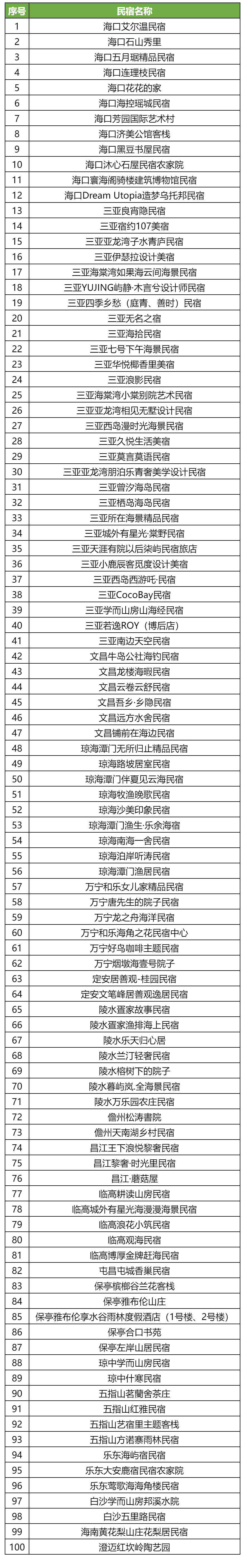 新海南客户端、南海网2月8日消息(记者丁文文)2月8日,记者从海南省旅文厅获悉,“海南100家特色民宿”评选活动落幕,评选结果出炉。本次评选旨在发掘和推广国内具有独特魅力和风格的民宿,为广大游客提供更多优质的旅游住宿选择。 据悉,本次评选历时数月,吸引了众多民宿的积极参与。经过激烈角逐和专家评审团的严格筛选,最终有100家特色民宿脱颖而出,荣获“海南100家特色民宿”称号。这些特色民宿风格各异,独具特色,涵盖了乡村、海岛、森林、古城等多种类型。它们不仅提供舒适的住宿环境,更是将当地的文化和风情融入其中,让游客在旅途中感受到家的温馨和归属感。 本次评选结果出炉后,主办方将与获奖民宿展开深度合作,共同打造更多精品旅游线路和活动,为游客提供更加丰富和优质的旅游体验。 业内人士认为,此次“海南100家特色民宿评选”活动的举办,将进一步推动国内民宿业的发展。“随着人们对于旅游品质的追求不断提高,特色民宿已经成为旅游市场的一股新兴力量。未来,相信会有更多优秀的民宿涌现出来,为游客带来更加美好的旅行回忆。” 记者了解到,一些获奖民宿已经开始计划与周边景区、手工艺人等展开合作,共同打造具有地方特色的文化体验项目。这将有助于提升游客的参与度和体验感,进一步丰富旅游市场的产品供给。 此外,为了持续推动民宿业的发展和提升游客的满意度,主办方还计划在未来的评选活动中进一步扩大规模和覆盖范围,吸引更多优秀的民宿参与其中。同时,还将加强与国际民宿界的交流与合作,借鉴国际先进经验,提升中国民宿的整体水平和竞争力。 “海南100家特色民宿”名单 (排名不分先后)