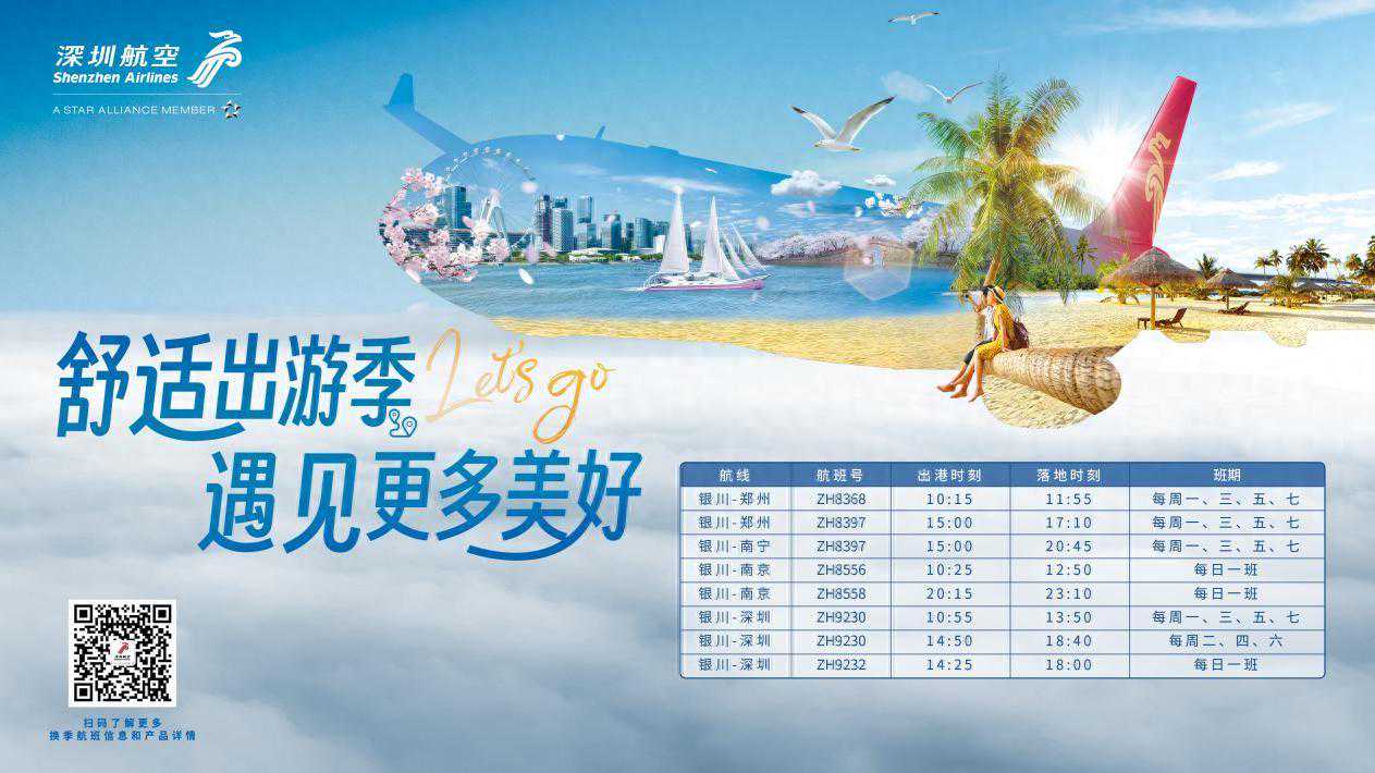 2024年3月31日起深圳航空(以下简称深航)夏秋航季正式开启。深航银川地区航班时刻优化,加密银川至郑州、银川至深圳航班,优质优价优选,助您更便捷、更舒适出行。 本次换季,尊享权益升级。选乘深航“躺飞”公务舱,在不同机型上可分别享受到120°/150°/180°大仰角云端“躺飞”椅,实现云端舒适躺飞;舒适经济舱,座椅间距平均加宽48%,尊享前排宽敞座椅、机上特色餐食、专属地面服务、会员升级更快速;“家有约,爱随行”深航家庭出行计划,在深圳航空App或微信小程序的“家庭专区”完成实名认证成为户主,户主可添加9名家庭成员,一人注册,全家共享超值出行权益;经深飞中转更便捷,深航针对经深圳中转超6小时旅客推出旅游出行交通权益。国际航线横跨亚欧,覆盖10国,让世界近在咫尺。更有易惠退、粤苏通、敬老卡、双城次卡、深航优享(教师、学生专享),丰富产品任选。 深航服务保障,时刻把旅客的需求和感受放在首位,在服务及产品上不断优化升级,始终致力于为美好生活添翼,让旅客感受到“任何时候,自然体贴”的美好服务体验。
