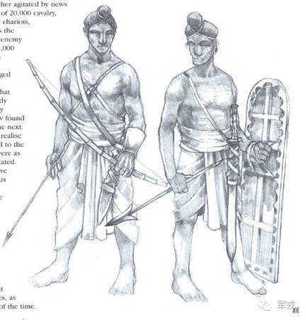 古印度军自古以来就有步兵、骑兵、战车、战象四个军种,用以对抗不同状况的战争,因此在同时代的所有军队里,古印度军队的强大也是数一数二的。 古印度军队的兵种以轻装步兵为主,其中又以长弓手最多,印度长弓为竹制,长与射手身高接近,箭长1.3-1.4米,对于长弓的记录,有的是说其威力无比,有的却说其软绵绵,吉达斯浦战役中,很多印度弓箭手因为泥地湿软没有挂上弓弦,可见其弓力不小。 印度士兵会携带一柄巨大的勺型阔剑,剑宽五指,长1.3米,需两手共用。也会携带巨大的木棒,这也许是一种精锐的突击步兵。 印度的甲胄比较特别,只保护腹部,是一种皮甲,只有少数士兵有资格使用,这种甲胄在埃及新王朝时就有了,直到公元1000年左右才消失。 在波斯战争中,印度骑兵是仅有的有亮点的部队之一,但在印度本土的战斗中,却基本被亚历山大的多种族骑兵秒杀。这些骑兵不穿甲胄,手拿异型盾牌,武器是两只三叉戟形的抛枪。 最值得一提的莫过于战象这一强大的兵种。与骑兵的战马不同,战象的皮很厚,不会轻易受伤,即使步兵的长矛阵也很难挡住它。继承了亚历山大的亚洲领地的塞琉古一世率军入侵印度次大陆西北部的旁遮普地区,迫使旃陀罗笈多回师与其决战。在前302年,双方达成了和约,塞琉古承认旃陀罗笈多对北印度的统治,并将一个女儿嫁给旃陀罗笈多,以换取印度人送给他五百头大象和象手,支持他对埃及的扩张。可见战象在战争中有多么抢手。 除了战象之外,再就是由四匹马所驾驭的战车了。这种战车上一共有6名乘员,分别是两名抛枪兵、两名弓兵、两名驾驶员。战车的用途就是运送士兵,乘员下车后,战车到后方待命。当然有时也会参与战斗,或者抛枪,或者射箭,根据车上不同的作战方式,战车的实际应用方法也略为不同。 对刀剑有兴趣可加龙泉铸剑师,沈师傅