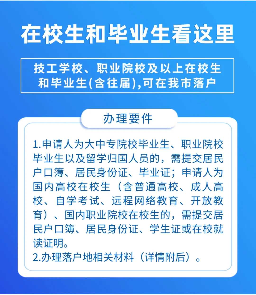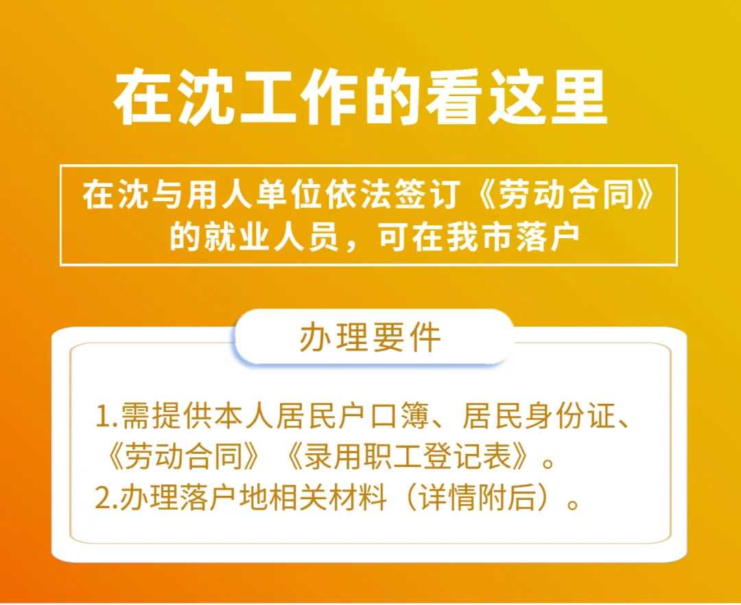 又是一年毕业季 准备在沈阳安家落户的注意啦 ➤需要什么条件? ➤需要怎么办理? 小编帮你整理了 赶紧收藏 👇 目前沈阳引进人才落户政策 主要有以下4种 落户地相关材料、地点、时限 1.在城镇合法所有权房屋登记地登记户口的,提供房屋所有权证(未取得房屋所有权证的可提供购房备案合同和完税证明)。 2.在城镇租赁房屋登记地登记户口的,提供租房协议、租住房屋所有权证(未取得房屋所有权证的可提供购房备案合同和完税证明),房主居民身份证、同意落户声明材料。 3.在城镇亲属朋友家庭户登记户口的,提供亲属朋友家庭户户口簿、户主居民身份证、同意落户声明材料。 办理地点:公安派出所 办理时限:即时办理 沈阳开放落户 是一份诚挚且正式的邀请 期待与您共建 更美更新的魅力沈阳 责编:黄晴侯佳音 主编:李淳 出品:沈阳网 声明:除原创内容及特别说明之外,推送稿件文字及图片均来自网络及各大主流媒体。版权归原作者所有。如认为内容侵权,请联系我们删除。