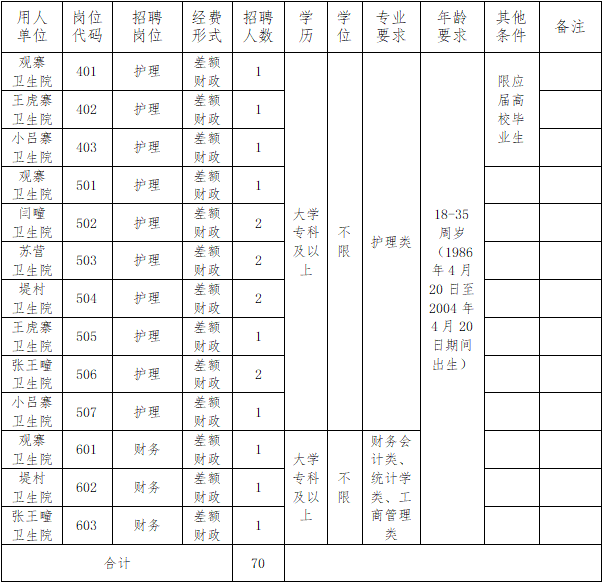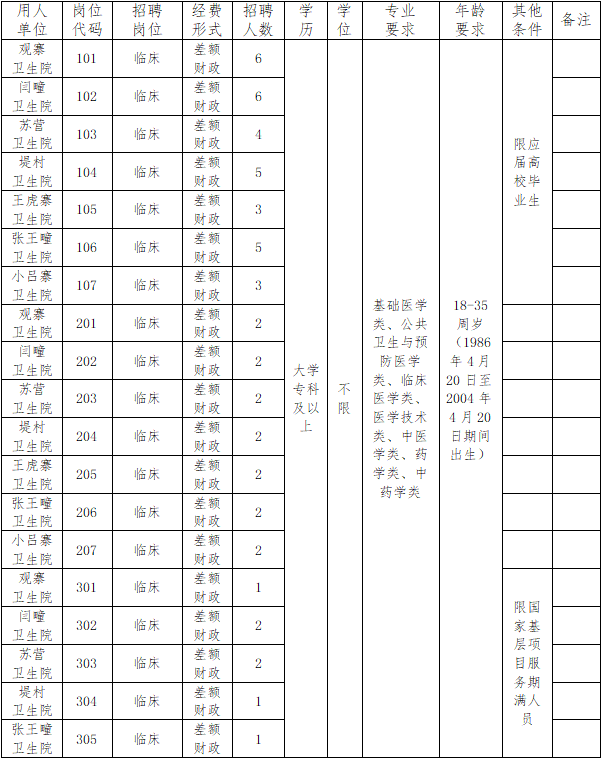 巨鹿县人力资源和社会保障局2022年公开招聘乡镇卫生院工作人员公告 为满足事业单位用人需要,根据《邢台市事业单位公开招聘工作人员实施办法》,结合2022年招聘工作人员计划和岗位空缺情况,巨鹿县人力资源和社会保障局2022年拟面向社会公开招聘乡镇卫生院(差额财政拨款事业单位)工作人员70名。现公告如下: 一、招聘原则 坚持德才兼备,贯彻民主、公开、竞争、择优的原则,实行公开招聘,在考试、考察的基础上择优聘用。 二、招聘方式 本次招聘采取统一招聘方式。按照制定招聘方案、发布招聘公告、报名及资格审查、考试、考察、体检、拟聘人员公示、聘用等步骤进行。 三、招聘条件、岗位、人数 (一)应聘人员应具备以下基本条件: 1.具有中华人民共和国国籍,遵守宪法和法律,具有良好的品行和职业道德; 2.年龄在18-35周岁(1986年4月20日至2004年4月20日期间出生); 3.具有与招聘岗位要求相适应的年龄、学历和其他资格条件(详见招聘岗位条件表要求),国外留学生须出具教育部留学认证中心提供的学历学位认证书; 4.身体健康,适应岗位要求。 (二)招聘岗位具体条件: 1.具体招聘人数和岗位条件详见《2022年巨鹿县公开招聘事业单位工作人员岗位条件表》,其中专业参考教育部《授予博士、硕士学位和培养研究生的学科、专业目录》、《普通高等学校本科专业目录》、《普通高等学校高职高专专业参考目录(试行)》设置; 2.本次招聘部分岗位用于专项招聘“应届高校毕业生”,包括以下人员: (1)纳入国家统招计划、被普通高等院校录取、持有普通高校毕业生就业报到证的2022年高校毕业生。 (2)国家统一招生的2020年、2021年普通高校毕业生离校时和在择业期内未落实工作单位,其户口、档案、组织关系仍保留在原毕业学校,或保留在各级毕业生就业主管部门(毕业生就业指导服务中心)、各级人才交流服务机构和各级公共就业服务机构的毕业生。 (3)参加“服务基层项目”前无工作经历,服务期满且考核合格后两年内未落实工作单位的人员。 (4)普通高等院校在校生或毕业当年入伍,退役后(含复学毕业)两年内未落实工作单位的退役士兵。 (5)2022年取得国(境)外学位并完成教育部门学历认证的留学回国人员;以及2020、2021年取得国(境)外学位并完成教育部门学历认证且未落实工作单位的留学回国人员。 3.本次招聘部分岗位用于专项招聘“国家基层服务”期满人员。其中“三支一扶”服务期满人员,指邢台户籍或服务地在邢台的服务期满且考核结果为合格的“三支一扶”计划人员;2022年服务冬奥会、冬残奥会的2022届大学毕业生志愿者享受与“三支一扶”计划、志愿服务西部计划等国家基层服务项目期满人员同等政策。已在机关事业单位正式参加工作的,不享受定向招聘优惠政策,不得报考定向岗位。 4.在符合专业等其他条件的前提下,技工院校预备技师(技师)班毕业生可报名应聘学历要求为大学本科的岗位,高级工班毕业生可报名应聘学历要求为大学专科的岗位。 5.非全日制普通类毕业生的干部身份认定,按有关规定执行。 6.凡涉及到年龄、户籍、工作经历等需要确定时间的,计算日期截止到2022年4月20日。 (三)不在招聘范围人员: 1.现役军人; 2.试用期内的公务员和事业单位工作人员; 3.在读的非应届毕业生; 4.未满最低服务年限或未满约定服务期限的人员; 5.未经本单位及其主管部门同意报考的公务员和事业单位工作人员。 (四)不得应聘人员: 1.曾因犯罪受过刑事处罚人员、被开除中国共产党党籍的人员、被开除公职的人员、被依法列为失信联合惩戒对象的人员; 2.法律法规规定不得招聘为事业单位工作人员的其他情形人员。 (五)公开招聘工作实行回避制度: 应聘人员不得报考聘用后即构成回避关系的招聘岗位。回避关系包括《事业单位人事管理回避规定》第六条“事业单位工作人员凡有下列亲属关系的,不得在同一事业单位聘用至具有直接上下级领导关系的管理岗位,不得在其中一方担任领导人员的事业单位聘用至从事组织(人事)、纪检监察、审计、财务工作的岗位,也不得聘用至双方直接隶属于同一领导人员的从事组织(人事)、纪检监察、审计、财务工作的内设机构正职岗位: 1.夫妻关系; 2.直系血亲关系,包括祖父母、外祖父母、父母、子女、孙子女、外孙子女; 3.三代以内旁系血亲关系,包括叔伯姑舅姨、兄弟姐妹、堂兄弟姐妹、表兄弟姐妹、侄子女、甥子女; 4.近姻亲关系,包括配偶的父母、配偶的兄弟姐妹及其配偶、子女的配偶及子女配偶的父母、三代以内旁系血亲的配偶; 5.其他亲属关系,包括养父母子女、形成抚养关系的继父母子女及由此形成的直系血亲、三代以内旁系血亲和近姻亲关系。 前款所称同一事业单位,是指依法登记的同一事业单位法人,以及《河北省事业单位公开招聘工作人员暂行办法》第四十一条“凡与聘用单位负责人员有夫妻关系、直系血亲关系、三代以内旁系血亲或者近姻亲关系的应聘人员,不得应聘该单位负责人员的秘书或者人事、财务、纪律检查岗位,以及有直接上下级领导关系的岗位”。 四、招聘程序 (一)发布公告 2022年4月15日通过“巨鹿人社”微信公众号和网上报名系统向社会公开发布招聘信息。 (二)网上报名和资格初审 1.报名办法:采取网上报名、资格初审、网上缴费、网上打印准考证的