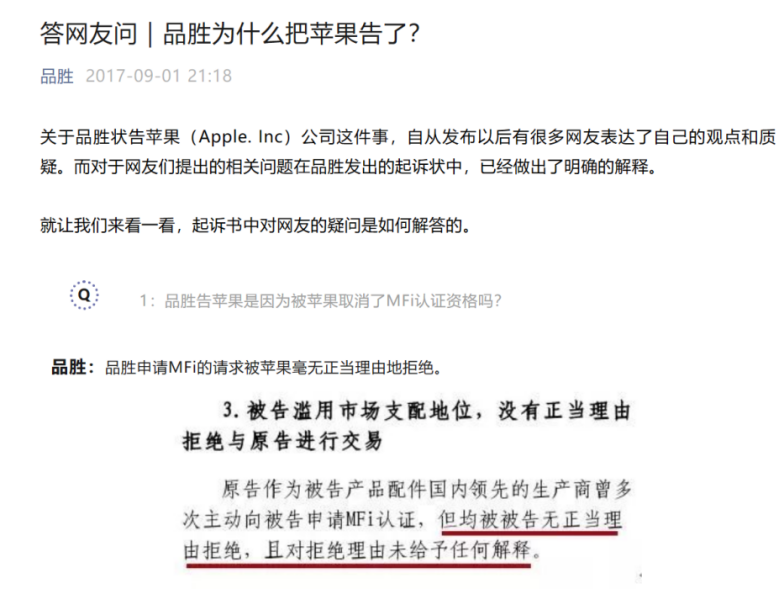 2017年状告苹果时,品胜做得更加彻底。凯文还记得当时一群律师来到品胜,会议室里还拉起红色横幅,研讨“苹果必败”的可能性。品胜还在官方公众号上开辟专栏进行声讨,颇有些2004年指控索尼“垄断”时的气势。