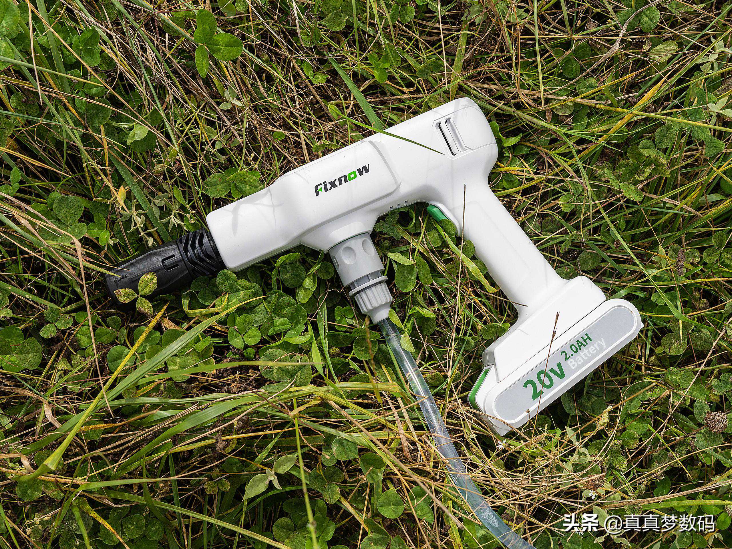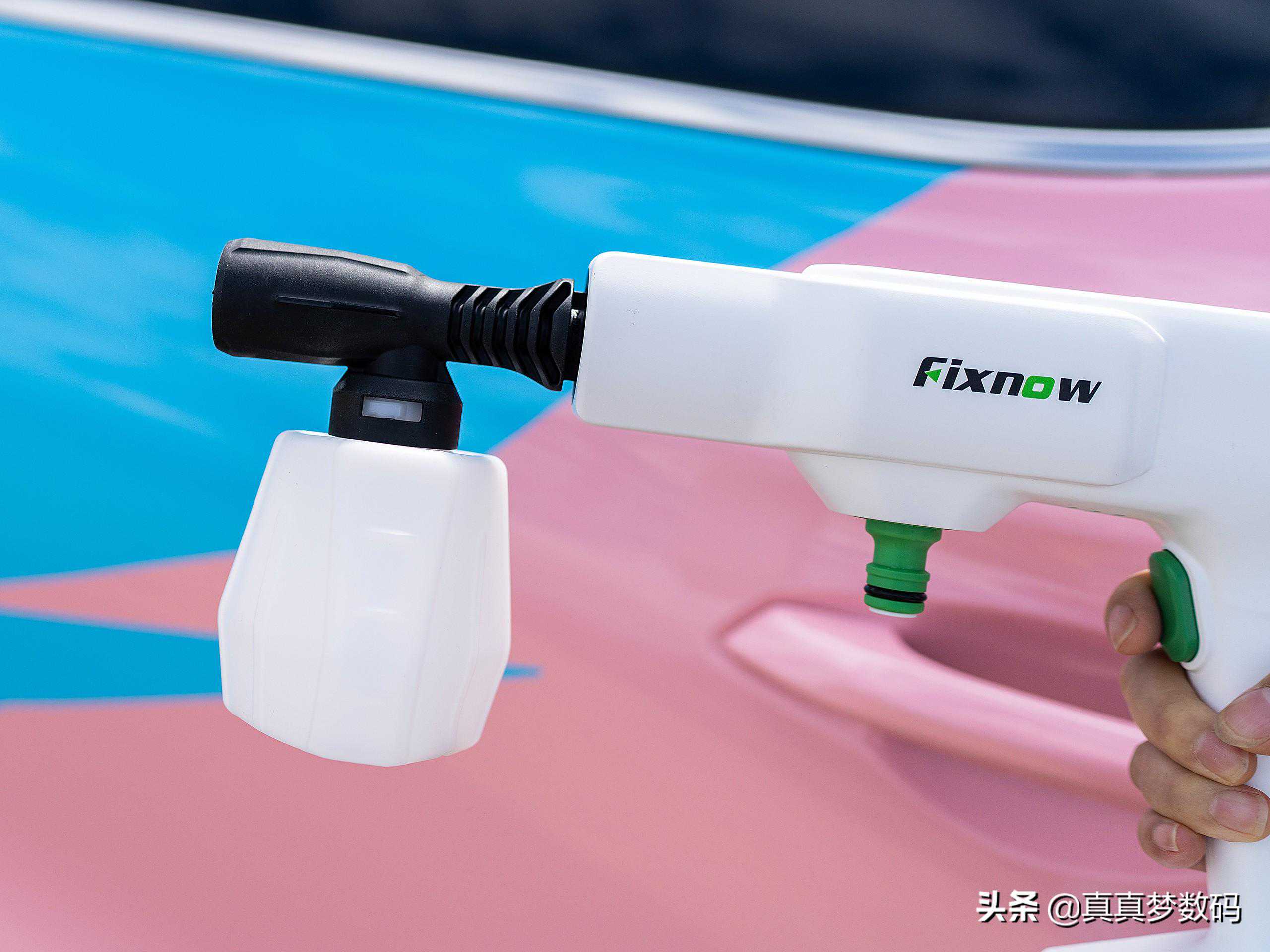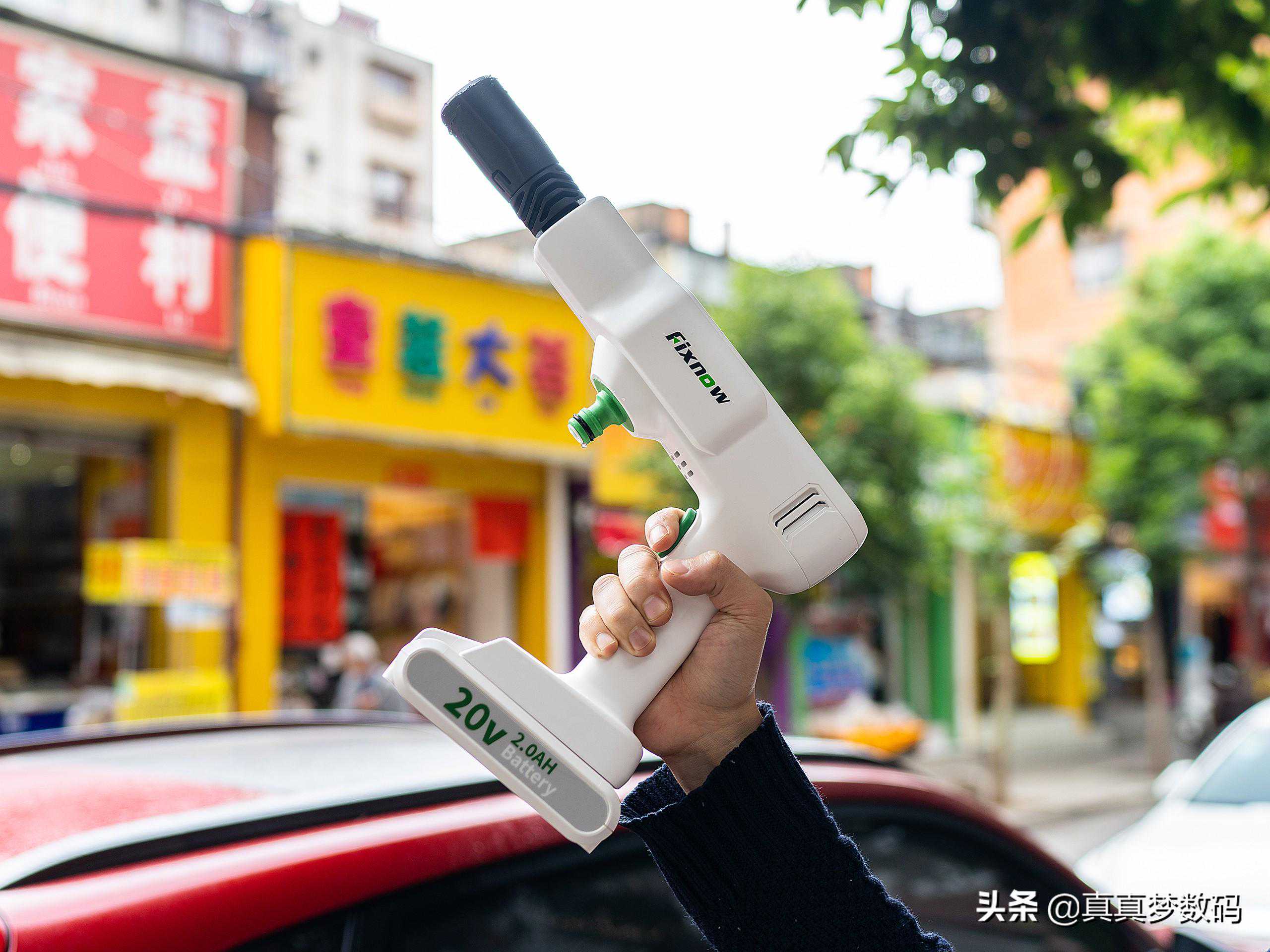 有了洗车机后就再也没花钱去外面洗车了,可以省一笔钱,想怎么洗就怎么洗。这台洗车机型号是200E,属于斐诺Fixnow品牌下的入门洗车机。昨天去玩的时候试洗了一回,发现这台洗车机虽然小巧,却挺实用:水压够大,只需要冲洗、不需要抹布就可以把路途上的泥泞洗干净~ ▼降温了,天气一直不好,在家都快憋坏了。好不容易看到不下雨了,赶紧叫上伙伴游玩去,路上顺便评测一下这台刚拿到的Fixnow200E洗车机。按照惯例还是先从外观一步步讲起吧。Fixnow洗车机外观如图,白色塑料机身,可拆卸电池设计。拆开包装后的第一感觉是做工相当好,洗车机整体设计简约漂亮,拿在手上的手感很好: ▼可拆卸枪管设计,装上枪管总长度307mm,净重1.1KG,小巧便携,实测小女生单手握持洗车也很轻松: ▼附送了一个泡沫壶和几袋洗车精,够洗好几次了,用完后就自己买一瓶吧: ▼20可拆卸式锂电池包,电池壳的材料是ABS防阻燃材质,电池内部有温控保护电路。可以拆下电池带回家充电,续航时间之后会进行测试: ▼附送7米长可拆卸式透明软管,软管自带过滤器,这个长度不管是户外还是车库洗车都够用: ▼使用上也超简单,装上枪管、连接上水管、把过滤器丢进桶里就可以开工了: ▼虽是入门级,用料和做工一点不含糊,机身表面光滑细致无毛刺,细节到位: ▼整机小巧轻便,带一只折叠小桶就可以收纳洗车机、水管和洗车液,不会占用太多后备箱空间: 外观讲完了,开始进入实战环节。本以为这台洗车机压力不会很大,喷射模式下我用手摸了下,水柱直接打到手上有疼痛感!看了下介绍,压力可以达到2.2MPa,实测洗车上泥土的话用清水就可以冲洗干净,其他污渍当然得加洗车液: ▼还可以把枪头调整为伞状和雾化模式大面积快速清洗尘土和泡沫: ▼用更直观的动图来展示吧,喷射模式: ▼喷雾模式,拧枪管就可以切换: ▼喷射模式下的水压可以射穿5CM厚的泡沫板,还担心水压不够吗: 最后再测一下续航时间,看看这么小巧的洗车机电池能洗几次。 ▼直到16:11洗车机电池电量终于耗尽,续航时间合计28分钟,按照我平时每次洗车差不多10分钟的习惯,充满电可以洗两次,对于这么小的机器来说还是很不错的。测试期间我摸了下洗车机外壳温度并不高,电机处有散热孔的缘故,散热性能比较好,机身上只有一点温温热的感觉。 怎么样,如此小巧方便、性能强的洗车机你爱了吗?最关键的是价格还不贵,而且是大品牌!