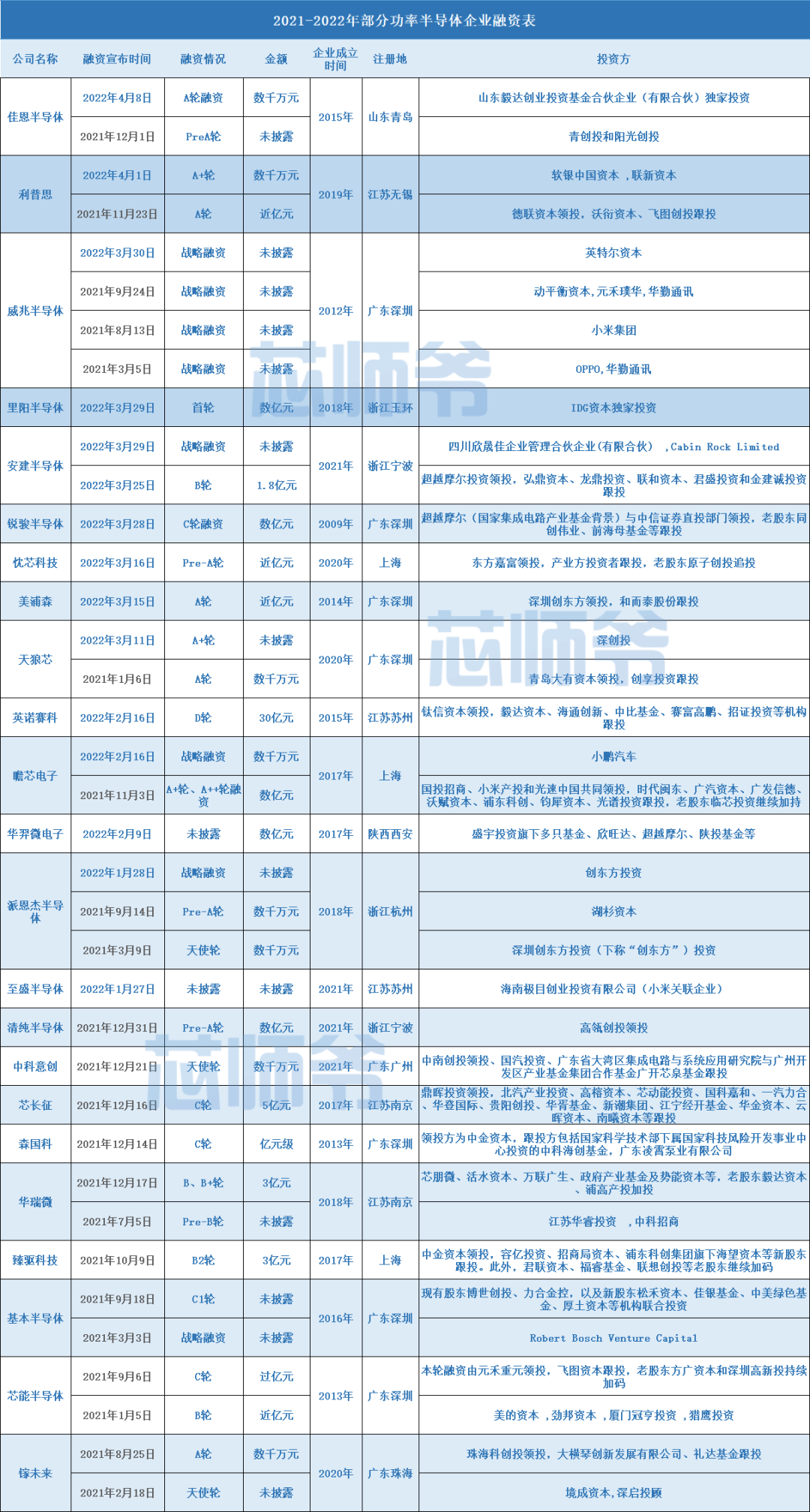 资本涌入功率半导体赛道 据芯师爷不完全统计,自2021年以来,有22家国内功率半导体企业获得共计40笔融资,13家企业在这段时间完成了2-3笔融资,业内企业在资本助力下快速成长。 具体来看,融资规模方面,除未披露具体投资金额的威兆半导体、天狼芯、派恩杰半导体、至盛半导体等企业,其它公开融资金额的企业佳恩半导体、利普思、瞻芯电子、忱芯科技、美浦森均为数千万元起步;英诺赛科、里阳半导体、安建半导体、锐骏半导体、华羿微电子等融资金额均过亿元,其中英诺赛科D轮融资金额高达30亿元。 在融资阶段方面,近一年多来获得融资的功率半导体企业多处于A轮/天使轮融资阶段。业内人士对芯师爷表示,A轮融资一般意味着该企业仍处于起步阶段,公司已有产品面向市场,但市占还相对较低。融资企业的成立时间也验证了这一说法,以上表单中不乏企业是成立于2020年甚至是2021年,属于新兴企业。 从融资企业的注册地来看,在该列表中,广东、浙江、上海、江苏企业是融资高发地,其中深圳堪称“功率半导体聚宝盆”,有7家企业获得融资,占三分之一。 从投资方的资料来看,颇耐人寻味。除了各专业投资机构投资频频,产业资本投资的力量也正在国内功率半导体企业投资圈中崛起,其中不乏和而泰、英特尔和小鹏汽车、广汽资本、美的、小米、OPPO等各大产业/应用终端巨头的身影。 值得注意的是,从表单上企业融资时间可得知,进入2022年后,功率半导体市场投资正在加快,截止2022年4月初,今年国内功率半导体企业就已官宣15笔融资。大量资本不约而同涌入功率半导体赛道,恰恰反应了当前该赛道的火热。 至于资本看重功率半导体的原因,供应链本土化的趋势是不可忽略的因素。“中美贸易战倒逼了中国芯片技术创新,中国是最大的芯片应用市场,在功率半导体板块未来也会走出本土的企业。”中欧资本董事长张俊博士(原华为副总裁)说。 商业考虑也是重要原因。参与过比亚迪半导体、杰华特的某知名投资机构人士对芯师爷表示,功率半导体赛道企业获得资本青睐的原因主要有两个。 “一是商业模式清晰。对于下游应用客户而言,功率半导体的验证周期相对较短,能快速放量,实现业绩增长。而另一个重要原因在于,新兴的消费品电子领域给国内功率半导体带来更大的应用市场。” 千亿元级别市场风口 “更大的应用市场”是国产功率半导体发展的源动力。近年来,功率半导体的市场需求强烈。 功率半导体根据集成程度可分为功率IC和功率半导体分立器件。功率IC是将功率分立器件与驱动、保护等电路集成在一个半导体晶片上,种类包括电源管理IC、驱动IC、AC/DC、DC/AC转换器等;功率分立器件可分为二极管、晶体管、晶闸管三大类别,晶体管中MOSFET、IGBT、BJT应用广泛。其中功率IC、MOSFET、IGBT、二极管是四种运用最为广泛的功率半导体产品。 作为构成电力电子转换装置的核心组件,功率半导体几乎进入国民经济各个工业部门和社会生活的各个方面。随着新应用场景的出现和发展,功率半导体的应用范围已从传统的消费电子、工业控制、电力传输、计算机、轨道交通、新能源等领域,扩展至物联网、电动汽车、云计算和大数据等新兴应用领域。 应用场景的日益丰富令功率半导体的市场规模水涨船高。Yole数据显示,2019年全球功率半导体市场规模为381亿美元,预计到2022年将达到426亿美元,复合增长率为3.79%,市场规模稳步增长。其中,汽车、工业和消费电子是功率半导体的前三大终端市场。根据智研咨询的数据,2019年汽车领域占全球功率半导体市场的35.40%,工业领域占比为26.80%,消费电子占比为13.20%。 具体到中国市场,在需求端,IHS数据显示,中国是全球最大的功率半导体消费国,2018年市场需求规模达到138亿美元,占全球需求比例的35%,2021年市场规模将达到159亿美元(约合人民币1029亿元),2015-2021年CAGR达到6.3%。 但在供应端,国海证券研究报告指出,功率半导体在中国市场呈供需严重不匹配的格局。从供给端来看,全球功率半导体分立器件和模组行业依然为全球市场欧美所主导,尚无国内厂商进入市占前十列表,大陆厂商市场份额约10%,欧美日厂商市占70%。在IGBT和中高压MOSFET细分领域市场欧美日厂商市占超80%。大陆以二极管、低压MOSFET、晶闸管等低端功率半导体为主,目前实力较弱,占据全球10%的市场份额。 中国功率半导体市场以千亿元规模为基准,且仍在不断扩大,本土企业可挖掘的市场空间还很大。且与MCU、存储芯片等半导体细分领域中CR5动辄90%以上的数据相比,功率半导体市场竞争格局较为分散,CR5仅38%。市场的分散意味着在该领域中,并不存在占绝对垄断优势的对手。 图:2019全球功率半导体分立器件及模组市场格局 国内企业正崛起 面对巨大的市场空间,国内功率半导体企业机会何在呢?在本土化的趋势下,本土功率半导体的应用推进在商业层面的阻碍正在逐步消融,只是技术围墙还有待翻越。好在,功率半导体的“技术围墙”并非不可逾越。 一方面,功率半导体制程工艺技术难度低,本土厂商更易突破。方正证券分析师在段迎晟在相关研报中指出,当前功率半导体在工艺线宽、器件结构、生产工艺三个层面的技术演进步伐正变缓,在市场应用需求增加和国内政策、资本的助力下,国内本土厂家与海外厂商的技术差距正明显缩小。“功率半导体芯片产