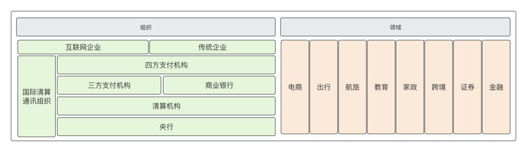 那么,不同的公司和不同的领域的加入,意味着个性化进来了,公司带来的企业的意志、组织、战略,不同领域带来了这个行业的交易特点和支付监管政策。