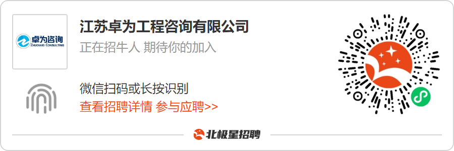 北极星工程招聘:江苏卓为工程咨询有限公司创办于2011年6月,注册资金1000万元。目前,公司拥有市政公用工程、石油化工工程监理甲级资质,房屋建筑、电力工程监理资质,造价咨询资质,是ISO9001质量管理体系标准、ISO14001环境管理体系标准、ISO45001职业健康安全管理体系标准三标一体企业。公司系中国建设监理协会、江苏省建设监理与招投标协会常务理事单位、南京市建设监理协会会员单位、佛山市建设监理协会会员单位。 公司目前已发展成为集燃气、水务、分布式能源、石油化工、光伏、房建、环保等技术咨询、招标代理、工程监理、项目管理、造价审计服务于一体的全过程工程咨询服务型企业。公司先后服务了港华燃气、华衍水务、港华能源、佛燃能源、深圳燃气、华润燃气、昆仑燃气及中石油、中石化等企业。伴随着众多工程项目的相继建成,公司品牌价值和企业效益同步提升,公司先后获得了诸多荣誉。并于2020年成功入选“江苏省高新技术企业培育库企业”。 公司秉承“因卓越、有作为”的企业文化,通过荟萃卓越的专业人才,凭籍卓越的业务流程,创造卓越的工作绩效。公司视人才为公司发展之根本财富,坚持“吸引人才、发展人才、保留人才”之人才战略和“自我学习,终身学习,重视培训价值”之培训文化,汇集了高水平的专业人才350余人。 公司依托港华集团卓越的管理团队及业务流程,通过自我创新和整合,形成了一整套完整、规范、科学的监理工作制度,为项目建设全过程管理提供解决方案。 保存下方图片