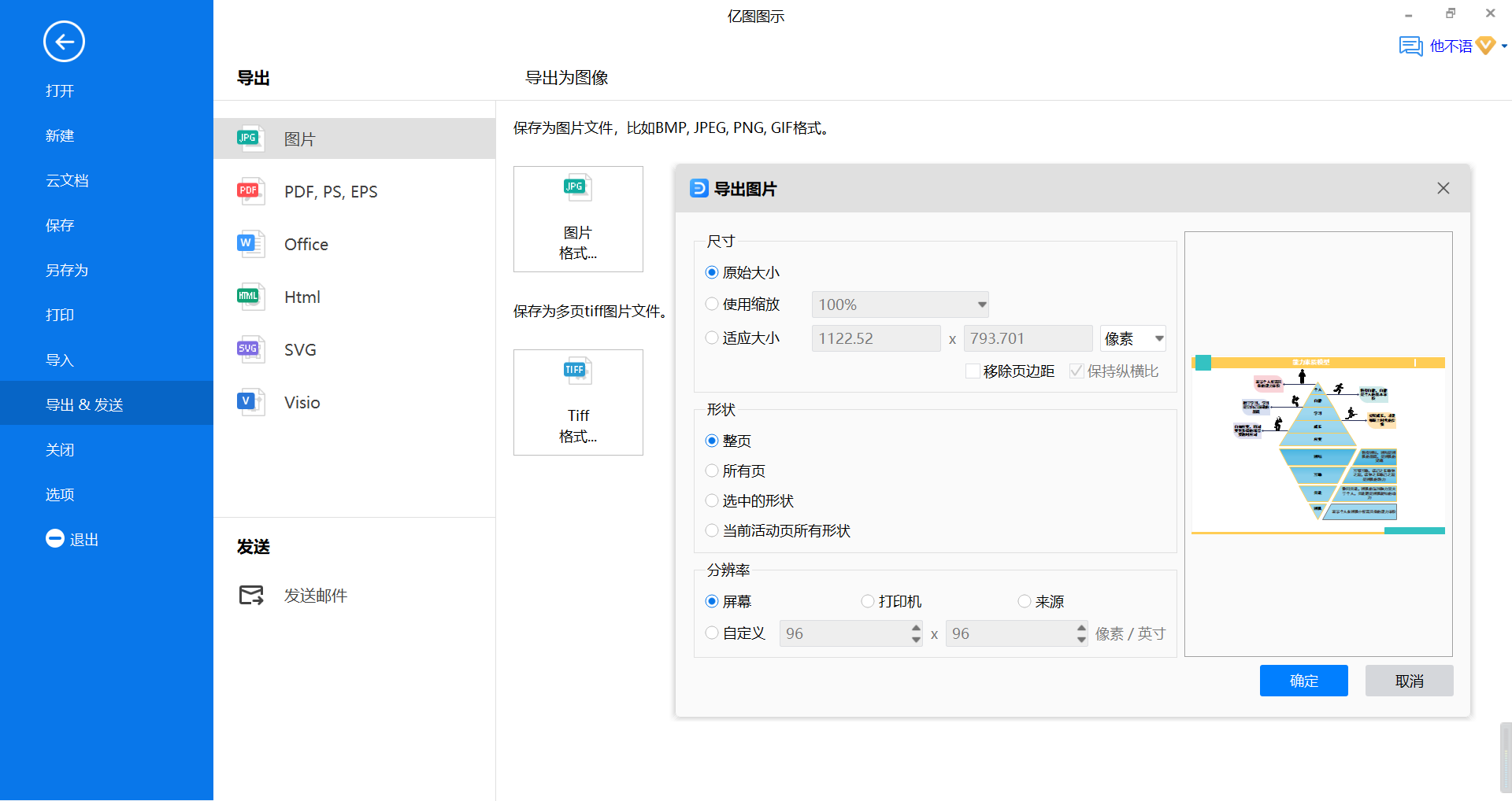 能将图表一键转为Word、Excel、PDF、SVG、PNG、PowerPoint等格式,并且亿图支持Visio格式批量导入和导出。