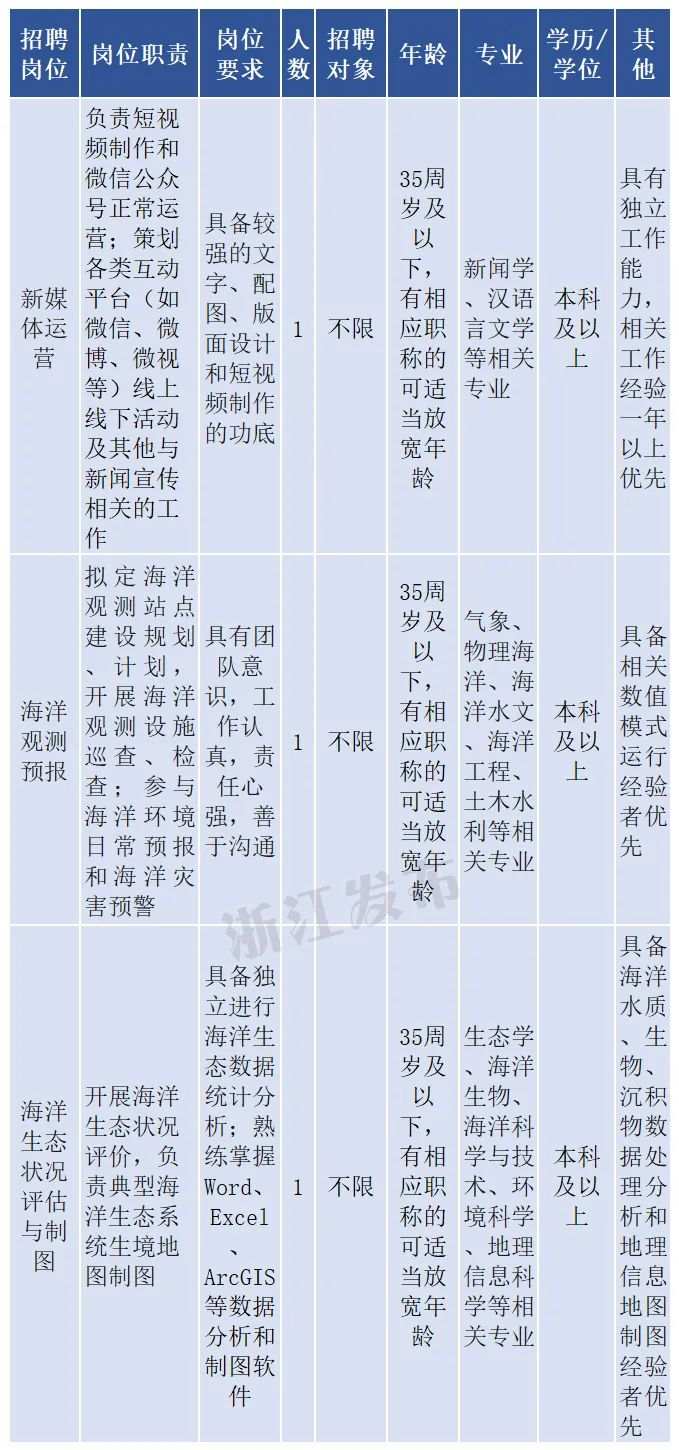 浙江发布 近日,浙江陆续发布了一批事业单位招聘公告。具体有哪些岗位?怎么报名?想要找工作的小伙伴看过来~ 浙江中医药大学附属第三医院 浙江中医药大学附属第三医院(浙江省中山医院)为三级甲等中医医院,公益二类事业单位。医院设三个院区,分别位于杭州市西湖区、上城区与滨江区。 招聘岗位 本次公开招聘28个岗位共40人,其中医药技人员30人、护理人员10人。 报名方式 自公告之日起至2022年2月25日16时,登录浙江中医药大学附属第三医院网站公开招聘考试报名系统(),注册个人真实信息后,选择岗位进行报名。 咨询电话 浙江中医药大学附属第三医院(浙江省中山医院)人力资源部:。 温州医科大学附属第二医院 温州医科大学附属第二医院是浙江省省属三级甲等综合性医院,温州医科大学下属公益二类事业单位。单位位于浙江省温州市。 招聘岗位 本次公开招聘74个岗位112名工作人员。 招聘岗位经本次限时集中报名、组织遴选并确定拟聘人员后,其中尚有空缺的专业技术岗位,纳入浙江省省属事业单位特殊专业技术岗位招聘目录,在本年度内继续招聘。 报名方式 应聘人员应于本公告发布之日起至2022年2月25日中午12点登录报名系统平台()进行报名。已在“2022年预报名”时投递简历的应聘者,请根据正式招聘计划登录网络报名系统重新报名。逾期不接受报名。 咨询电话 组织人事处陈老师:。 温州医科大学附属第一医院 温州医科大学附属第一医院为温州医科大学下属公益二类事业单位。该医院已于2022年1月28日对外公开发布《温州医科大学附属第一医院公开招聘人员公告(2022年第一批)》,报名截止日期为2022年2月14日。根据报名和资格初审情况,其中采购处(C08-22-20)、护理(C08-22-13)2个岗位通过资格初审的报名人数不符合招聘公告明确的最低开考比例要求。鉴于实际工作需要,经重新备案,现将所涉2个岗位的报名时间延长至2022年2月20日下午4点。 招聘岗位 英语水平要求:硕士研究生要求大学英语六级425分及以上,或雅思平均6.5分及以上,或新托福90分及以上,其中高级职称人员对英语等级不做要求;本科毕业生要求大学英语四级425分及以上。 报名方式 报名采用网络报名系统平台形式(),自招聘信息发布之日起至2022年2月20日下午4点,登录系统填写简历,投递志愿,不接受其他方式报名,已在“2022年预报名岗位”中投递简历的应聘者,请根据本次招聘通知登录网络报名系统平台进行正式报名。 咨询电话 郑老师、张老师:、55578523。 浙江省海洋监测预报中心 浙江省海洋监测预报中心是浙江省自然资源厅直属正处级公益一类事业单位。 招聘岗位 本次招聘为3个岗位共3名编外工作人员。 报名方式 自公告公布之日起至2022年2月25日17:30止,填写《浙江省海洋监测预报中心公开招聘报名表》,并将学历学位证书、职称证书、相关业绩证明等以PDF形式发送至962569691@,邮件标题按照“招聘岗位+姓名”格式发送。 咨询电话 寿老师:。 (原标题《看过来!浙江又一波事业单位正在招聘》。)