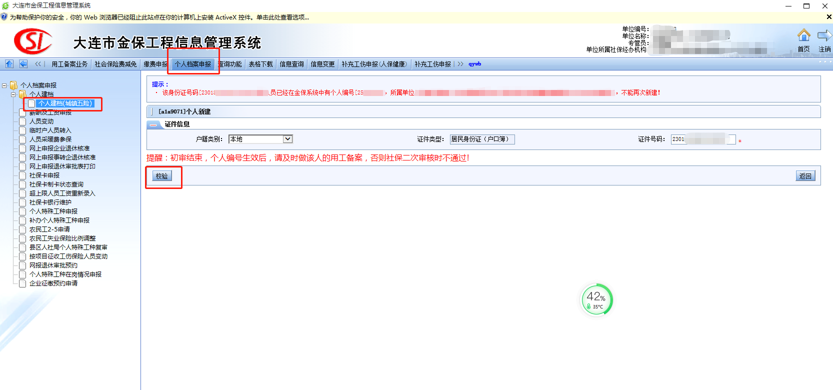 声明一下:由于文章篇幅原因,社保君无法全文发出。有需要的小伙伴可以私信社保君,获取完整操作教程。 由于最近系统变更,将社会保险(以下简称社保)的养老保险放到辽宁人力资源社会保障公共服务平台(以下简称省系统),其他四险还是在大连金保工程管理系统(以下简称金保系统),导致现在社保有两个系统,很多小伙伴开始蒙圈啦。下面社保君给大家梳理下相关操作的干货~~ 一、系统登录 1、金保系统:,用企业之前的7位编号和密码登录即可。 2、省系统:首先需要在辽宁省政务网,然后登录省系统 如果企业已经注册过,会显示企业已经注册,那么找回密码即可。 用户身份:选择统一社会信用代码、法人,输入信用代码就会显示当时是哪个手机号接收验证码,如果手机可以正常接收验证码,修改密码即可;如果手机不能接收验证码,那就修改手机号,界面的下面会有具体流程。 二、新入职员工转入操作(含新建户) 转入顺序:金保系统和省系统没有先后的操作要求,只要两个系统都操作完成后,等待后台审核即可。具体操作: 1、金保系统 首先,查询下这个人的社保状态和社保编号。 路径:个人档案申报→个人建档→个人建档(城镇五险)→会显示这个人是否缴纳过社保和社保状态。 文章实在太长了。。。