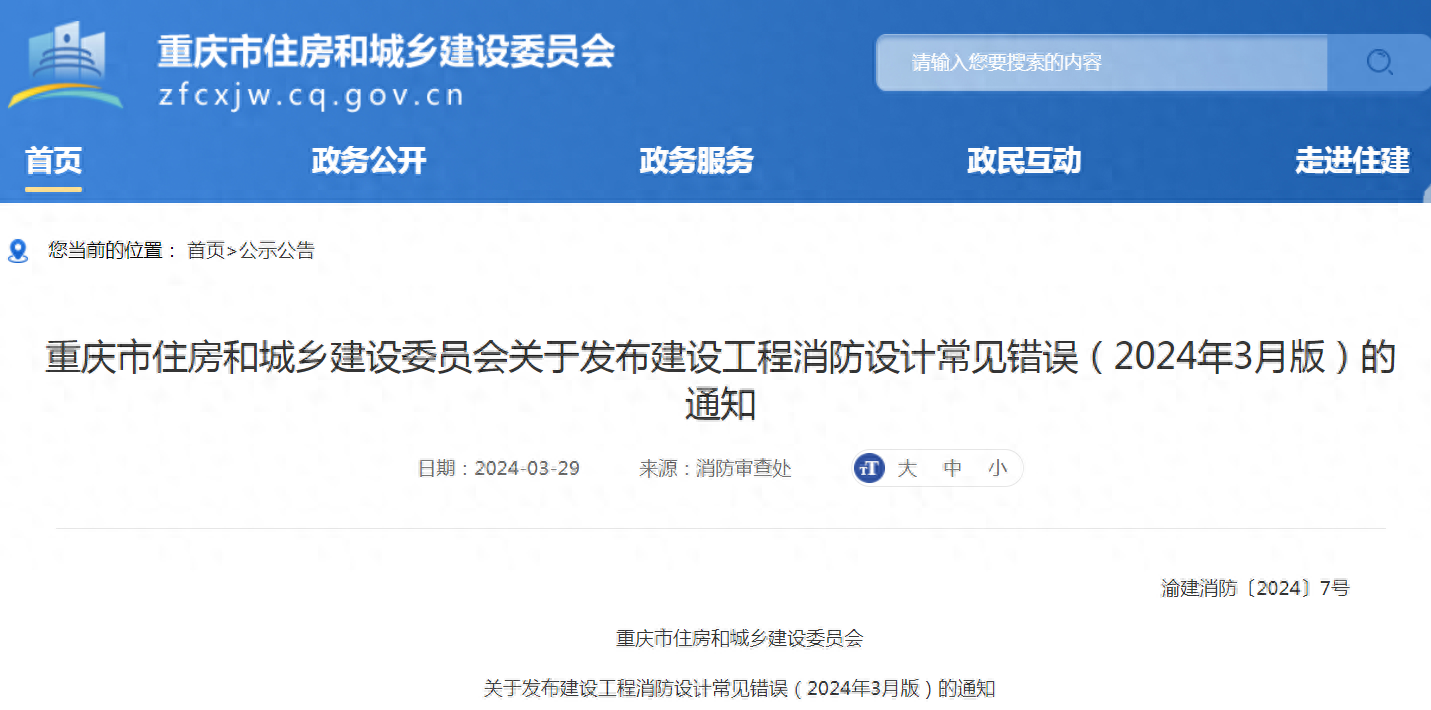 各区县(自治县)住房城乡建委,两江新区、重庆高新区建设局,万盛经开区住房城乡建设局、双桥经开区建设局、经开区生态环境建管局,各有关单位: 为进一步加强我市建设工程消防设计管理,提升消防设计质量,确保建设工程消防安全,我委结合近年来全市消防设计审查项目中发现的一些易错问题,组织相关单位进行归纳整理,编制了建设工程消防设计常见错误,并建立了消防设计常见错误定期发布机制,现将2024年3月版本进行公布。 请各单位认真学习,避免出现类似错误,共同提高我市建设工程消防设计的整体水平。 新颁布的国家工程建设消防技术标准有新规定的,从其规定。 附件:建设工程消防设计常见错误 重庆市住房和城乡建设委员会 2024年3月26日 附件下载: 建设工程消防设计常见错误.docx