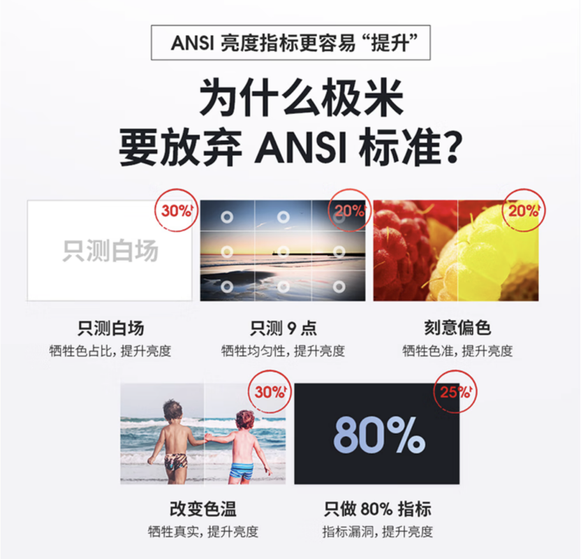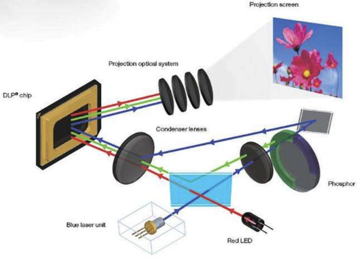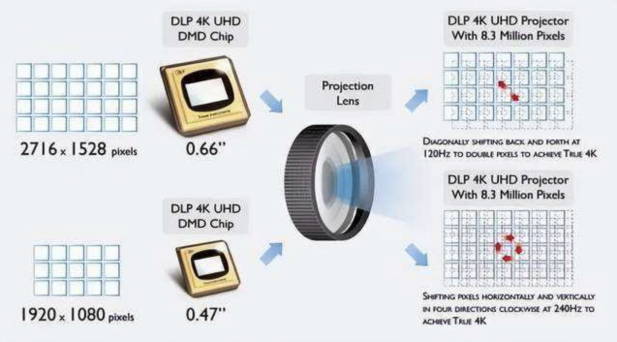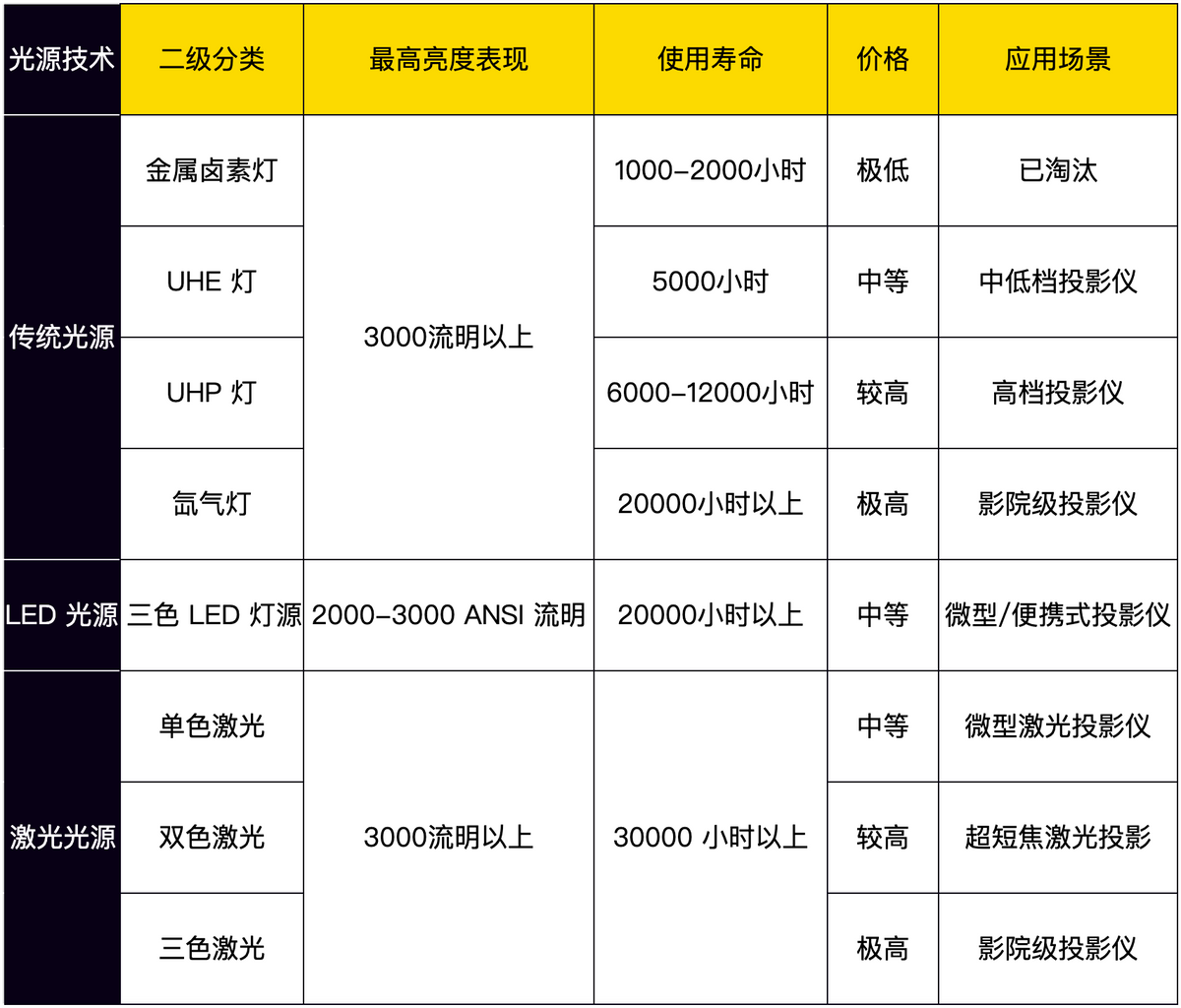 作为一名略懂投影的博主,经常会收到私信,询问投影仪购买的相关事宜。我发现相比于手机、电脑这些参数指标耳熟能详,人云亦云的快销产品。投影仪的各项技术原理、性能指标大家都还不甚了了,能知道一个分辨率和亮度都已经算是入门了,要是能分清楚DLP和LCD技术绝对算是“资深玩家”了。今天我们就先来聊聊投影的成像技术及光源。 一、投影仪该怎么选?我们先来聊聊成像技术及光源 (一)投影仪的成像技术:单片LCD、3LCD、DLP 投影仪的成像原理也是类似的,就是通过强光源照射在图像的显示原件上面,透过镜头投射到幕布上,主要利用的是光的折射和散射。当代的数字投影就把老师的幻灯片换成了显像的DMD芯片orLCD液晶面板。 目前主流的成像技术有三大类:单LCD、3LCD、单DLP,我们常见的LED微投往往采用了单DLP技术,而且传统灯泡投影机则多见于3LCD技术,而单LCD往往就是那些定价低廉,聚集在千元以内的入门级产品。 ❶【单LCD技术】 单片LCD面板技术,其成像原理是利用光源投射到单片LCD液晶上,通过液晶独立控制每个像素中的红绿蓝各个部分的明暗,经过合成得到彩色的图像。 ❷【3LCD技术】 3LCD是3liquidcrystaldisplay的简称,即投影机核心成像部分包含分光镜和三片独立的LCD面板。分光镜把光源发出的白色光拆分成红、绿、蓝三原色,在借由三块液晶面板分别显示一种颜色。每一片液晶面板上均拥有百万个晶体,通过配置开闭以及半开半闭的晶体状态来透过光线,让像素点显色。最后通过棱镜组合红绿蓝三原色就能够籍此呈现特定画面。 ❸【DLP技术】 DLP则是DigitalLightProcessing(数字光线处理)的缩写,早期的DLP的成像原理是白色光源透过红、绿、蓝色轮轮流打到DMD芯片上。由于色轮是旋转显色的,因此每种颜色的呈现需要一定的时间,转速够快就足以利用人眼的视觉残留现象呈现彩色画面。 因为单DLP技术存在的问题,所以又衍生出了3DLP的方案,用上了三块DMD芯片,结构更加复杂,成本也是数量级的增长,售价在几十万到上百万不等,这就不是我们所要覆盖的消费级产品了。而另一种改良的技术路线就是从光源着手,将白色光源改为三色LED光源,不再需要色轮的介入,直接规避了色轮所带来的问题。 ❹【总结一下】 「LCD技术」:优点是成本低,光机小,由于原理简单加上LCD屏幕廉价可得,很多人自己都能DIY。劣势就是成像质量比较差,色彩不够鲜艳,开灯观影效果差,常见于数百到千元级的入门投影,目前极不推荐考虑。 「3LCD技术」:优势是以在同一时间显示红、绿、蓝三种颜色,即色彩亮度=白色亮度,也能实现100%色占比,色彩亮度更高。缺点是模组构成较为复杂,产品体积较大较重,对散热设计和成本要求更高,开放式设计有进灰风险,常见于灯泡投影机。 「单DLP技术」:优势在于画面对比度更高,像素排列紧密,同时机身尺寸可以做到更小,成本更低,且使用寿命更长。常见于LED微投和激光投影。缺点就是同一时间仅能显示一种颜色的,会存在一定的光能损失,拍照录像会发现有彩虹纹和频闪问题,但人眼普遍发现不了。目前已经拥有3DLP技术可以规避此类缺点,但价格仍然较高,需要逐步推广。此外在极米为代表的三色LED投影身上,取消了色轮组件,所以也规避了以上缺点。 IDC中国发布的《2022年第二季度中国投影机市场跟踪报告》显示:目前头部的5家投影机品牌有4家DLP技术+1家3LCD,这也从侧面说明LCD技术的低端品牌十分分散,而DLP和3LCD技术的品牌更加聚焦。 (二)投影仪的光源:传统光源、LED、激光光源 投影的画面亮度的色彩,不仅由成像技术决定,也会被光源所影响。 市面上在售的投影仪光源,可以分为传统光源、LED光源和激光光源,三者各有优势,也存在缺憾。 ❶【传统光源】 传统光源是最为常见的一种投影仪光源,伴随着灯泡百年发展历史,目前技术已经非常成熟。比如大家经常在教室里、会议室里看到的灯泡投影仪广泛采用这项技术。目前传统光源主要可以分为金属卤素灯、UHP和UHE(超高压汞灯泡)、氙气灯等高压气体放电光源。 「金属卤素灯」:金属卤素灯属于最低端的传统灯源技术,虽然灯泡成本较低,但使用寿命往往只有1000-2000小时不等。同时长期使用亮度会出现衰减,会使图像变暗变黄,如果频繁更换灯泡,使用成本也会攀升,目前已经告别主流光源。 「UHE灯和UHP灯」:UHE灯和UHP灯同属于超高压汞灯,它们都具有亮度高、衰减低,性能稳定的特性。不过UHE的成本较低,寿命适中(5000小时),多用于中低档投影仪。而UHP的亮度更高,寿命持久(6000-12000小时),但成本也相应增加,主要面向高档投影仪。 「氙气灯」:氙气灯是经过高压震幅激发石英管内的氙气电子游离,在两电极之间产生光源,产生的光芒类似于白色太阳光,光线色温值提高了很多。它工作时仅需3.5A电流量,亮度是传统灯泡的三倍,使用寿命更是长了十倍。因为定价高昂,往往只会用于高端影院。 ❷【LED光源】 目前市面上家用投影所采用的LED光源与我们生活中常见的LED照明灯泡有很大区别,投影使用的是定制的高功率LED光源,而且通常是由红绿蓝三种不同颜色的LED光源共同构成投影光源,成本较常见的LED照明灯泡高出几十倍都不止,主要供应商有欧司朗,OSRAMOSTAR®ProjectionPower系列就是专门用于投影当中使用的。 由于LED光源的家用投影采用的是原生的红绿蓝三色LED进行的混色,所以理论上是可以轻松覆盖sR