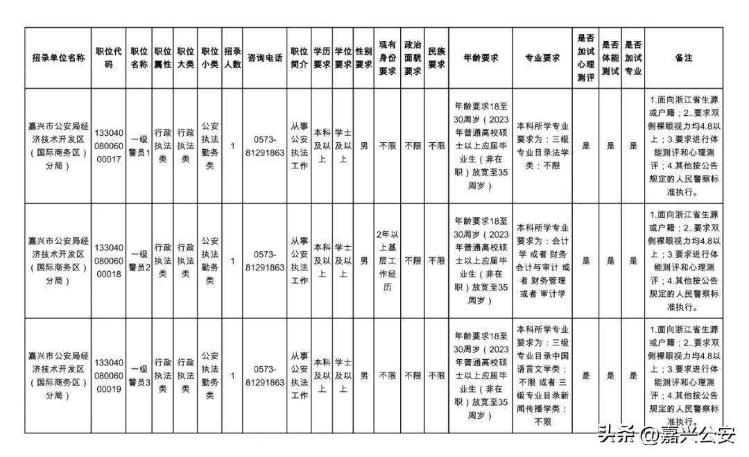 如果你怀揣梦想、不甘平庸 如果你一腔热血、正义爆棚 如果你心怀警察梦 想跟他们一样 身着警装守护一方 赶快加入我们吧! 嘉兴市公安局经济技术开发区 (国际商务区)分局招聘3人 岗位表如下 一、报名及考试时间 报名、资格初审和缴费通过网络方式进行。报名网址:浙江省公务员考试录用网() 报名时间:2022年11月11日9时—11月15日17时 资格初审时间:2022年11月11日9时—11月17日17时 公共科目笔试时间为:2022年12月17日 上午:9:00—11:00《行政职业能力测验》(C卷) 下午:14:00—16:30《申论》(C卷) 二、招考的范围、对象、条件和程序 请查询下列网站详细了解: 浙江组织工作网() 长三角公务员考录一体化平台网站() 浙江省公务员考试录用网() 浙江人事考试网() 嘉兴考试培训网() 三、招募热线 嘉兴市公安局经济技术开发区(国际商务区)分局咨询电话: