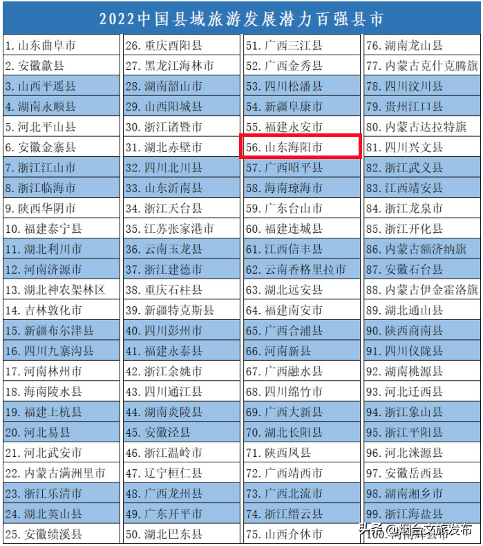 ●2012年第三届亚洲沙滩运动会举办城市 ●中国优秀旅游城市 ●首批17个国家级旅游度假区之一 ●中国毛衫名城 ●中国民间文化艺术之乡 ●转型2010中国经济十大领军(县级)城市 ●2012中国十大休闲小城 ●2013年“美丽中国”十佳旅游县(区) ●最佳滨海旅游度假目的地 ●国家级节水城市 ●国家沙滩体育健身基地 ●中国避暑休闲十佳县 ●中国最美休闲度假旅游目的地 ●国际奥委会体育与可持续发展奖 ………… 这里,是海阳。 日前,竞争力智库,北京中新城市规划设计研究院等机构,联合发布《中国县域旅游竞争力报告2022》,同时揭晓了以下名单,2022(第五届)中国县域旅游,综合竞争力百强县市,2022(第五届)中国县域旅游,发展潜力百强县市,海阳榜上有名!!! 仙境海岸·魅力海阳 海阳冬无严寒,夏无酷暑,天然的海、山、湖、河、松林、湿地公园等资源,让海阳成为投资、度假、避暑、养生、养老的国家级旅游城市。 1亚洲金滩 海阳万米海滩浴场坐落在旅游度假区,海阳属于暖温带东亚湿润季风型大陆气候,冬无严寒、夏无酷暑,气候宜人,年平均气温12摄氏度,海水浴场有长10000多米,宽150米的海滩,被誉为“国内少有”,是理想的天然海水浴场。 孔子曰“智者乐水,仁者乐山”,后有林则徐的“海纳百川,有容乃大”,更有海子的“面朝大海,春暖花开”……阳光、沙滩、大海,无一不令人神往,海阳旅游度假区就有这么一片令人神往的海,但海阳旅游度假区的美更在于它的文化底蕴及蓬勃气息。在这里既可以躺在沙滩上,聆听美丽传说,沐浴和煦阳光;又可以徜徉于大海中,细数朵朵浪花,纵情海上运动。 2鲜美海阳 海阳红富士 海阳白黄瓜 海阳大小樱桃 海阳绿茶 海阳大饽饽 海阳摔面 海阳网纹瓜 3旅游胜地 招虎山国家森林公园 招虎山属崂山山系,园内地势复杂,山体挺拔俊秀,山谷狭窄幽深,植被茂密,瀑布众多,展现出胶东地区的独特风貌。山体岩石为燕山运动的二长花岗岩和正长岩。土壤主要为棕壤性土和棕壤。植被覆盖率达到92%,四季林相变幻奇特,色彩各异。 丛麻禅院 佛教文化、竹林文化、丝绸文化、山水文化,融为一体的田园慢生活 海阳琵琶岛影视基地 位于山东省海阳市留格庄镇桃源村琵琶岛区域,是集影视拍摄、影视旅游、红色旅游、爱国教育、写生拍客、度假、休闲、观光为一体的大型综合性旅游区,基地以其厚重的文化底蕴和独特的历史场景而受到众多影视剧和游客的追捧。 4文化特色 海阳大秧歌 海阳大秧歌是一种古老的传统民间舞蹈,属于山东三大秧歌之一,是民间社火中的舞蹈部分,流行于山东半岛南翼、黄海之滨的海阳市一带。海阳秧歌据《海阳县志》记载有560年的历史,它以粗犷奔放、热烈欢快,质朴坦率,风趣幽默的表演风格著称于世。 海阳大秧歌是一种集歌、舞、戏于一体的民间艺术形式,它遍布海阳的十余处乡镇,并辐射至周边地区。海阳大秧歌历史悠久,源远流长,有着广泛的群众性和多种民间技艺的综合表演,是一种自娱性艺术形式,至今仍保留有秧歌队传统拜年形式,还有新元广场秧歌汇演,正月十三祭海等大型活动。