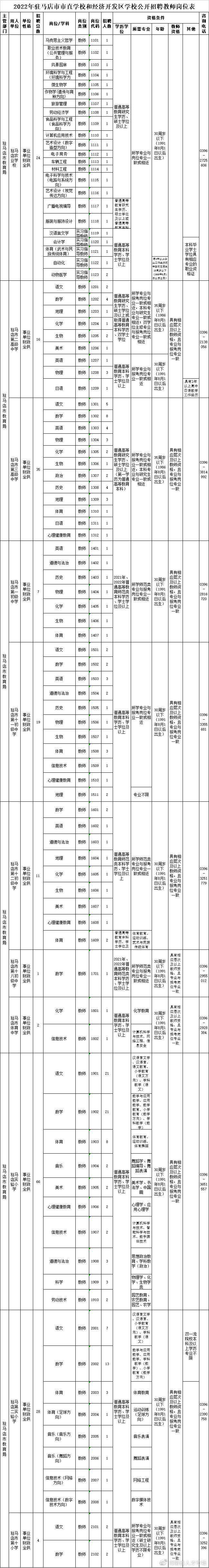 一、招聘计划和岗位 2022年驻马店市市直和经济开发区34所学校面向社会公开招聘403名教师。分别为: 驻马店市市直13所学校公开招聘教师248名,其中:驻马店农业学校24名、驻马店市第二高级中学16名、驻马店市第三高级中学35名、驻马店市第一初级中学7名、驻马店市第十一初级中学19名、驻马店市第十二初级中学11名、驻马店市第十八初级中学1名、驻马店市体育中学2名、驻马店实验小学66名、驻马店第二实验小学28名、驻马店市第十小学4名、驻马店市第三十二小学30名、驻马店市实验幼儿园5名(实行员额制编制管理)。 驻马店经济开发区21所学校公开招聘招聘教师155名。其中:驻马店市第十九初级中学5名、驻马店市第二十一初级中学14名、驻马店市第二十二初级中学17名、驻马店市第二十三小学16名、驻马店市第二十四小学3名、驻马店市第二十五小学2名、驻马店市第二十七小学7名、驻马店市第二十八小学1名、驻马店市第三十三小学8名、驻马店市第三十七小学12名、驻马店市第三十八小学5名、驻马店市第五十一小学6名、驻马店市开发区实验小学33名、驻马店经济开发区关王庙乡中心小学2名、驻马店经济开发区关王庙乡大魏庄学校1名、驻马店经济开发区关王庙乡余庄回族小学1名、驻马店经济开发区关王庙乡张楼学校1名、驻马店经济开发区关王庙乡洪堂小学1名、驻马店市第二实验幼儿园17名(实行员额制编制管理)、驻马店经济开发区关王庙乡洪堂小学附属幼儿园1名(实行员额制编制管理)、驻马店经济开发区南魏庄幼儿园2名(实行员额制编制管理)。 具体招聘计划详见《2022年驻马店市市直学校和经济开发区学校公开招聘教师岗位表》(附件)。 二、招聘的资格条件 (一)具备下列资格条件的人员可以报考: 1.具有中华人民共和国国籍; 2.遵守宪法和法律; 3.具有良好的品行; 4.具有招聘岗位要求的学历学位条件,同时具备岗位要求的专业或技能条件; 5.符合岗位要求的年龄条件(30周岁以下为1991年8月1日以后出生,其他年龄依此类推); 6.适应岗位要求的身体条件; 7.招聘岗位要求的其他资格条件; 8.教师资格证条件:对于在2021年及2022年中小学(含幼儿园、中等职业学校)教师资格考试中受疫情影响考生(2021年及2022年中小学教师资格考试(NTCE)笔试成绩单或面试成绩单“受到疫情影响”栏标注为“是”),可以参加教师招聘,通过教师招聘的可以先上岗从事辅助性教育教学工作,再参加考试并取得教师资格。受疫情影响的高校毕业生,不将取得上述教师资格作为限制性条件。高校毕业生参加公开招聘被聘用从事教育教学相关工作的,按规定订立聘用合同约定1年试用期,试用期内未取得相应教师资格的,依法解除聘用合同。 (二)有下列情况之一的不得报考: 1.刑事处罚期限未满或者涉嫌犯罪正在接受调查的人员; 2.尚未解除党纪、政纪处分或正在接受纪律审查的人员; 3.五年内曾在公务员招录、事业单位公开招聘考试中被认定有舞弊行为等严重违反招聘纪律行为的人员; 4.驻马店市教育局直属单位在编在岗人员不得报考市直学校教师;驻马店经济开发区教育体育文化局直属单位在编在岗人员不得报考驻马店经济开发区学校教师; 5.国家和省另有规定不得应聘到事业单位的人员。 三、招聘工作程序 (一)发布招聘信息 (二)报名与资格审查 本次招聘采取网上报名的方式进行。 1.网上报名 (1)填写并提交报名信息,上传照片。报考者于2022年8月2日9:00至8月4日18:00期间登录驻马店市人力资源和社会保障局网站()或驻马店人才信息网(),进入“网上报名”系统,按要求提交个人报名信息并上传本人电子照片(要求:①单色背景,正面、免冠近期证件照;②电子版;③格式JPG;④文件大小30KB以下;⑤照片大小宽约114像素,高约156像素;⑥必须能反映本人特征,否则将无法通过审查)。报名资料提交被接受后,将自动生成一个报名序号。报名序号是报考者查询报考资格审核结果、网上缴费、下载打印准考证和成绩查询等事项的重要依据,必须妥善保管。 (2)报考资格审核。按照“谁审核、谁负责”的原则,用人单位在报考者提交报名申请后及时对报考者的报名申请和照片进行网上初审,并提出初审意见。报名申请被接受的人员,可于提交报名申请2小时后登录原报名网站,查看是否通过报考资格审核。通过报考资格审核的人员,不能再报考其他岗位;报考资料不全或电子照片不符合要求的,报考者应及时补充或更换并按要求再次提交审查。 (3)网上缴费。通过报考资格审核的人员,于2022年8月2日10:00至8月5日18:00期间通过原报名网站“网上报名”系统,按照提示步骤缴纳考务费(报考者须准备银行卡,开通网上银行功能并存上足够缴费的金额)。根据省财政、物价部门批准的收费标准,报考者按每人每科30元缴纳考务费,本次招聘考试2科,计60元。未按期缴费的视为自动放弃。缴费完成后,考生须自行用A4纸打印《驻马店市事业单位公开招聘人员报名表》一式2份,以备面试资格确认时使用。 (4)网上打印准考证。网上缴费成功的报考人员,登录原报名网站,进入“网上报名”系统自行打印准考证(A4纸)。打印准考证时间在驻马店市人力资源和社会保障局网站()、驻马店市教育局网站()另行通知,笔试具体安排详见准考证。 请考生务必在规定的时间内报名、缴费、打印报名表和准考证。因错过时间,系