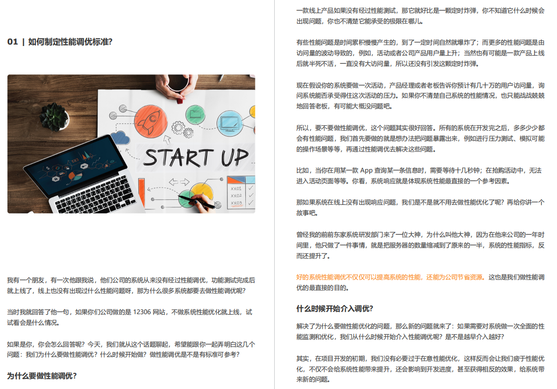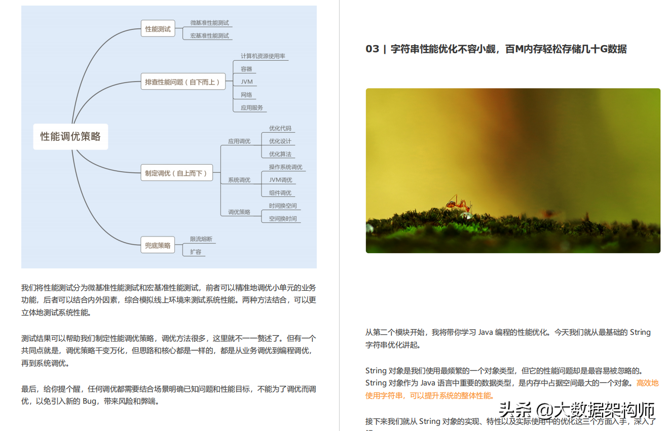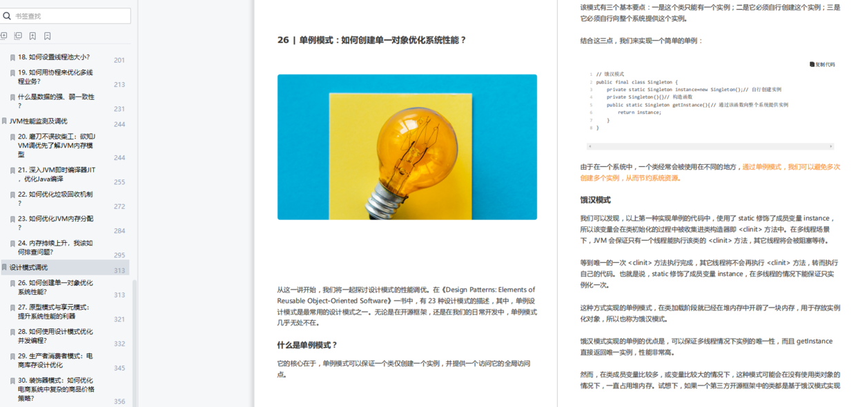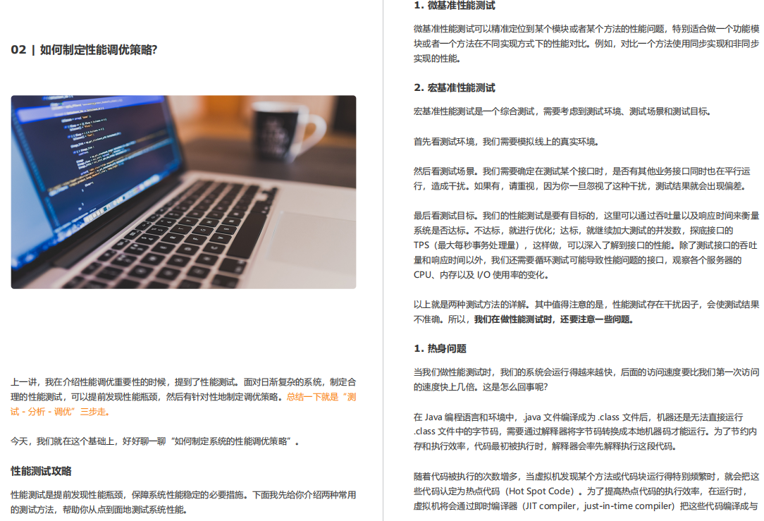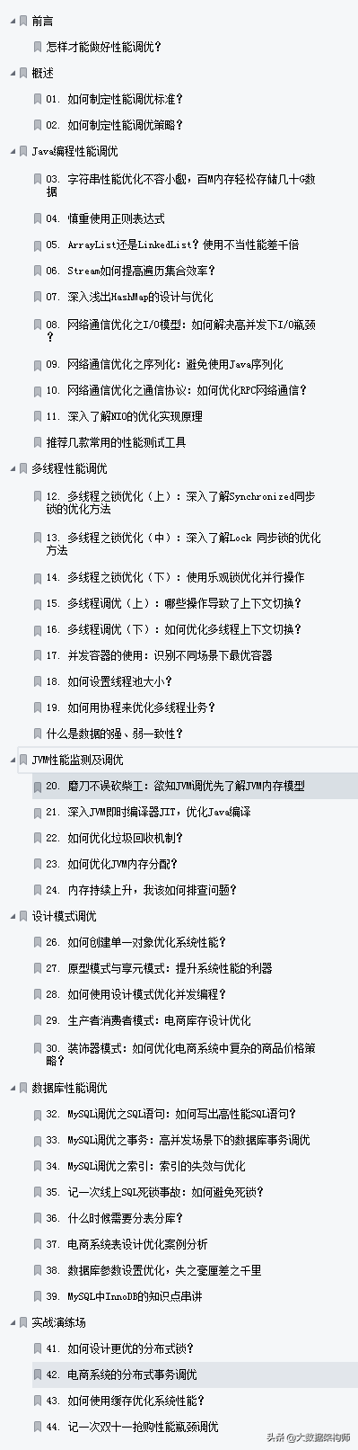 在我们敲代码,推动系统做更多事情的时候,我们遇到了一个共同的问题:性能。网站和应用程序的功能比以往更丰富。结果,他们对网络和设备资源的要求越来越高。因此,我们现在很难在各种网络条件和设备上实现高水平的性能。 开发出来的程序抗压好、流畅度高,那么用户也就喜爱,在公司中对于性能调优能力的考察是非常注重的,大厂中也把它作为评级中非常重要的一环; 今天给大家分享的就是在阿里巴巴内网疯传的一份《亿级流量调优方案+实战》手册分享给大家,由于文章篇幅有限无法展示全部,下面就以截图方式给大家观看,有需要完整版的朋友可以转发此文后私信小编关键字【666】凭截图免费获取; 只有理论+实战才是正确的学习方式; 作为一名技术人只有技术+实战才能真正的掌握这个知识点,如果仅仅把一个理论知识背的滚瓜烂熟,但是不去实践,那这个知识永远不是你的,只有把理论+实战相结合,这样才能够学得更深,才能够真正地掌握。