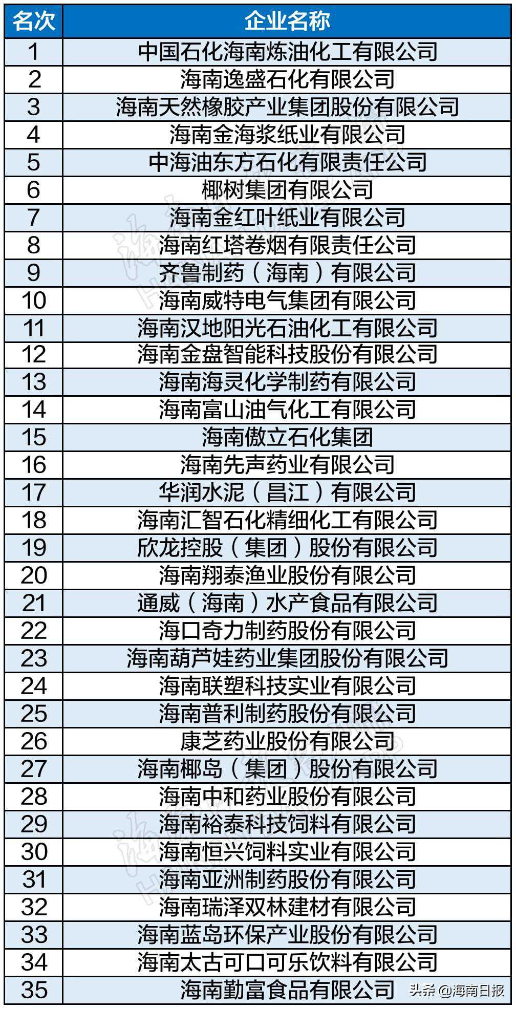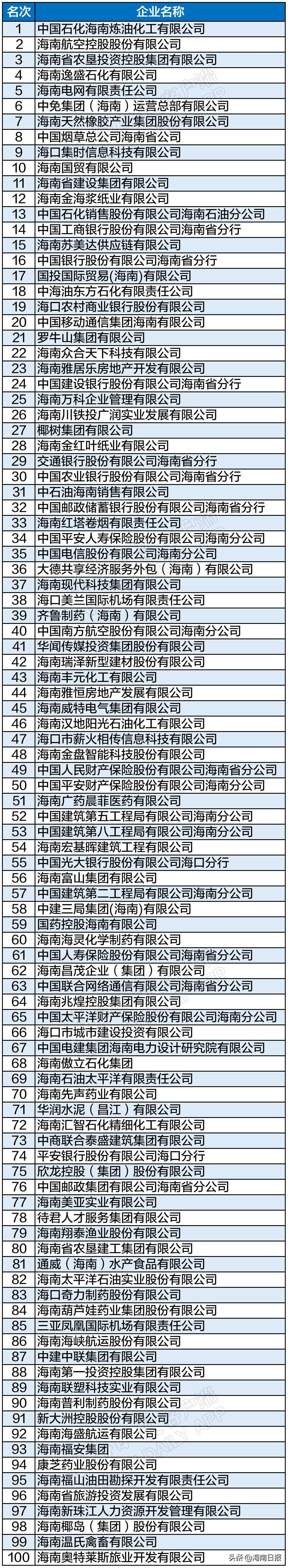 客户端丨记者周晓梦通讯员张晨曦 10月26日,海南省企业联合会、海南省企业家协会(以下简称“海南企联”)发布2021年海南省企业100强名单。这是海南企联连续16年向社会发布海南省企业100强、制造业企业35强、服务业企业50强排行榜,并同步推出海南省企业100强年度分析报告。 海南省企业联合会、海南省企业家协会举办2021年海南省企业100强名单发布会。记者周晓梦摄 榜单以海南省企业2020年营业收入为入围标准,排序得出2021海南省企业100强。其中,中国石化海南炼油化工有限公司蝉联榜单榜首,海南航空控股股份有限公司、海南省农垦投资控股集团有限公司位列第二、三名。 从2021海南省企业100强看,企业的规模、效益和贡献等都有了新的变化,特别是一大批新面孔企业上榜,一大批百强企业排名提升,展现了海南自贸港建设热火朝天的景象。 从入围门槛看,与今年世界500强入围门槛降低不同,2021海南省企业100强入围门槛为营业收入7.9亿元,比上一年度海南省企业100强入围门槛的7.88亿元增加0.02亿元。自我省2006年开展海南省企业100强排名以来,企业入围门槛连续16年保持增长势头。 从营业收入看,受新冠疫情影响,2020年,海南省企业100强实现营业收入达4541.8亿元,比上年减少5003.6亿,仅为上年的48%,这是2021海南省企业100强的最大变化。从企业盈利情况看,2021海南省企业100强企业中,共有80家企业实现利润正增长,数量与上年持平,利润总额达274亿元。 2021海南省企业100强的国际化特征方面,随着海南自贸港建设的推进,海南作为国际国内双循环“反应炉”的特征日益突显,企业的国际化步伐加快,拓展海外市场的积极性、主动性愈发强烈。从2021海南省企业100强榜单可以看出,百强企业中17家有海外收入,海外收入上亿元的有12家,其中中免集团(海南)运营总部有限公司以419亿元的海外收入名列榜首,新大洲控股股份有限公司、海南省农垦投资控股集团有限公司以143亿元和107亿元分别名列第二、三位。 在解读2021海南省百强企业排行榜单变化最大亮点时,海南企联常务会长兼秘书长冷明权提到,与2020海南省企业100强排行榜相比,虽然统计数字减少,但从2021海南省百强企业名单来看,有25家新企业上榜,成为2021海南省百强企业排行榜单变化最大的亮点。这25家企业中,有的是海南本土企业第一次上榜,有的是海南开展自贸港建设后新设立的企业。榜单的变化,也从一个侧面说明海南自贸港建设成效逐渐显现,众多企业紧抓自贸港建设机遇,不断拓展国际国内市场,在自贸港产业高质量发展上迈出了坚实步伐,同时也是海南百强企业的一次华丽转身。 全省企业代表300多人参加发布会。 附:2021海南省企业100强名单 2021海南省制造业企业35强名单 2021海南省服务业企业50强名单
