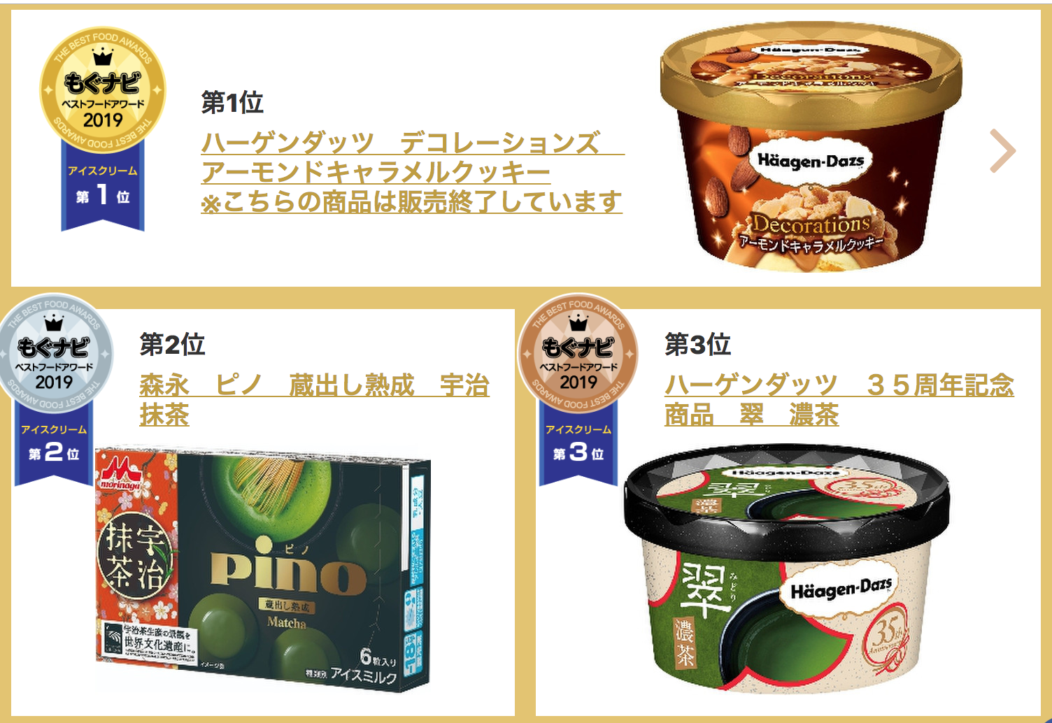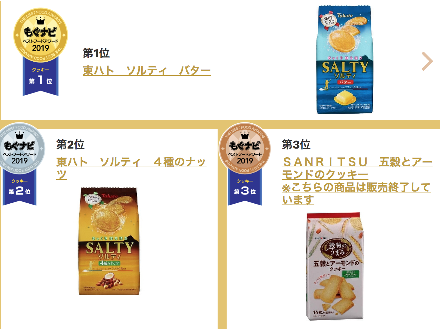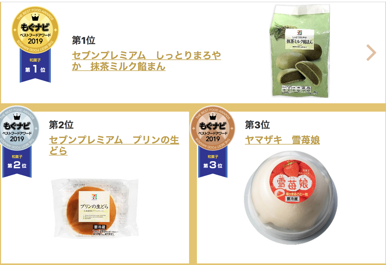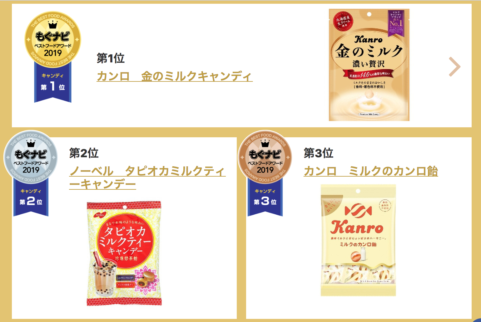日本最大的零食网站每天都会在年中和年末发布日本零食大赏榜单,根据网友的点评总结一下这一段时间内最受欢迎的人气零食。 先看一下TOP3选手。 但是根据mognavi的信息显示,该产品已停产,感到错过了好几个夏天…… TOP2 Tohato咸味黄油饼干 这个牌子的饼干有很多风味,而这款带一点咸味的黄油味饼干本次上榜了前三甲。柔软蓬松又温柔的黄油味,搭配上适度的咸味,更好地提出了黄油的甜味,让人停不下来。 TOP3 日清食品杯装方便面原味 淳朴的日清杯面一直是前三名霸主,在去年同期的榜单中也是前三名选手。 它相比一般的泡面味道更清淡,汤底也更浓厚。颁奖词里是这么说的:“永远不枯燥的杰作”。大概这就是零食界的百搭万能基本款吧。 除了综合大赏外,各种类零食部门赏也非常值得一看! 第1名kanro北海道香浓牛奶糖 第2名NOBEL珍珠奶茶糖 第3名KANRO牛奶糖 其中获得第一名的kanro北海道香浓牛奶糖是选用“牛奶最好喝”的北海道优质牛奶制成的,奶香浓郁回味无穷。是专为“大人”精心挑选食材,追求奢华感的高档牛奶糖。 第1名松尾黄豆粉年糕夹心巧克力 第2名森永朗姆酒葡萄夹心白巧克力 第3名KANRO 获得第一名的黄豆粉年糕夹心巧克力……等等,这是巧克力吗? 是的!由年糕和生巧克力组成了绝妙搭配!黄豆粉味的巧克力有着浓郁的豆香,软糯Q弹,难怪会勇夺巧克力榜单第一名。失敬了,年糕君。 布丁大赏 第1名OHAYO生乳皇家布丁 第2名OHAYO北海道浓郁芝士牛乳烤布丁 第3名MeitoMeito布丁 布丁榜单的前两名被OHAYO这个品牌霸榜,生乳皇家布丁和北海道浓郁芝士牛乳烤布丁听起来都非常诱人。 其中,获得第一名的生乳皇家布丁有两层式奶油布丁,含丰富的泽西岛牛奶,质地嫩滑香醇。 冰淇淋大赏 第1名哈根达斯杏仁焦糖饼干冰淇淋 第2名森永pino宇治抹茶冰淇淋 第3名哈根达斯MINICUP翠浓茶 饼干大赏 第1名Tohato咸味黄油饼干 第2名Tohato咸味坚果饼干 第3名SANRITSU五谷杏仁饼干 小吃大赏 第1名湖池屋干酪味薯条脆条 第2名湖池屋浓缩玉米味脆条 第3名calbee土豆沙拉薯条 杯面大赏 第1名日清食品杯装方便面原味 第2名日清食品杯装方便面咖喱风味 第3名日清食品杯装方便面海鲜风味 和果子大赏 第1名7-11抹茶牛奶馅馒头 第2名7-11布丁生铜锣烧 第3名山崎制雪莓娘草莓大福 咖啡大赏 第1名町村农场焦糖拿铁咖啡 第2名森永乳业咖啡拿铁焦糖风味 第3名森永乳业咖啡拿铁黑枫糖风味 红茶大赏 第1名麒麟午后红茶无蔗糖风味 第2名麒麟午后红茶名人系列奶茶 第3名CocaCola紅茶花伝浓厚皇家奶茶 碳酸饮料大赏 第1名麒麟METS超碳酸麝香葡萄味 第2名麒麟柠檬味汽水 第3名日本可口可乐0卡路里系列 酒精饮料部门 1位麒麟strong柠檬可乐无糖碳酸酒 2位三得利微醺橘子果酒 3位三得利微醺冰红茶风味 下次飞机一降落在日本,就冲着最近的便利店照着买一遍吧。暂时没有去往日本的出行计划的话,好消息是,这个榜单里有一些在国内也能买到的世界性零食。 感谢便利店,感谢可以认真吃喝的每一天哦。