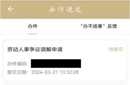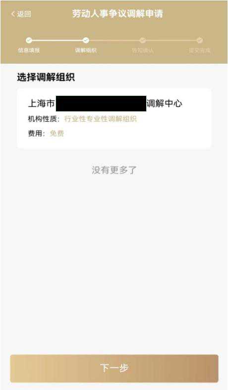 在线申请劳动人事争议调解→进行【信息填报】→选择【调解组织】→收到【告知确认】→最后【完成提交】